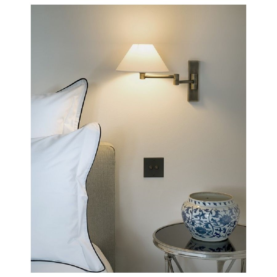 Wall light made in brass. Made with a double swing arm on a rectangular base. This classiacl wall light gives a nice light next to bed. Available in black or matt gold patina, and in nickel or brushed nickel. Presented lamp shade in white cotton chintz in a conical shape (see other available shapes and colours).