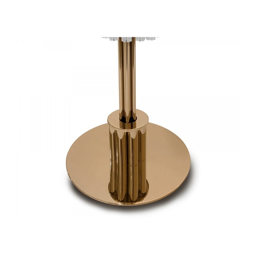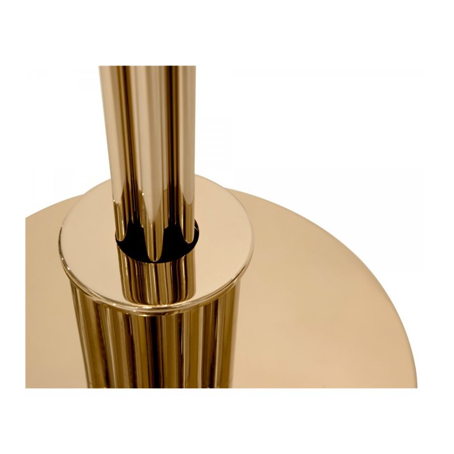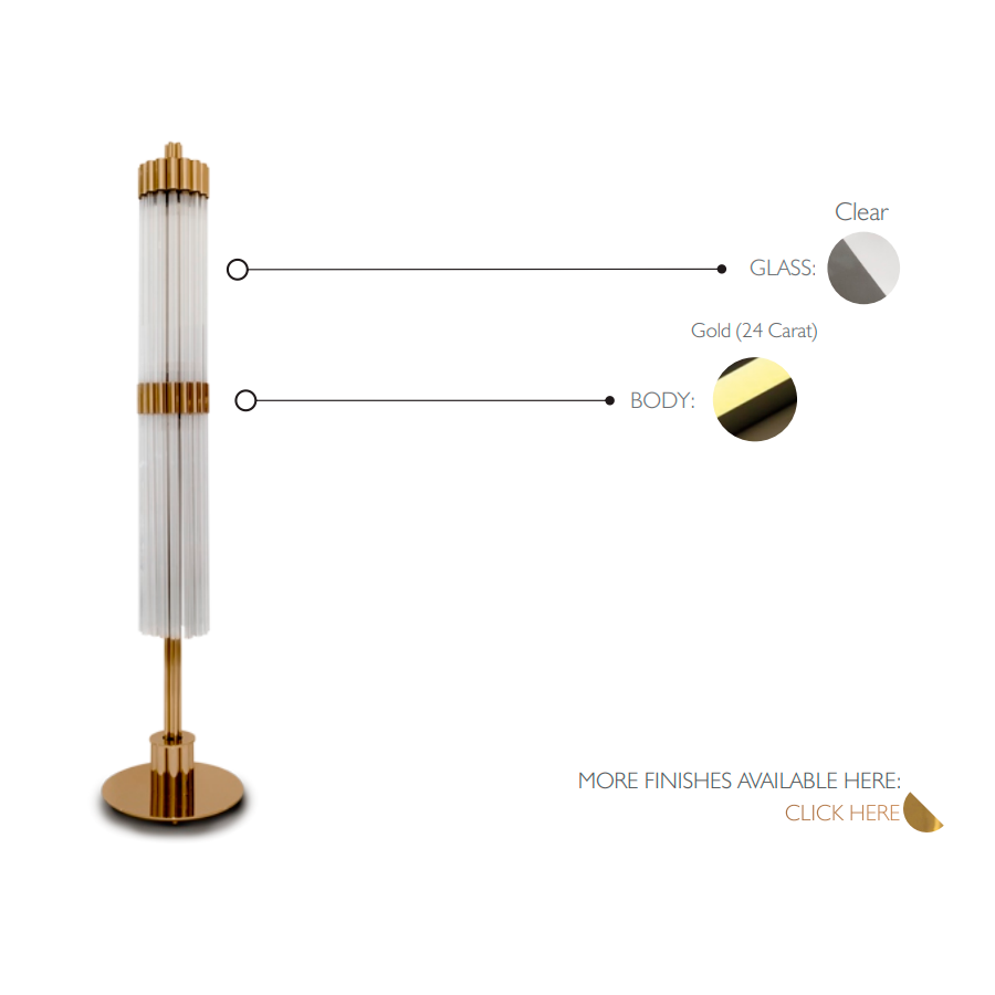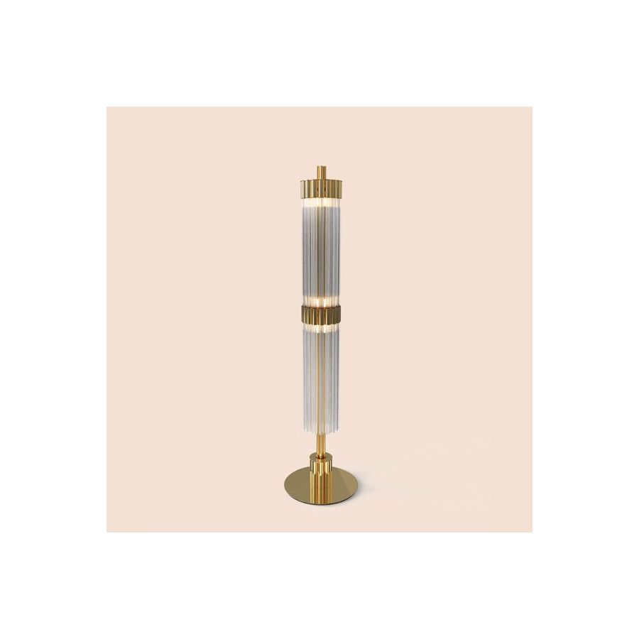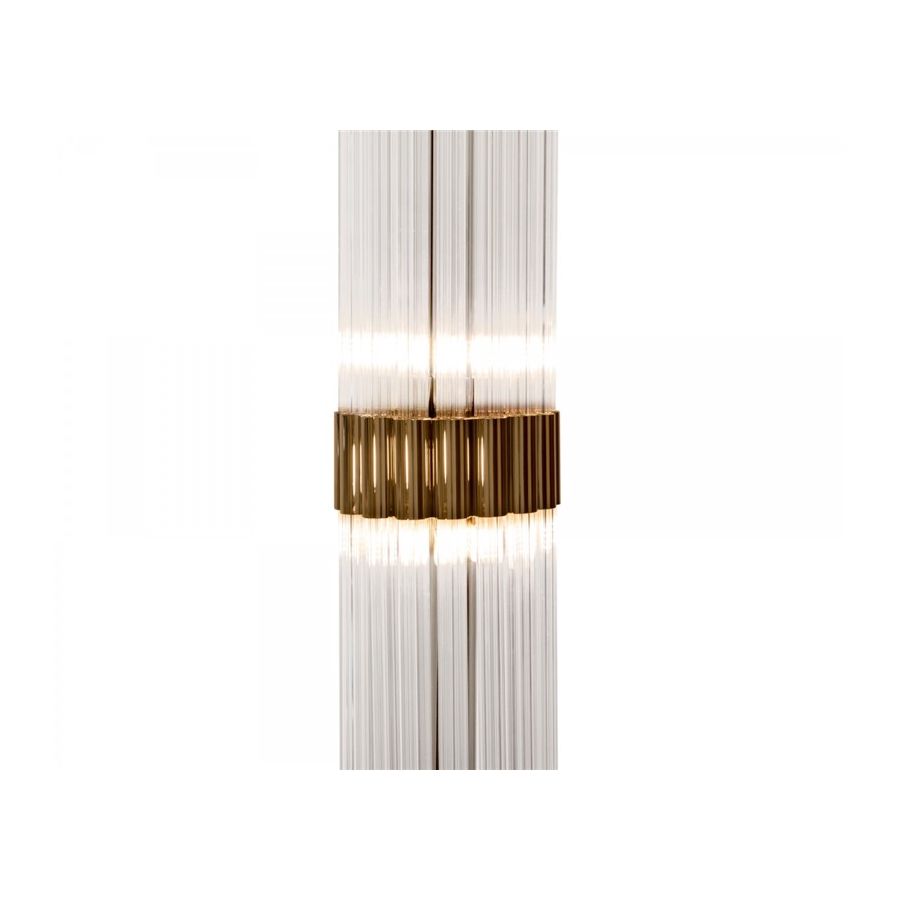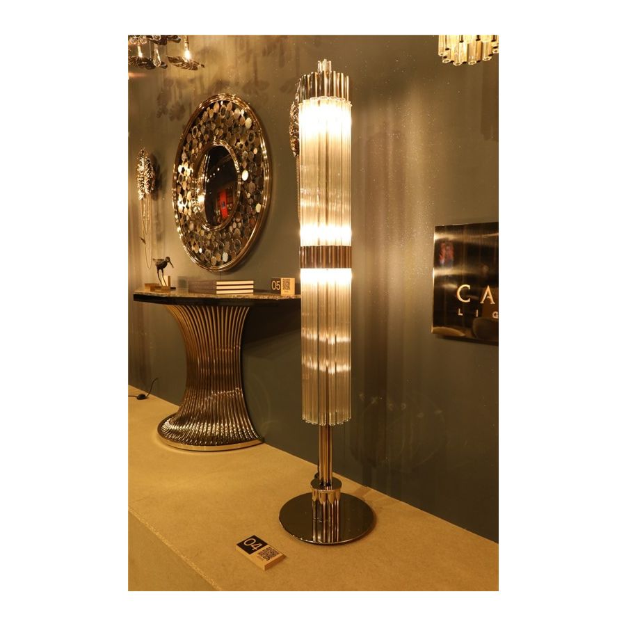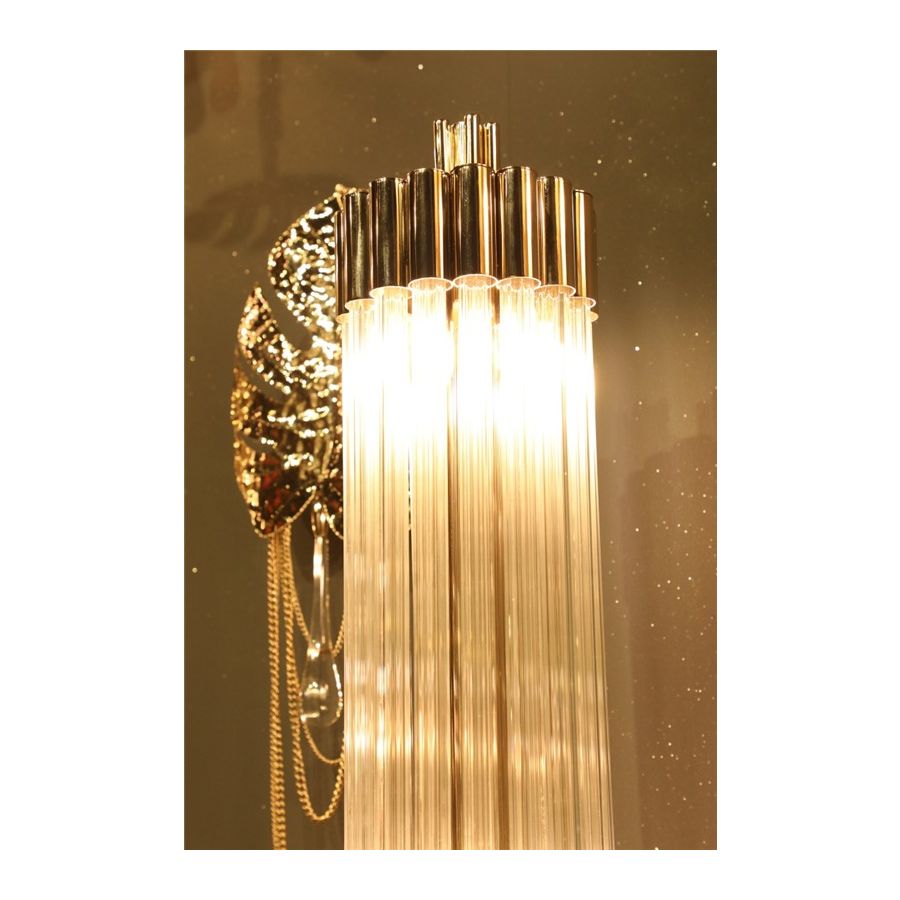 Guldpläterad mässing, mästerligt kombinerad med fängslande glas, skapar en luftig atmosfär, full av klara och lekfulla skjutande bärnstensfärgade ljusstrålar. Denna opulenta golvlampa för med sig sensualitet och ett tillstånd av öm, kontemplativ inställning och öppenhet. Ett mjukt ljus som förmedlar klass och renhet till varje rum. Den passar perfekt till olika typer av interiörer: antingen klassiska eller moderna.