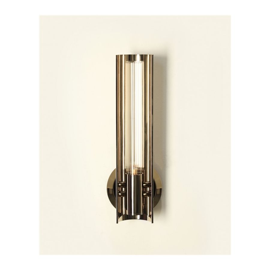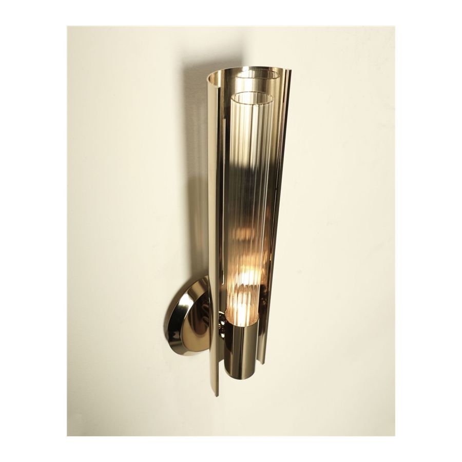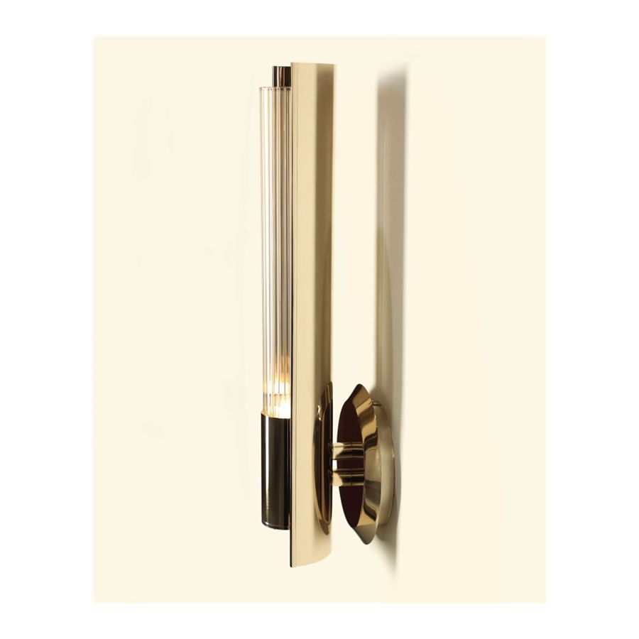 Runt glaset finns en mässingshalvcylinder som elegant hjälper till att projicera ljuset från denna praktfulla väggarmatur, vilket gör den idealisk för breda, lyxiga moderna hallgångar, entréer, vardagsrum, sovrum eller matsalar.