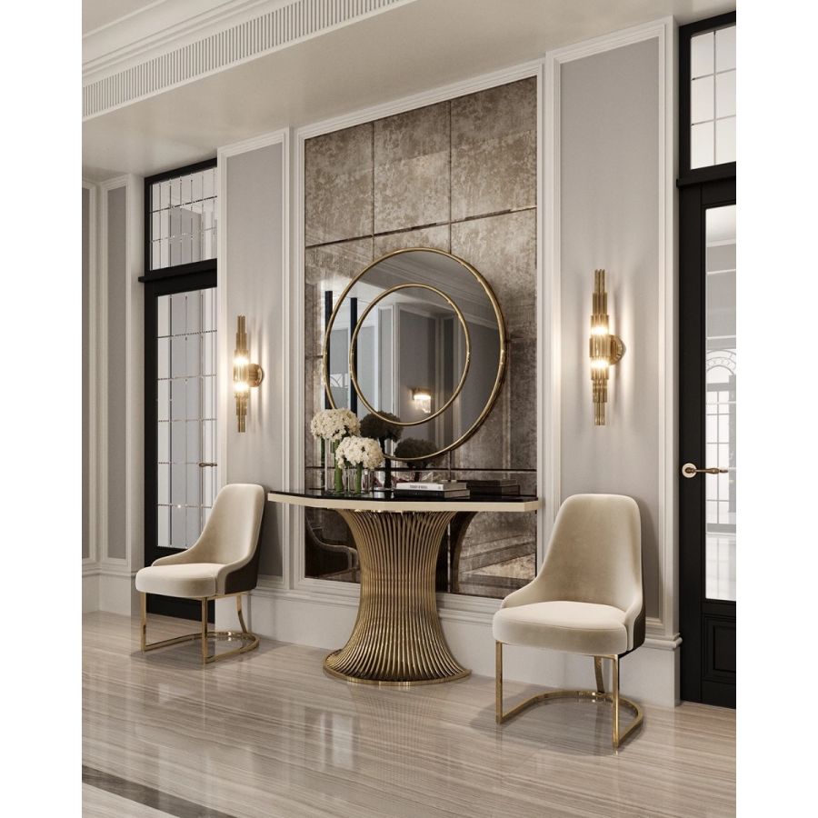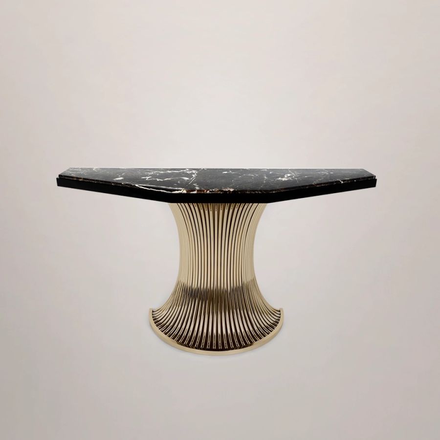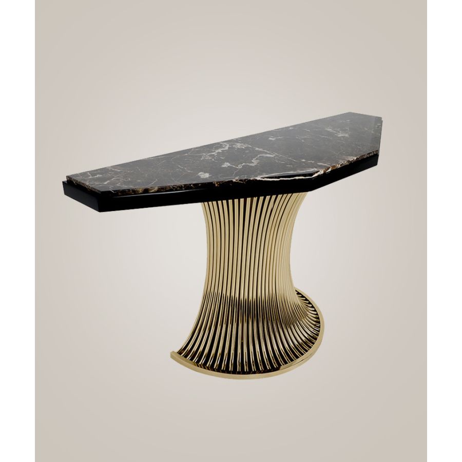 Med en unik design bestående av en dramatisk Emperador-marmorsten placerad ovanpå böjda mässingsrör vars form skapar den visuella känslan av ett kontinuerligt flöde. Flusso Console för med sig en förtrollande dragningskraft till varje heminteriör och en känsla av mystik till de mest utsökta inredningarna. En genuint elegant design, skickligt utformad för att tillföra elegans till ett klassiskt vardagsrum eller matrum med sitt spektakulära utseende. Denna lyxiga skänk passar lätt in i en rad olika interiörer, från den överdådiga Art Deco till samtida chic.