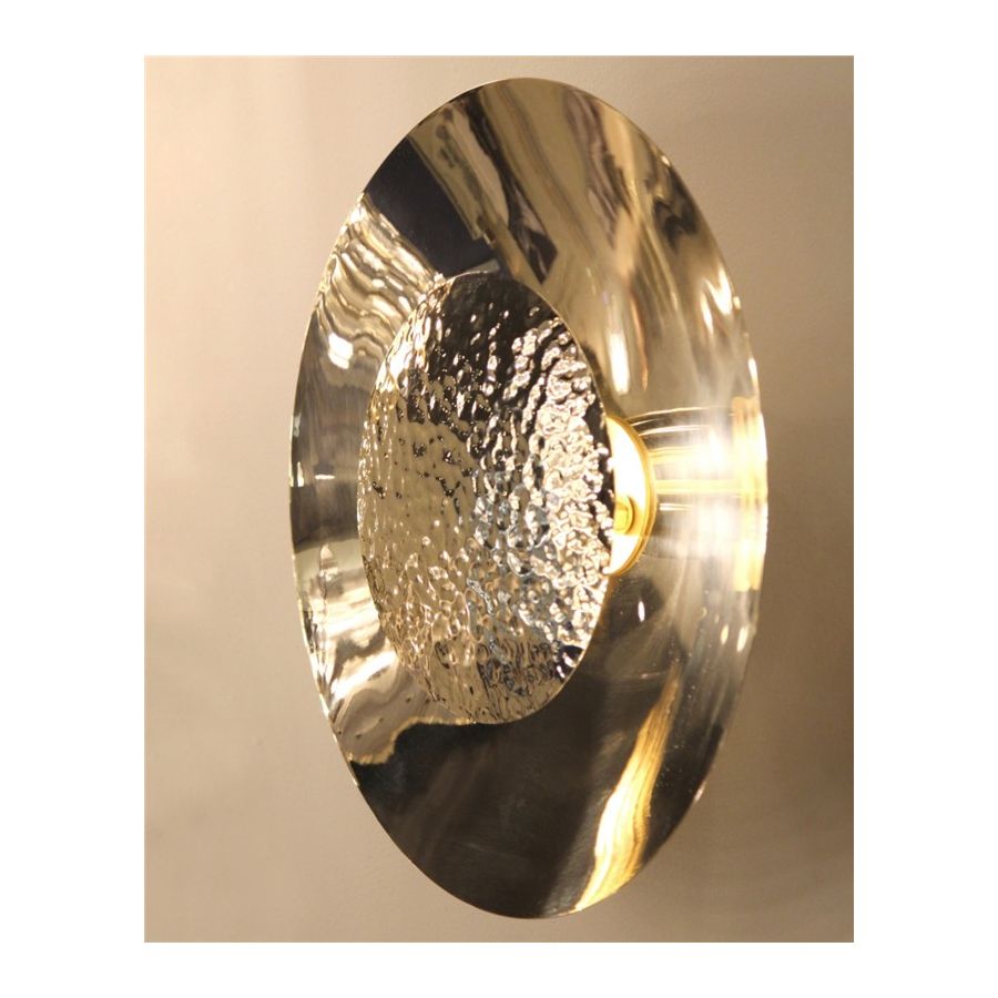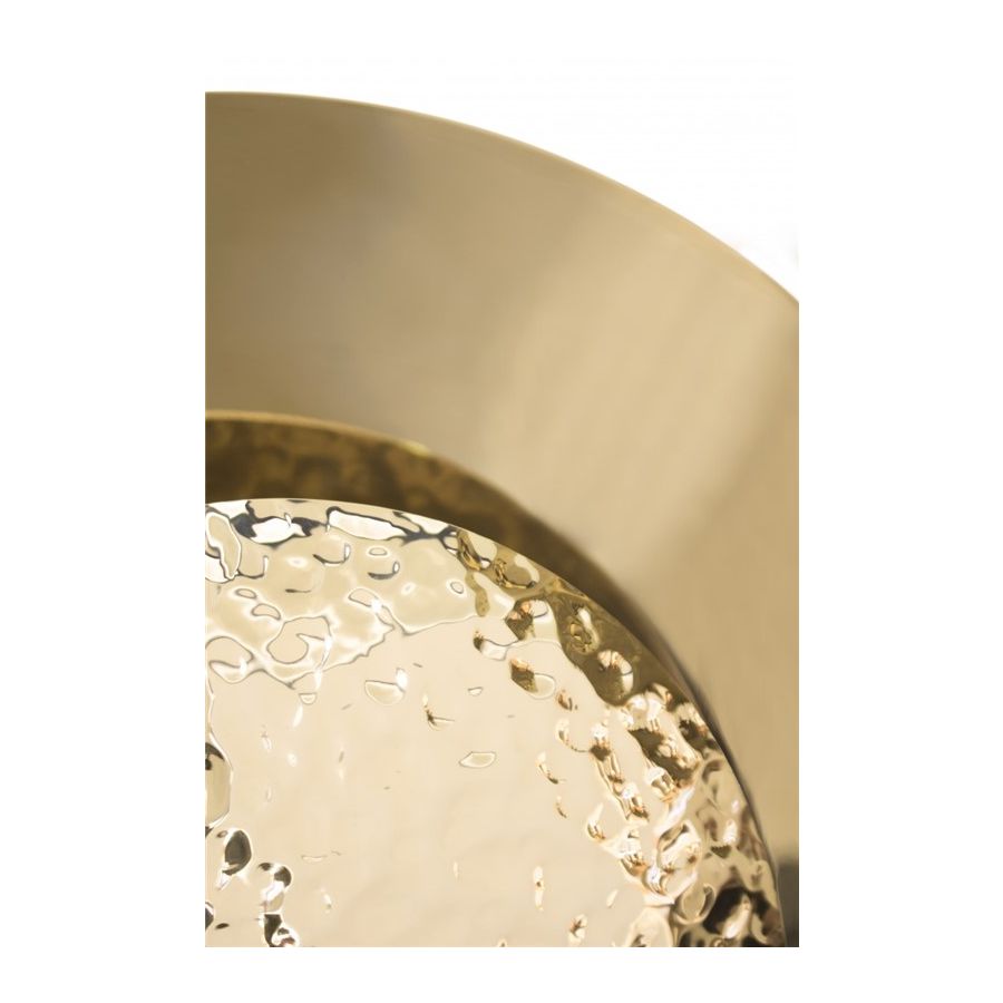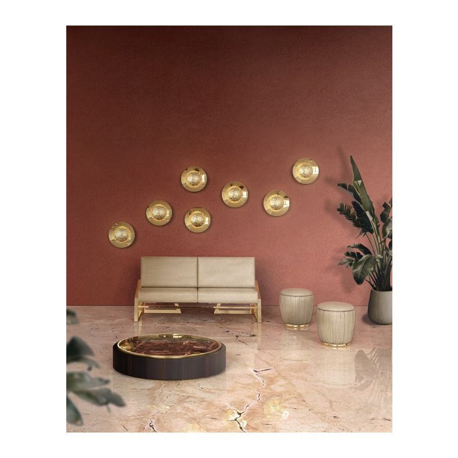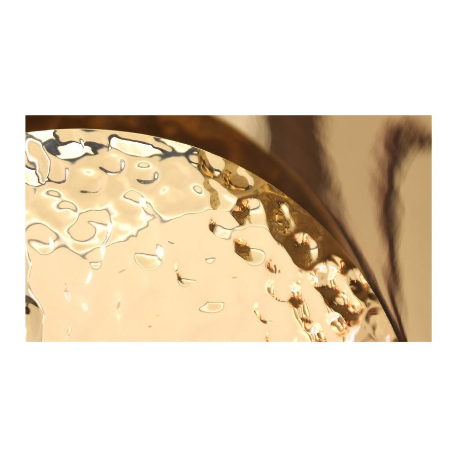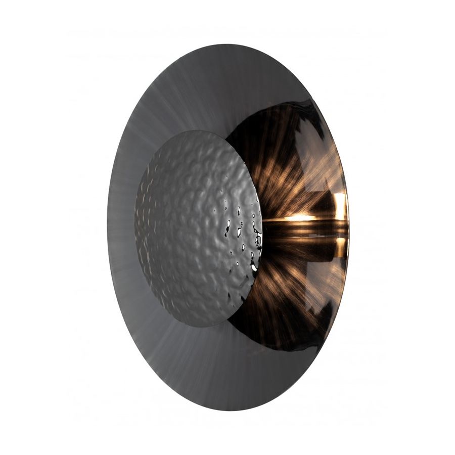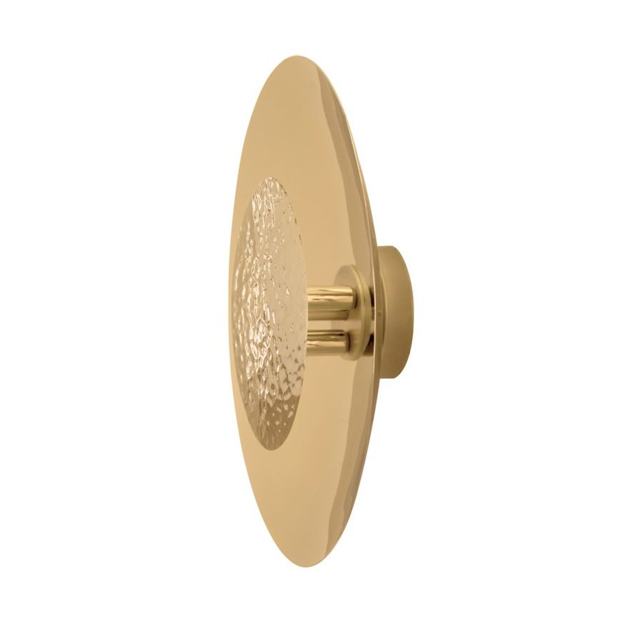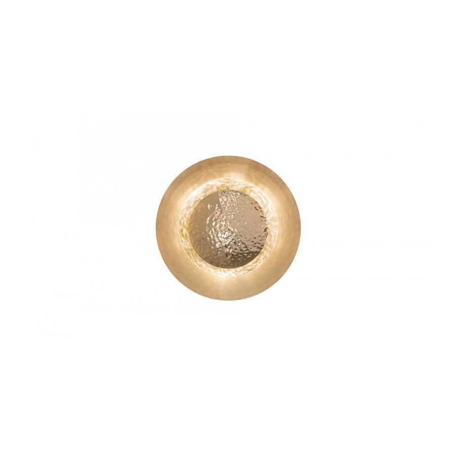 För att återskapa detta naturliga under består Eclipse guld-väggarmatur av två rundade mässingsplattor, placerade framför varandra, med ett litet avstånd mellan dem, vilket endast tillåter små ljusskäror att lysa igenom. Den främre plattan är hammrad för hand, med moderna hantverkstekniker, vilket reflekteras i den glänsande guldbelagda plattan bakom.
