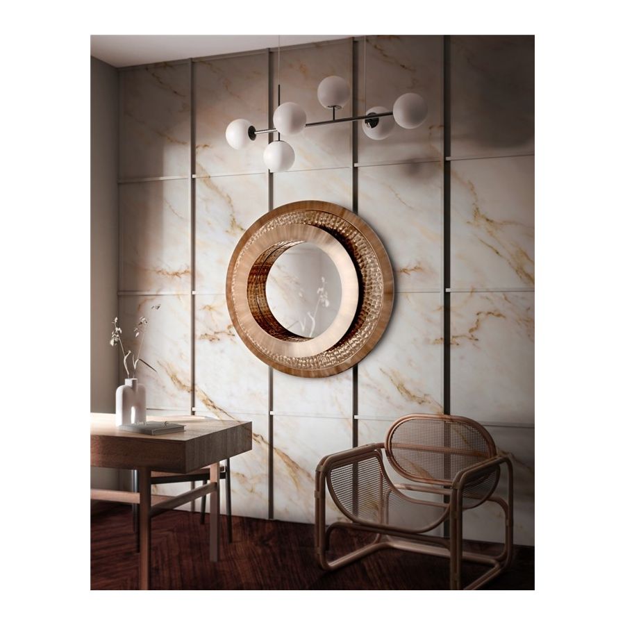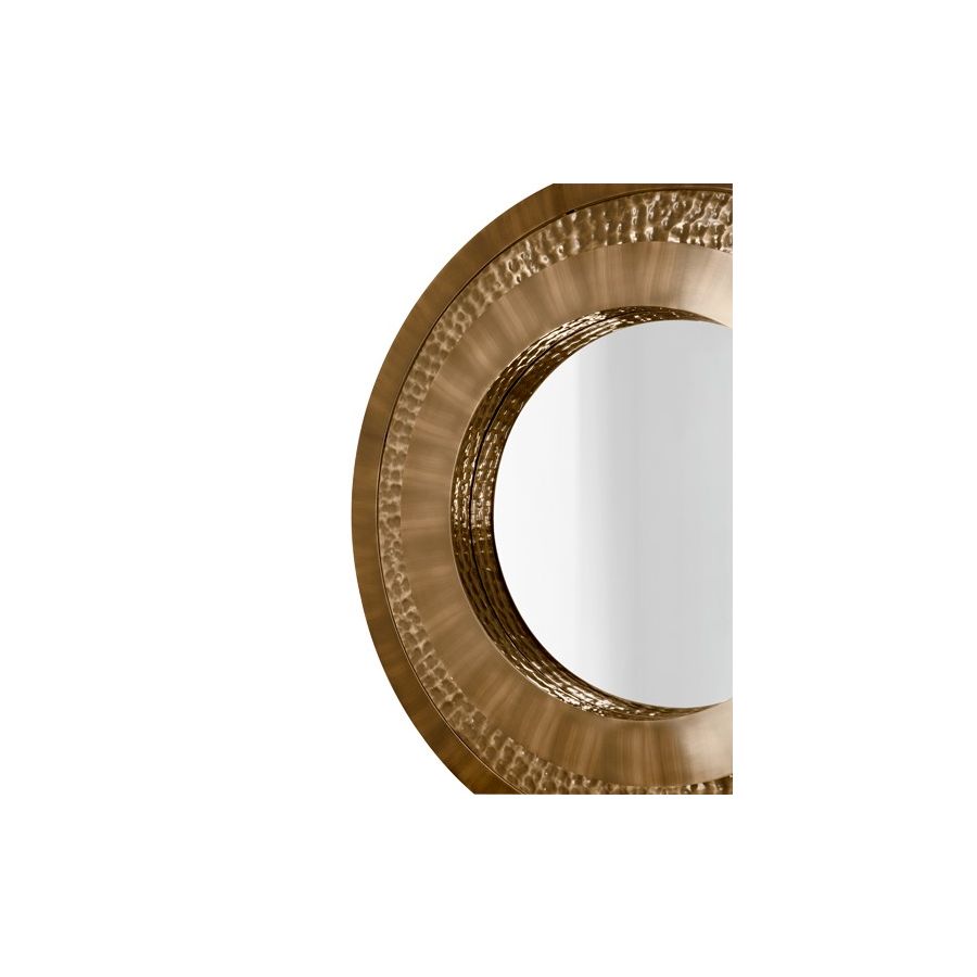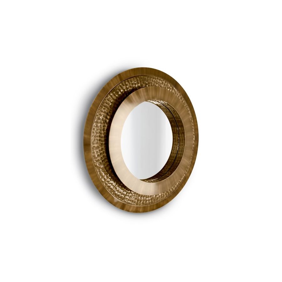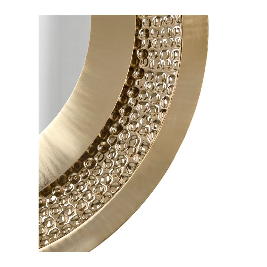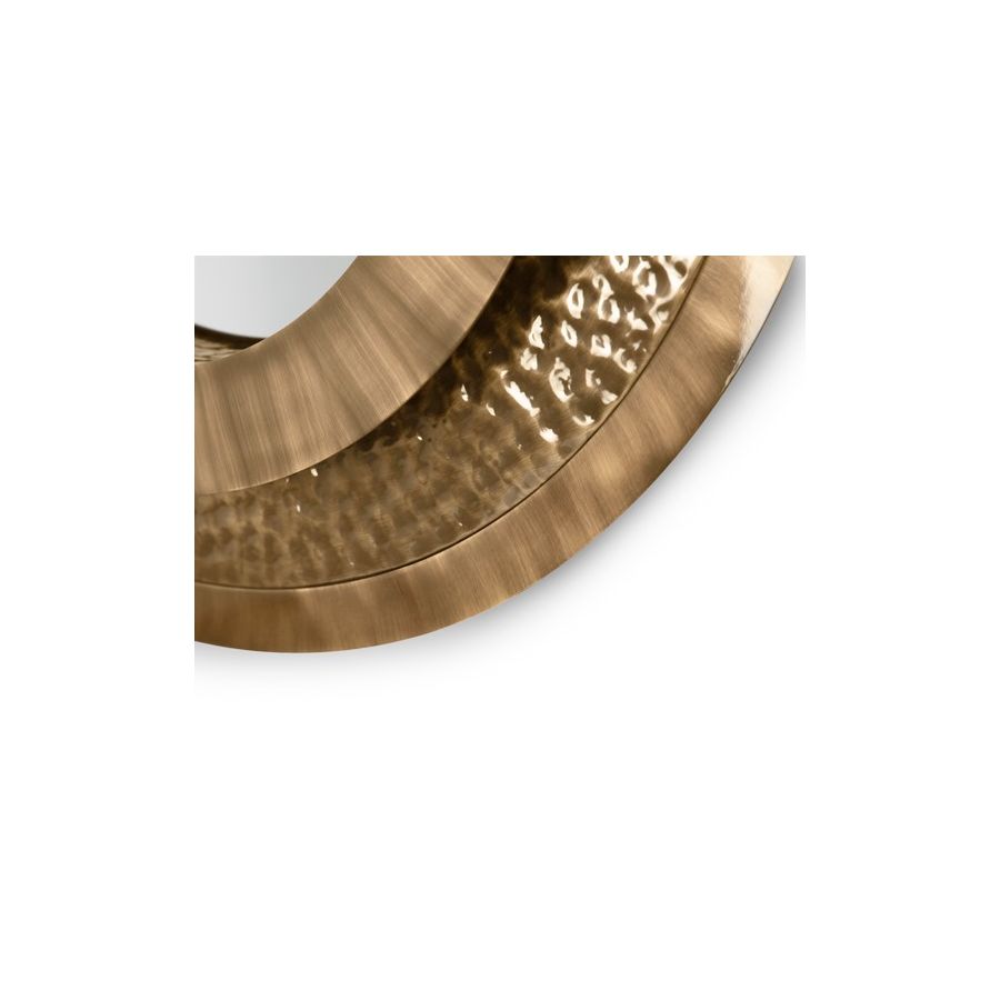 Den polerade mässingen främjar en känsla av lyx, den cirkulära hamrade formen demonstrerar det handgjorda arbete som detta föremål bär. Denna design är en levande hyllning till legenden själv då 24k-standardens guldfinish tillåter en unik reflektion som särskiljer denna spegel från alla andra. Denna gyllene spegel kan perfekt användas i olika inredningslösningar såsom: entréspegel, väggspegel, badrumsspegel eller sovrumsspegel.