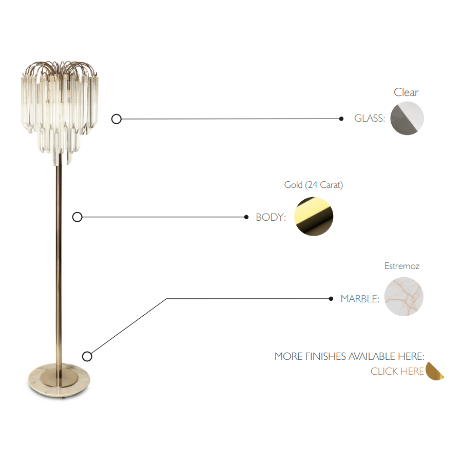 Lotus-golvlampa syftar till att gestalta denna enkelhet och prakt, eftersom dess design och form är nästan identiska med den verkliga blommas form och förmedlar dess lyxiga känsla. Användningen av ädla material och värdefulla traditionella tillverkningstekniker gör denna kollektion unik, då armar i 24k guld tillsammans med delikata glas ökar den visuella komplexiteten. Glasen påminner oss om de lugnt fallande kronbladen från blomman som speglar dess enkelhet samt nyanser av elegans och skönhet.
