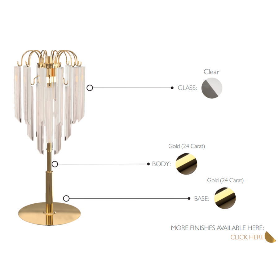Lotus bordslampa syftar till att återge denna enkelhet och prakt eftersom dess design och form nästan är identiska med den verkliga blommans form, vilket för in dess lyxiga känsla. Användningen av ädla material och värdefulla traditionella tillverkningstekniker gör denna kollektion unik, eftersom 24k guldarmar med delikat glas ökar den visuella komplexiteten. Glasen påminner oss om de lugnt fallande kronbladen från blomman som speglar dess enkelhet samt nyanser av elegans och skönhet.
