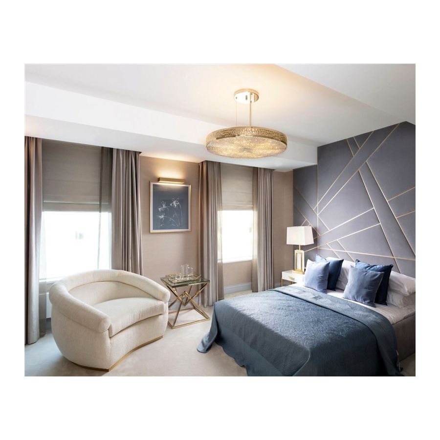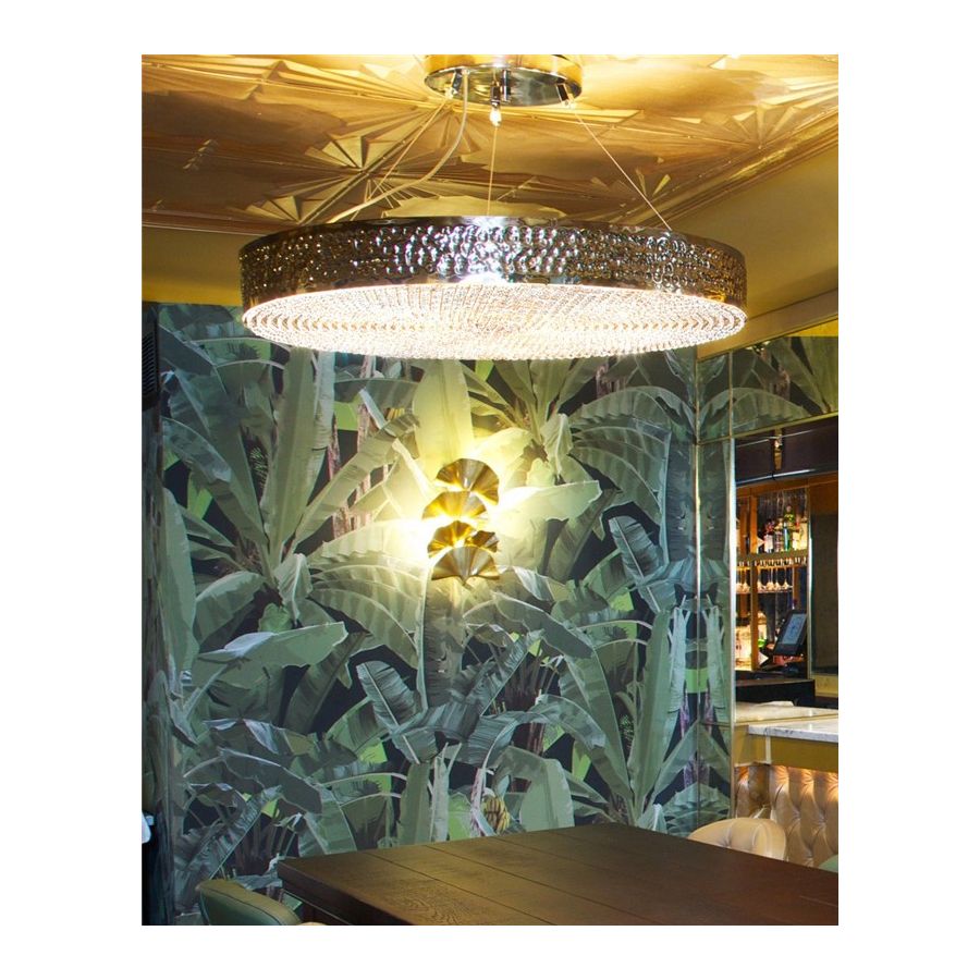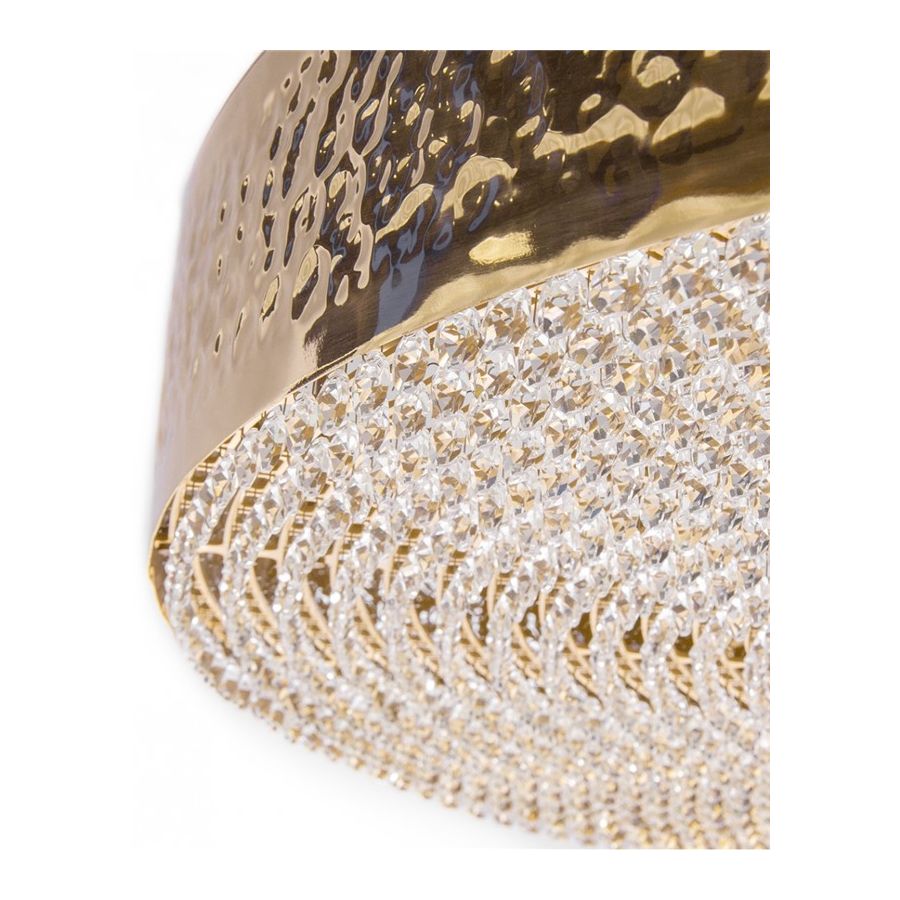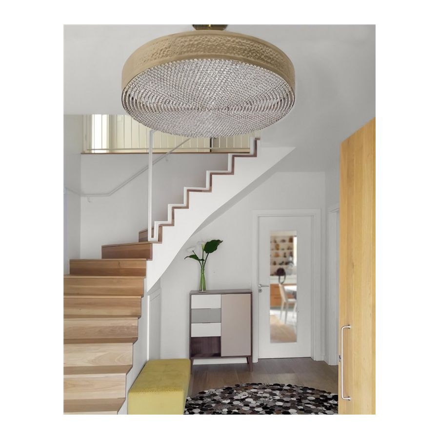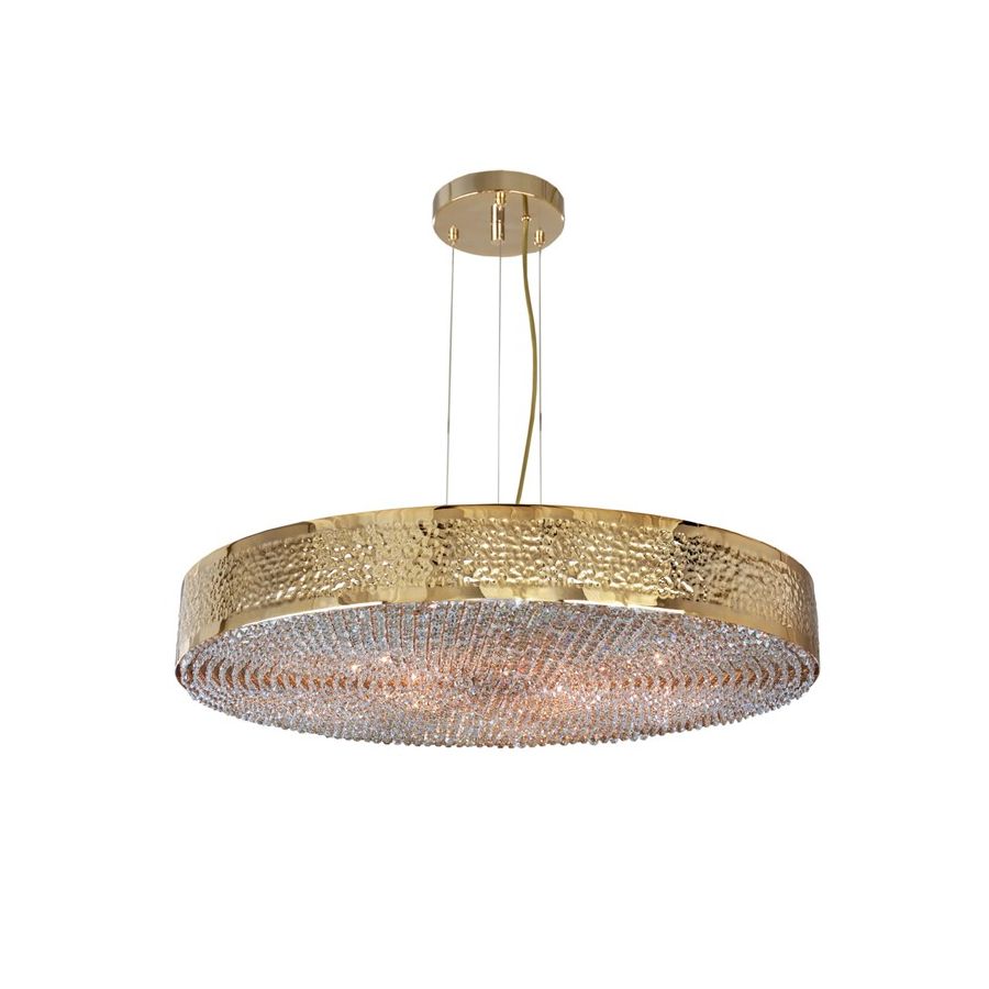Den förgyllda mässingsstrukturen hamras av händerna på erfarna belysningsdesignhantverkare, ömtåliga kristaller monteras också individuellt för hand på undersidan av pendeln. Dessa egenskaper gör denna lyxiga pendel till det perfekta valet för alla exklusiva hotell- eller bostadsprojekt då den skapar en prestigefylld atmosfär varhelst den placeras.