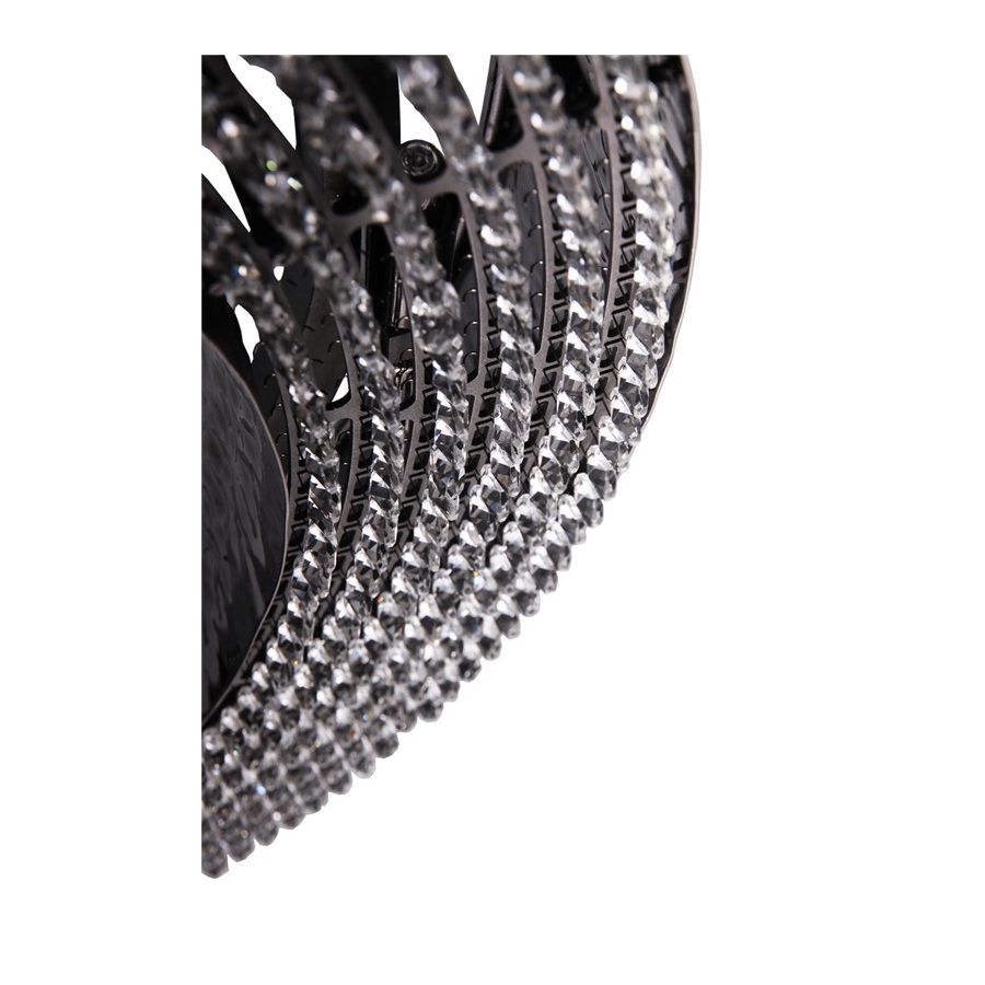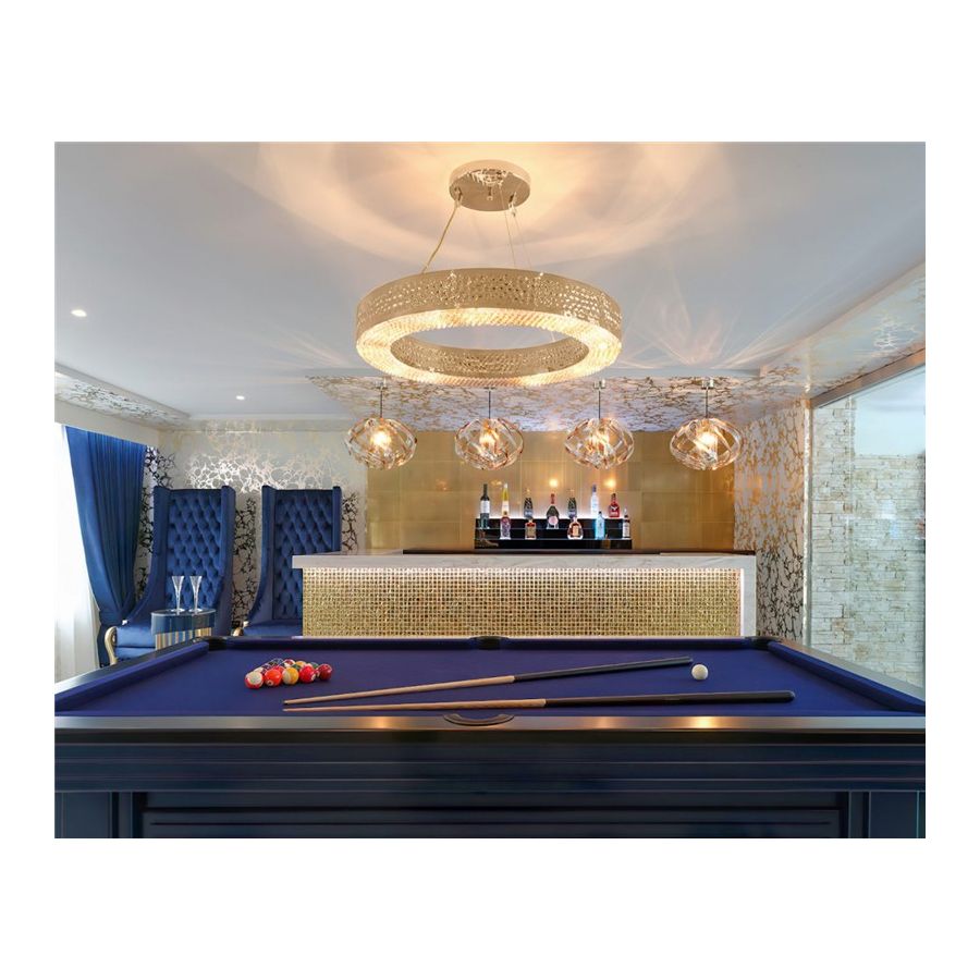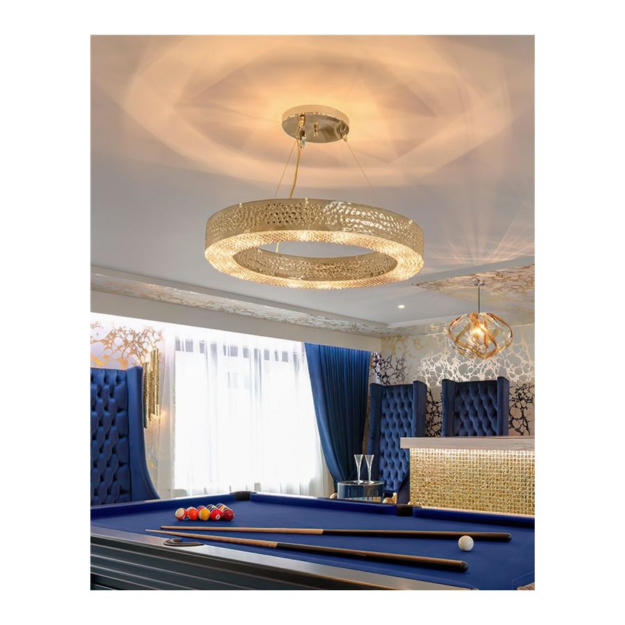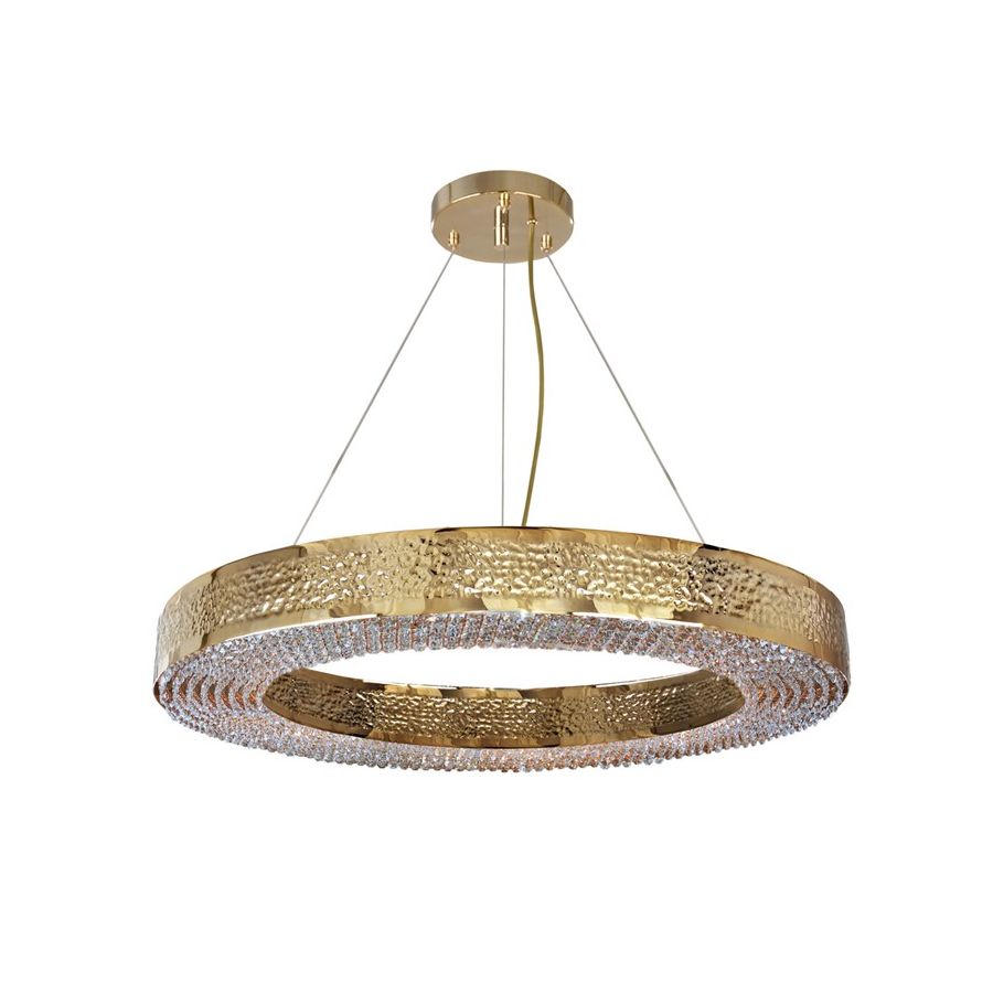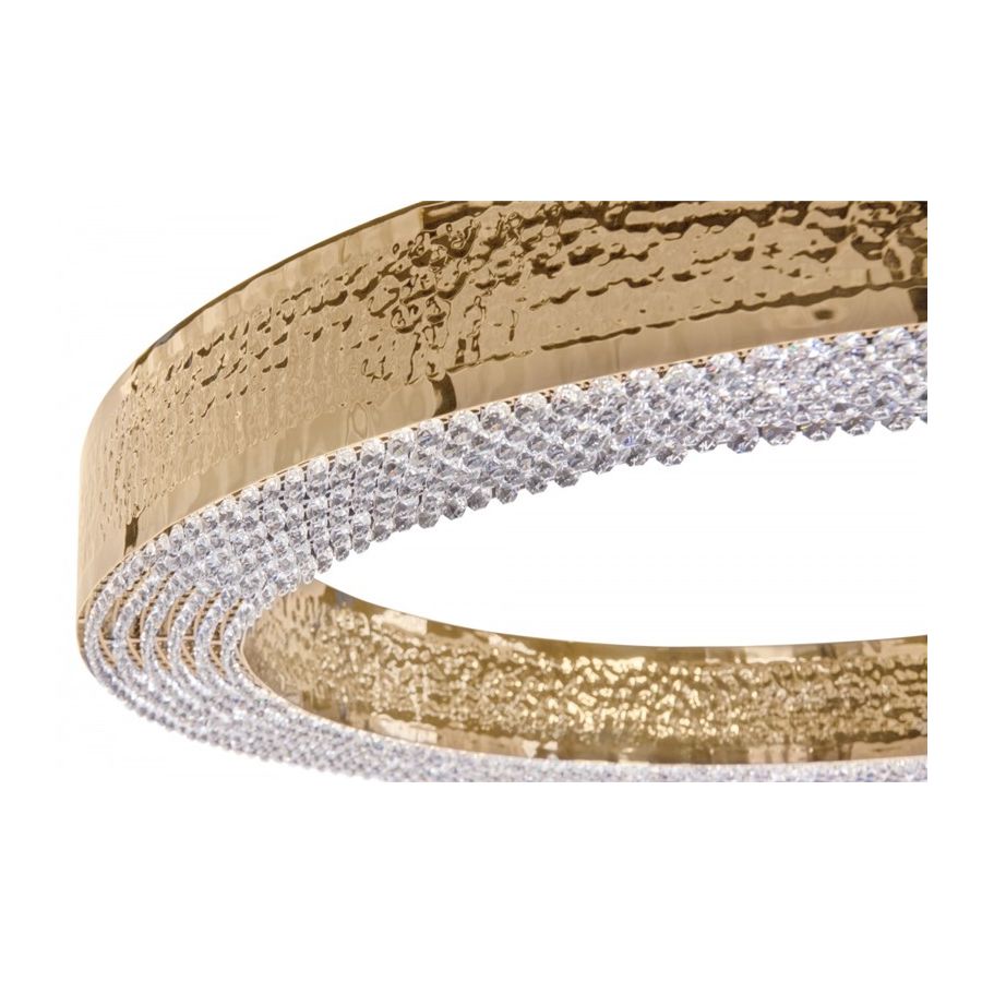 Den guldpläterade mässingsstrukturen hamras av händerna hos erfarna hantverkare inom belysningsdesign, och ömtåliga kristaller monteras också individuellt för hand i botten av belysningsupphängningen.