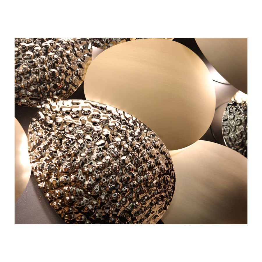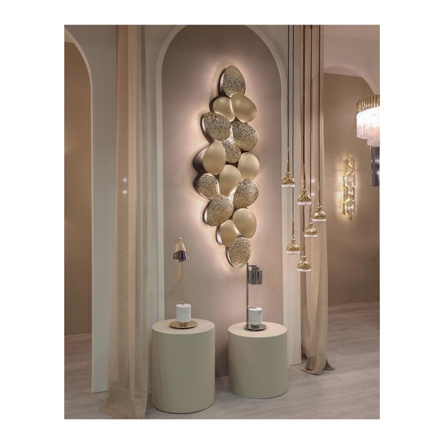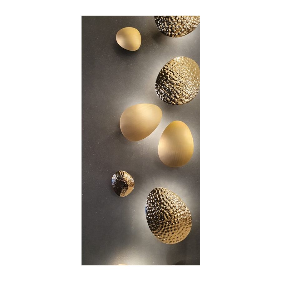 Masterys kraftfulla men ändå mjuka linjer skapar ett organiskt spel av ljus och skuggor som antyder elegans och glamour. Denna praktfulla vägglampa, handgjord i förgylld mässing, kommer att stå ut i de mest lyxiga och exklusiva inredningarna.