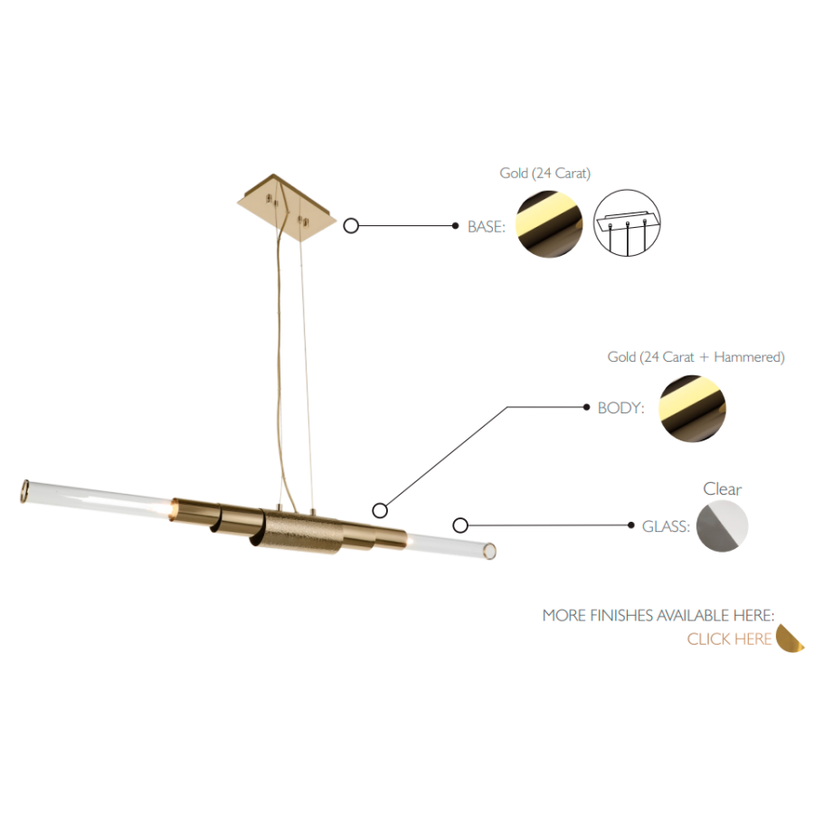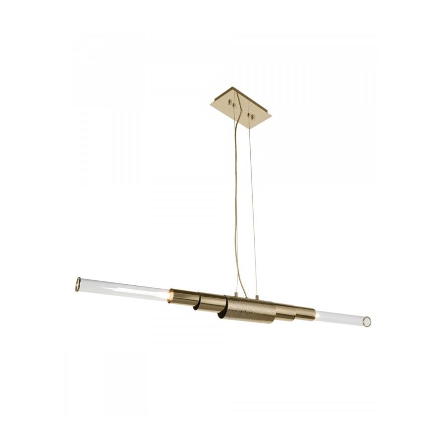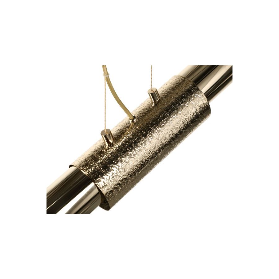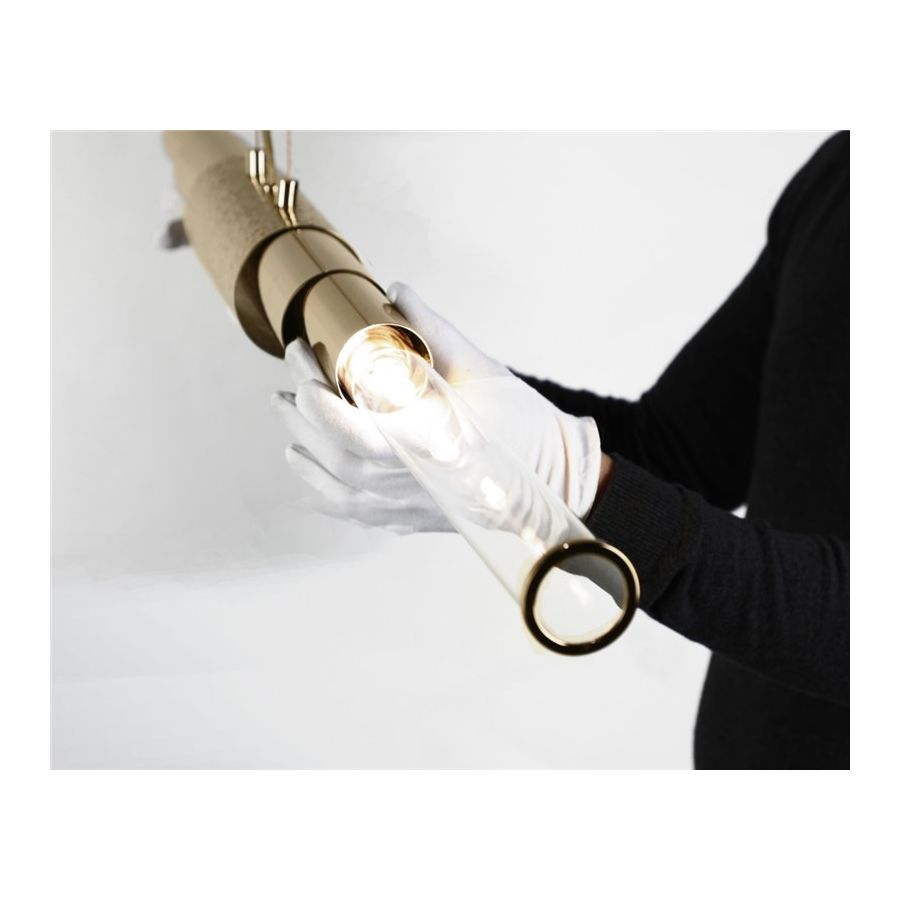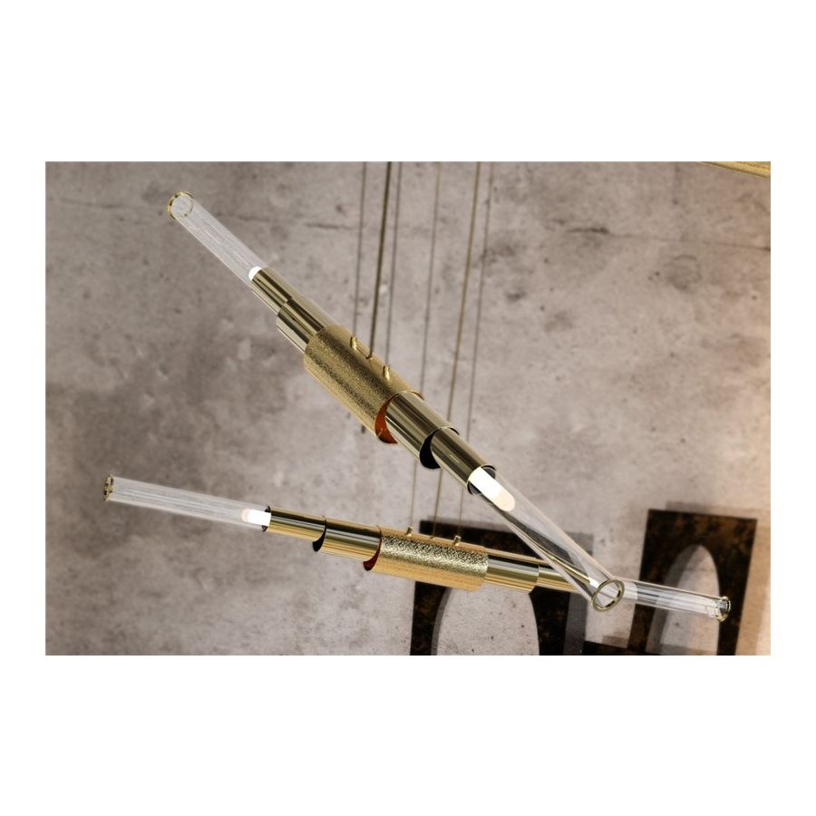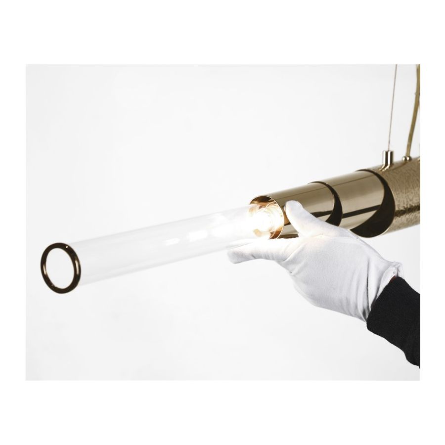 Överlappningen av cylindrar skapar visuellt en intrigant designsilhuett. Ihopbyggd av flera mässingsrör har ljuskronan en djärv kantighet som mjukas upp av distinkta förgyllda och hamrade ytbehandlingar, i kombination med det maskinbearbetade glaset som är detaljerat vid spetsen.