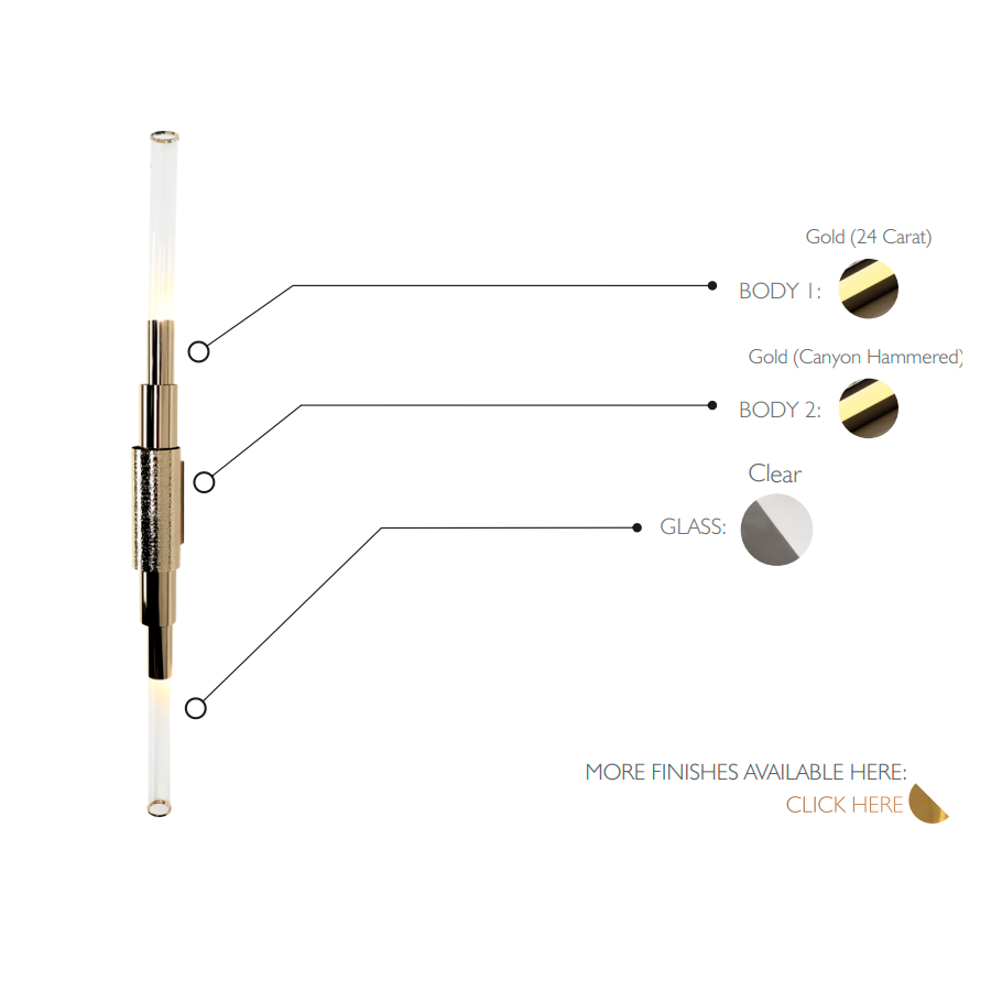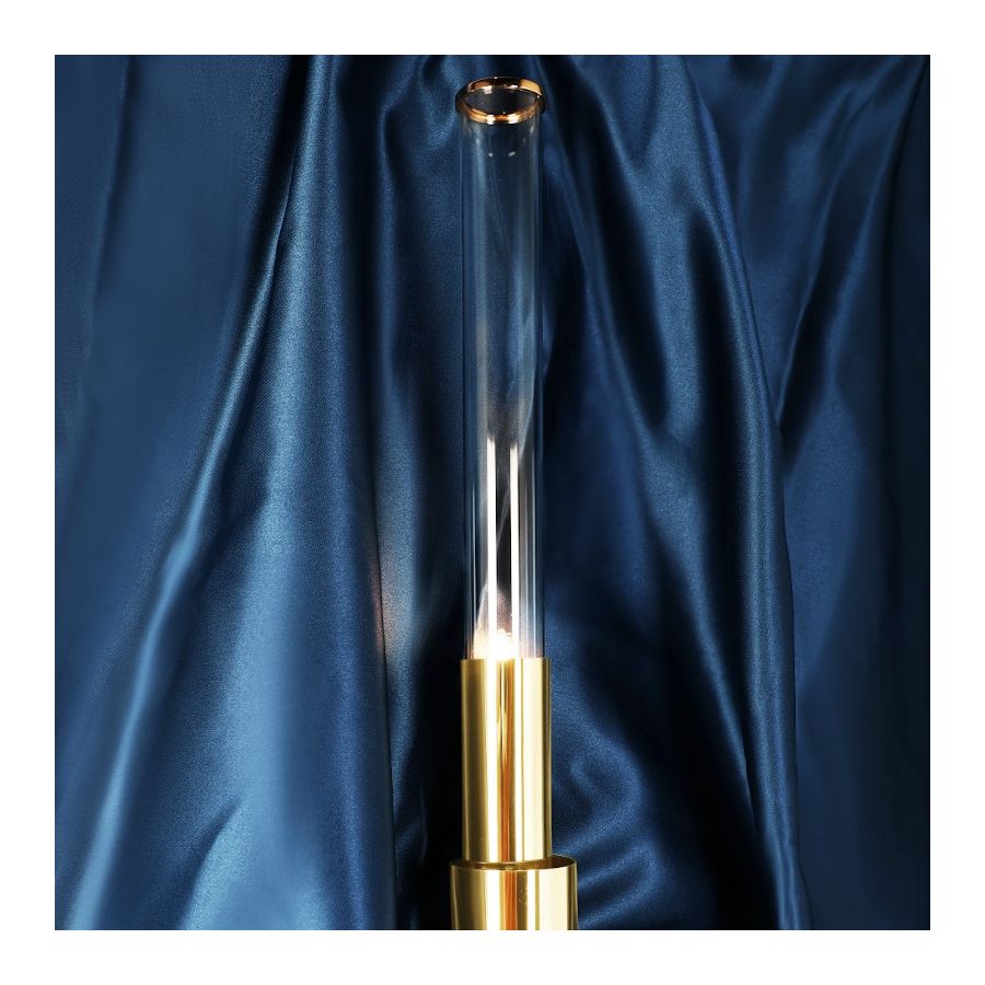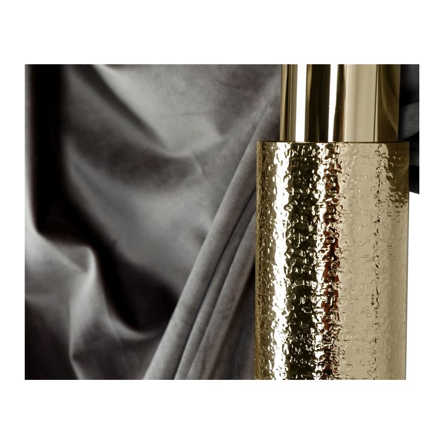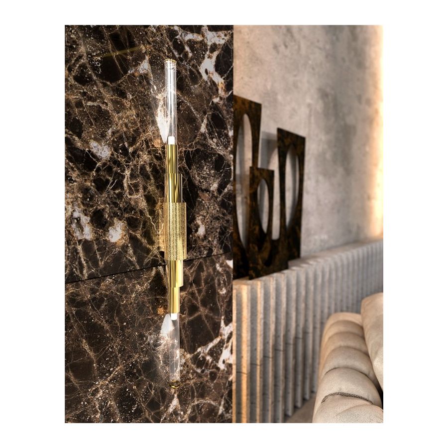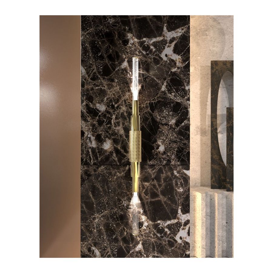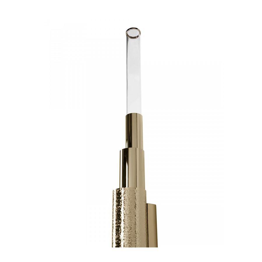Överlappningen av cylindrar skapar visuellt en intressant designsilhuett. Monterad med flera mässingsrör har vägglampan en djärv kantighet som mildras av distinkta guldpläterade och hamrade ytbehandlingar i kombination med det maskinbearbetade glaset som är detaljrikt vid spetsen.