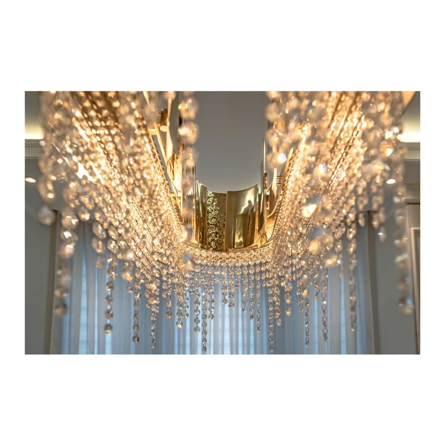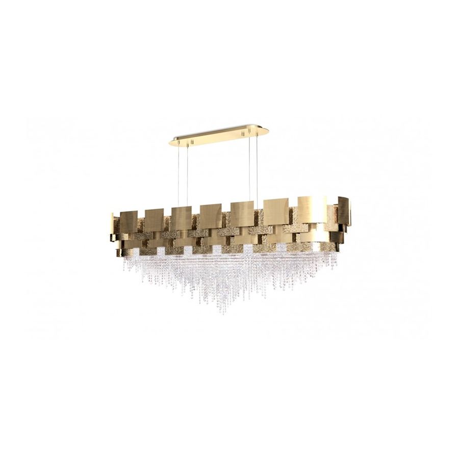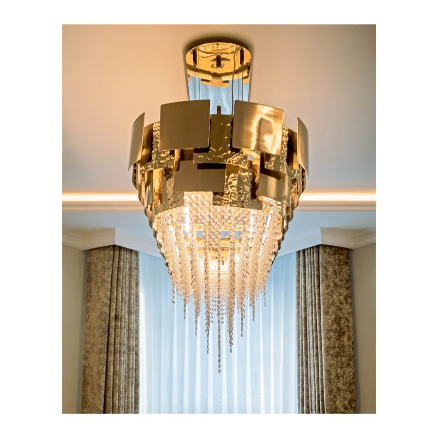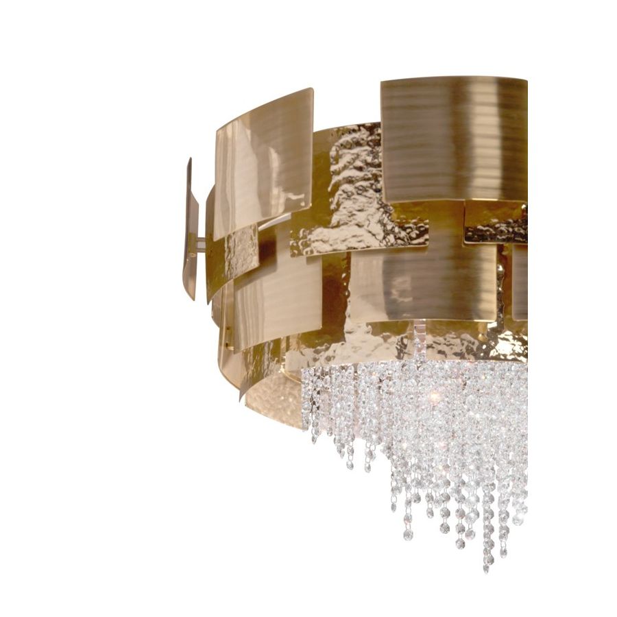 Låt dig visuellt inspireras av dynamiken och elegansen i denna unika design. Dess enkla geometri, i kombination med en blandning av ömtåliga kristaller och mässing, kompletterar verket med en touch av glamour och låter dig utforska en ny sorts energi och charm.