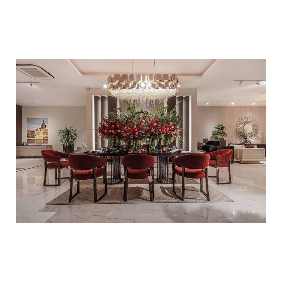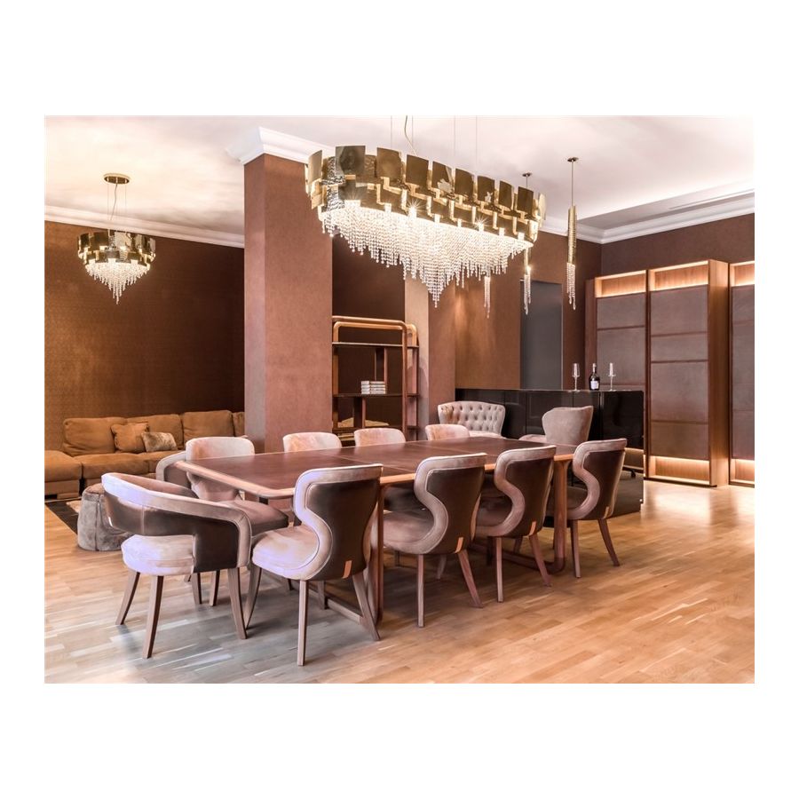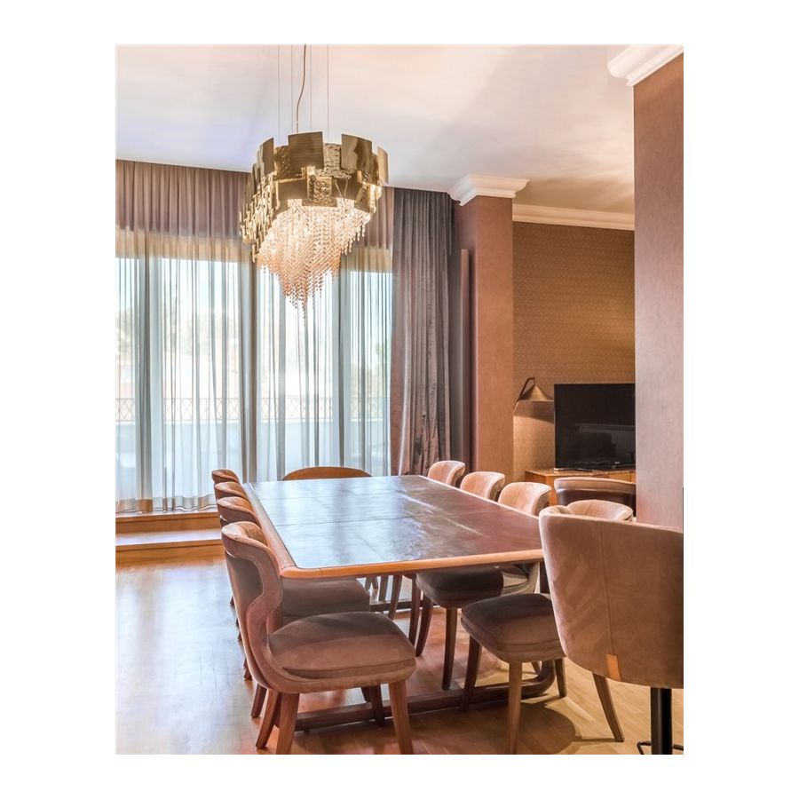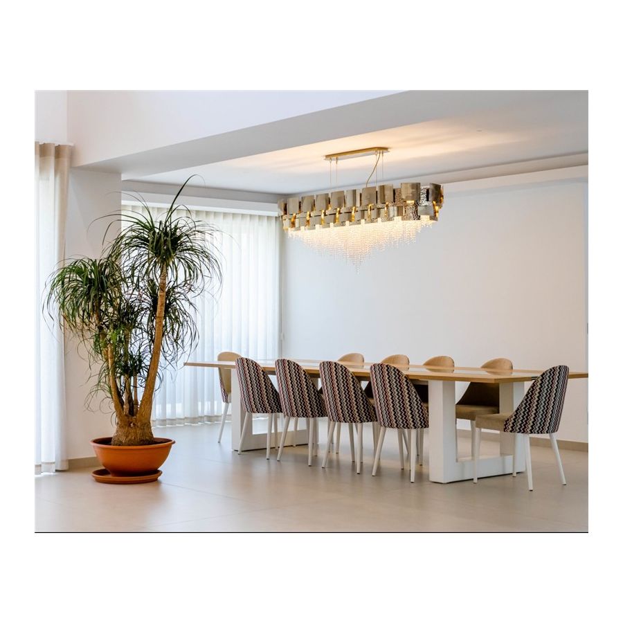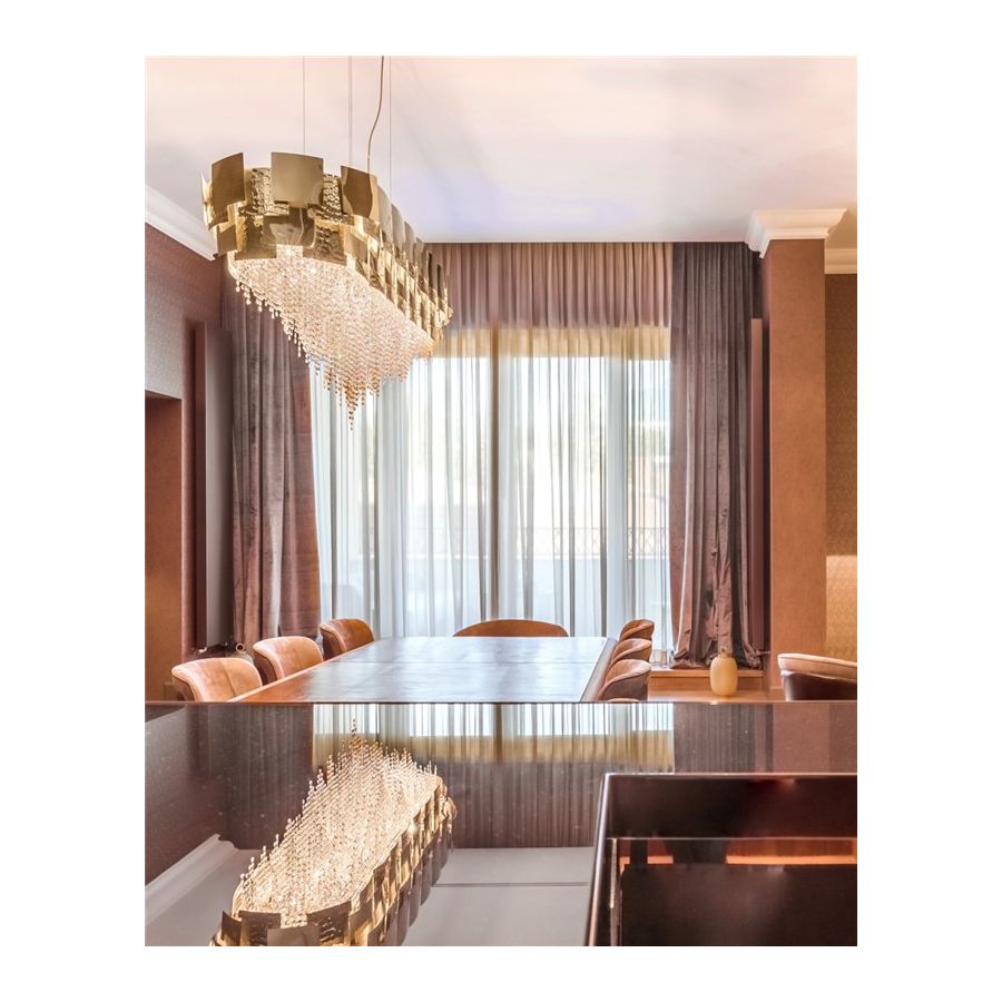 Låt dig visuellt inspireras av dynamiken och elegansen i denna unika design. Dess enkla geometri, i kombination med en blandning av ömtåliga kristaller och mässing, kompletterar verket med en touch av glamour och låter dig utforska en ny sorts energi och charm.