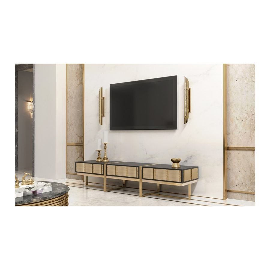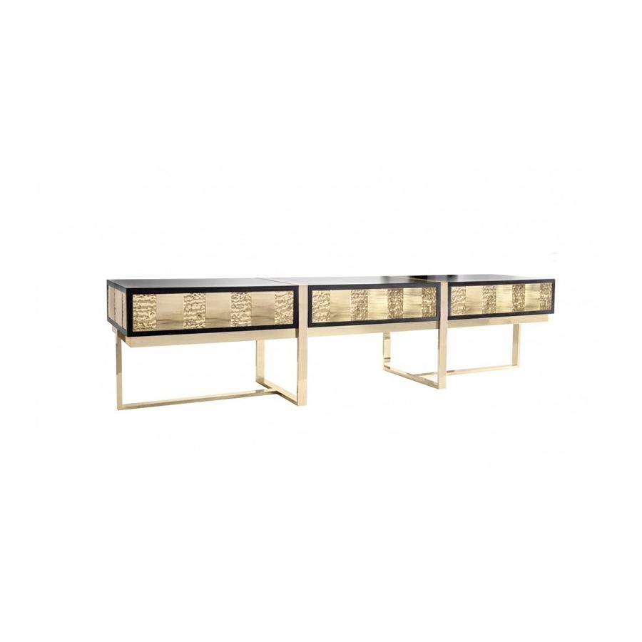 Låt dig visuellt inspireras av denna konsols dynamik och elegans, då den enkla geometrin i kombination med mässingen kompletterar glansen hos föremålen och tillåter dig att utforska en ny typ av energi och charm.