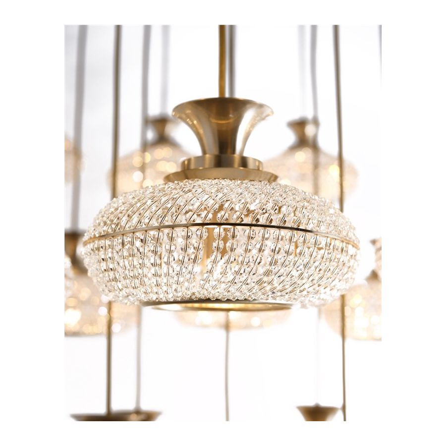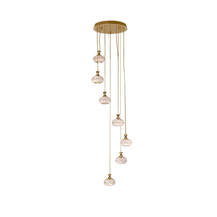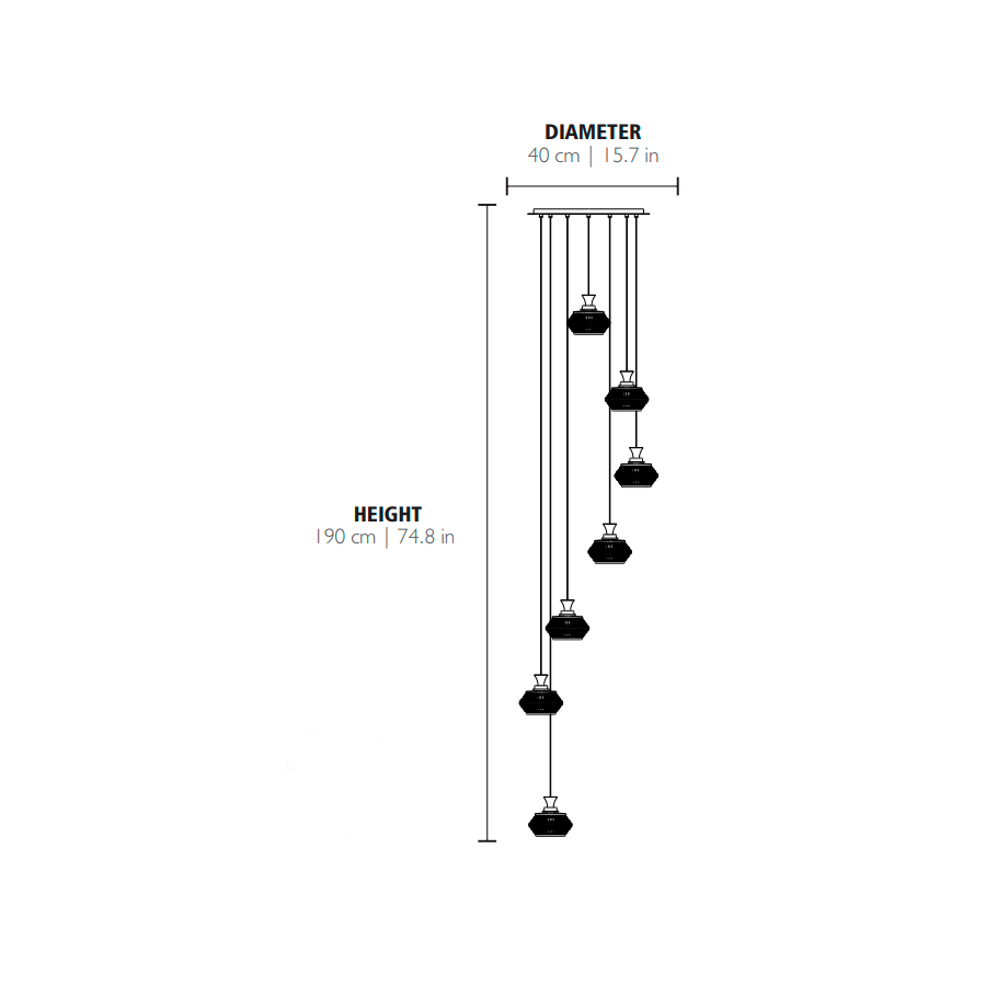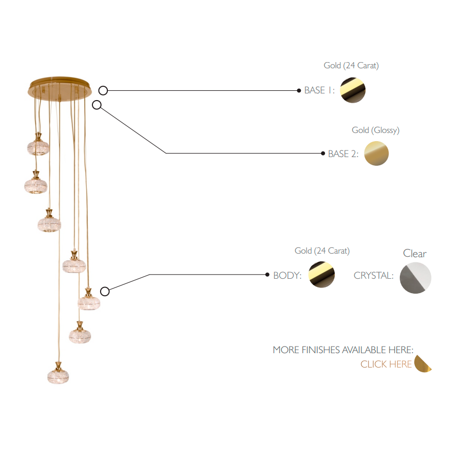 Mystisk pendel framhäver den levande balansen mitt i den klassiska stilen och ett unikt utseende skapat av kristalldetaljerna, och är den perfekta pjäsen att inkludera i de mest unika och lyxiga interiörerna. Det är en signaturanpassning av originaldesignen - en version med sju pendlar som fungerar majestätiskt väl och som pryder utsökta trapphus eller stora hotellfoajéer.
