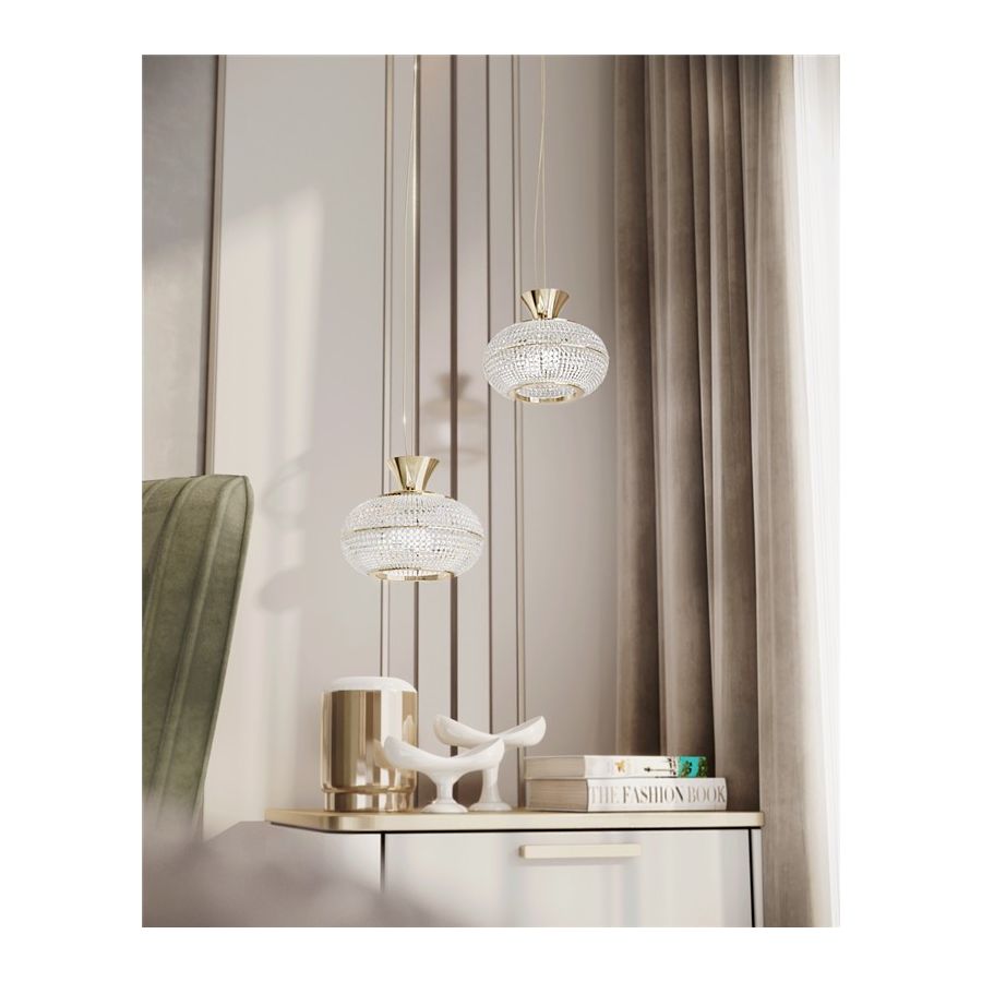 Med andlighet, konst och transcendentala händelser som inspiration är Mystisk pendel ren och har en lätt estetik som ingen annan belysningskollektion. För att uppnå den spirituella och förnaturliga stämningen har Mystisk kollektion flera klara kristallremsor som bildar den runda, lätt tillplattade strukturen. Med en sorts ockult men unik blick är denna lyxiga handgjorda ljuskrona det perfekta dekorativa belysningsinslaget, eftersom kristallernas enastående glans är så karaktäristisk, gudomlig och tidlös.