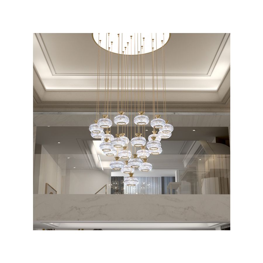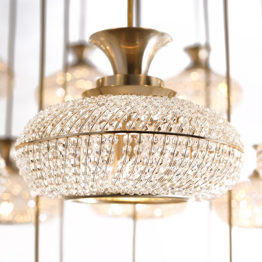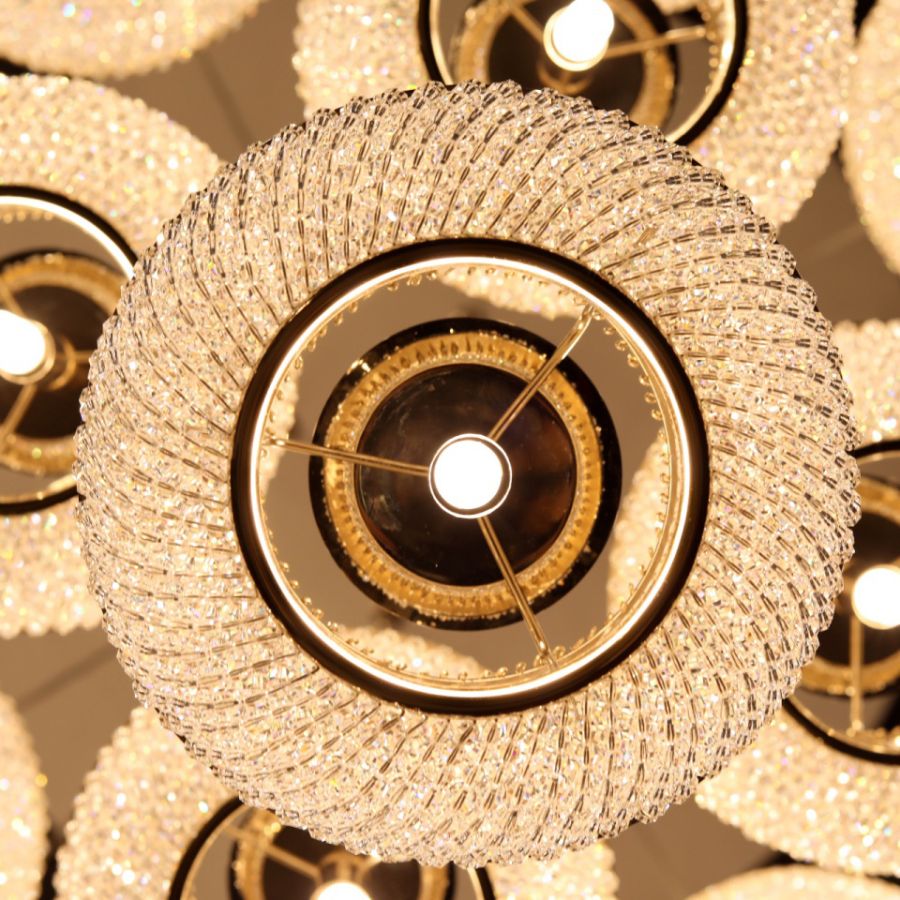 Med ett nästan ockult men unikt utseende är denna lyxiga handgjorda kronlampa det idealiska dekorativa belysningsuttrycket; på grund av kristallernas enastående glans är den så distinkt, gudomlig och tidlös.