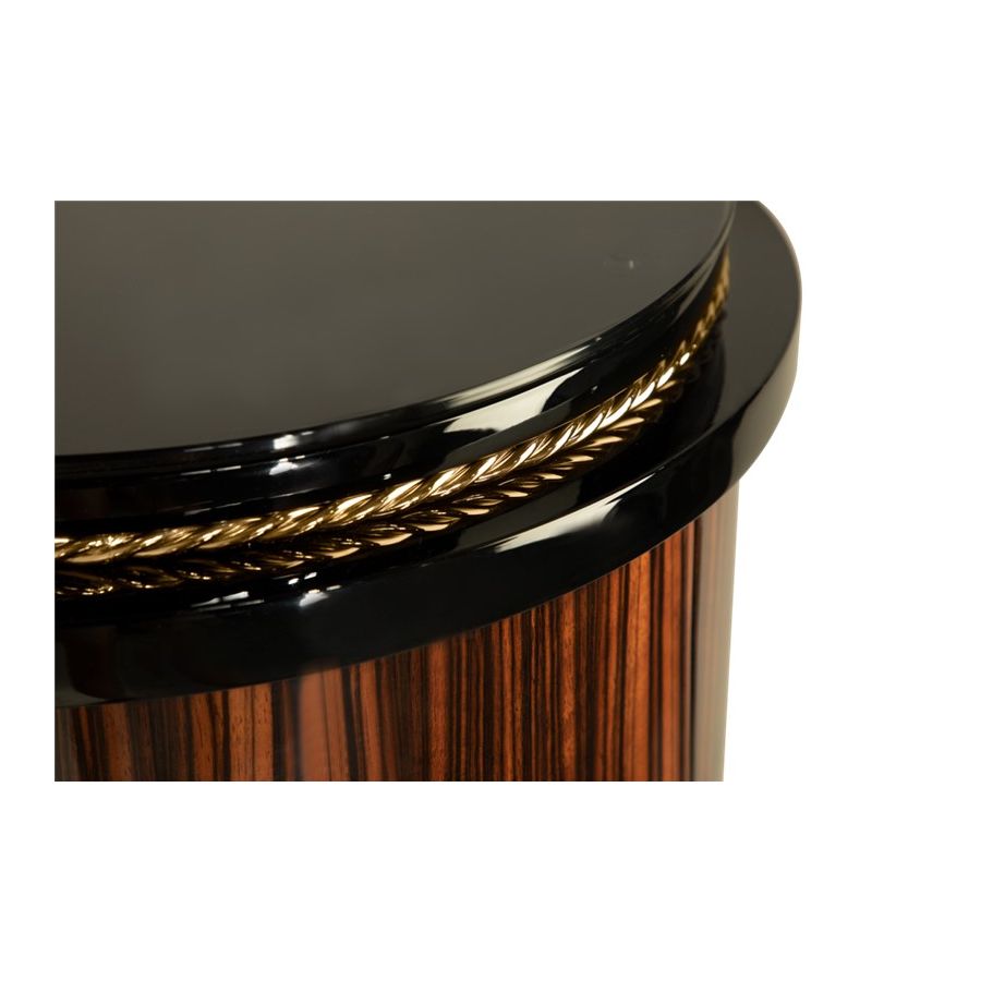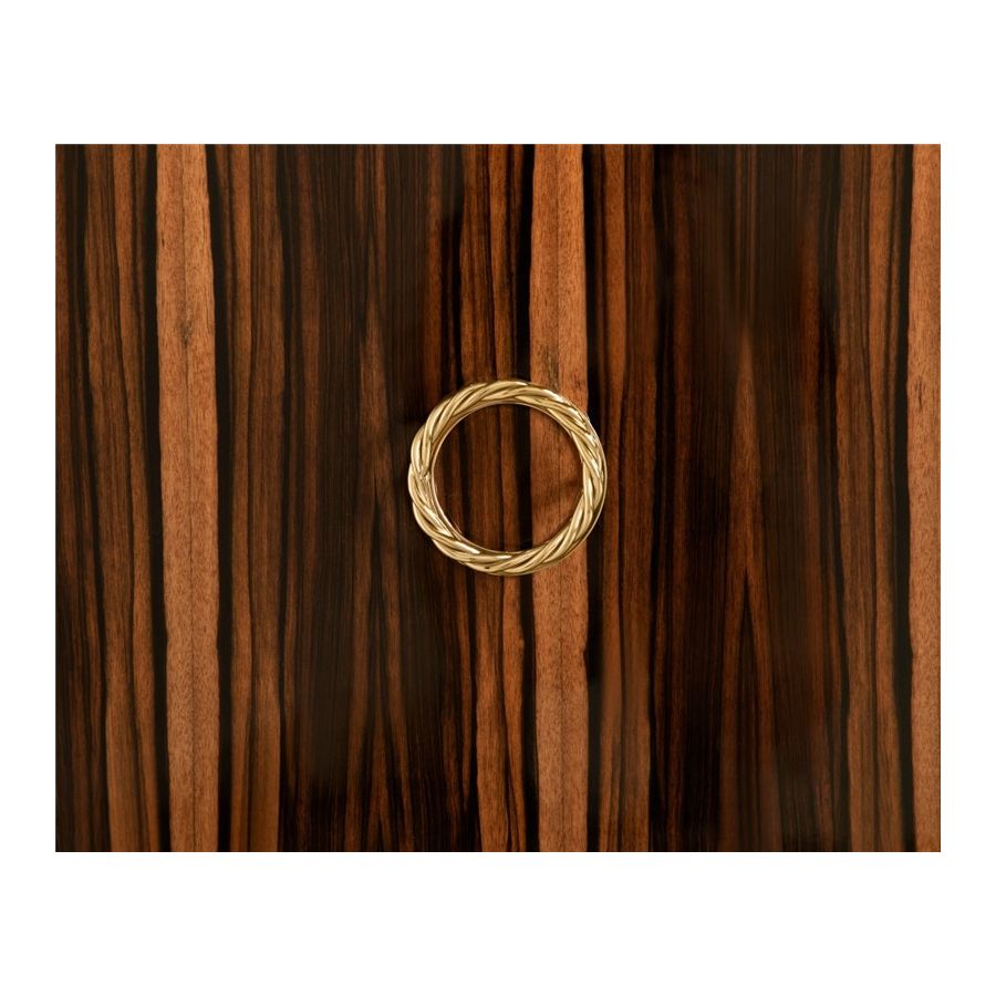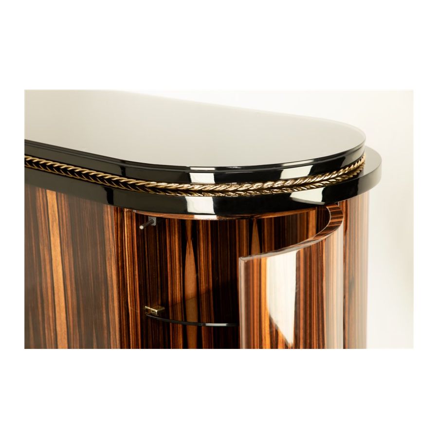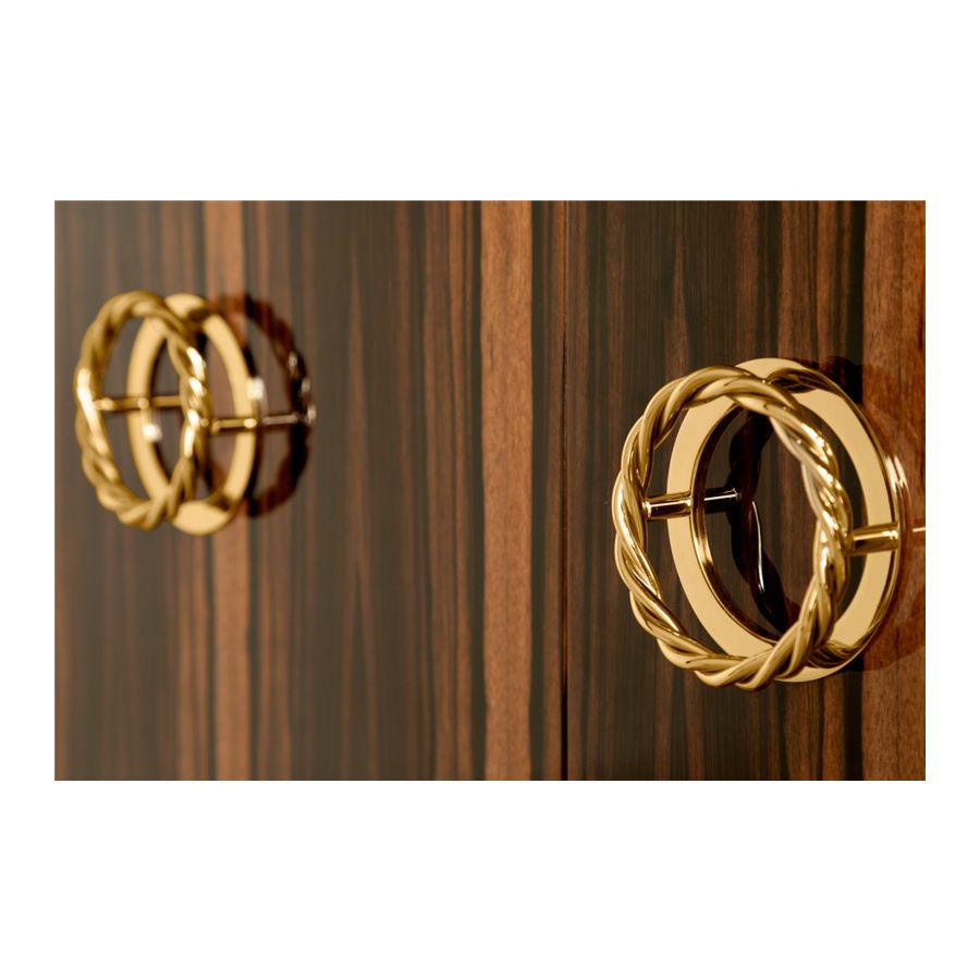 Denna möbel är designad för att imponera med sin unika avantgardistiska men ändå eleganta design, med en modern känsla i sin kärna. Denna skänk är sammansatt av noggrant utvalda premiummaterial såsom trä, glas och mässing, och är utförd med en högblank svart lackfinish. Skänkens struktur i ebenholtsfaner kompletteras med klart glas och slanka mässingslinjer, vilket betonar denna designs starka maskulina karaktär. Det är en iögonfallande möbel, eftersom detta livsstilselement mästerligt återspeglar den skönhet som hantverket tillfört i produktionen. Genom att balansera komfort och konstnärlig estetik förkroppsligar Nautilus-skänken den stilkänsla som skiljer denna exklusiva modell från andra skänkar.