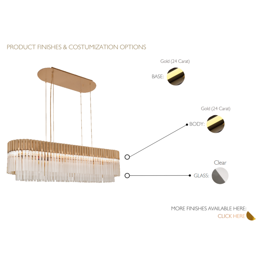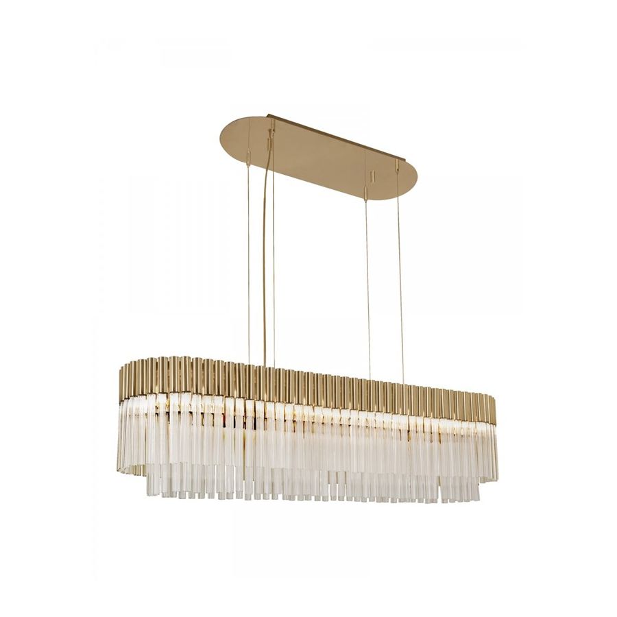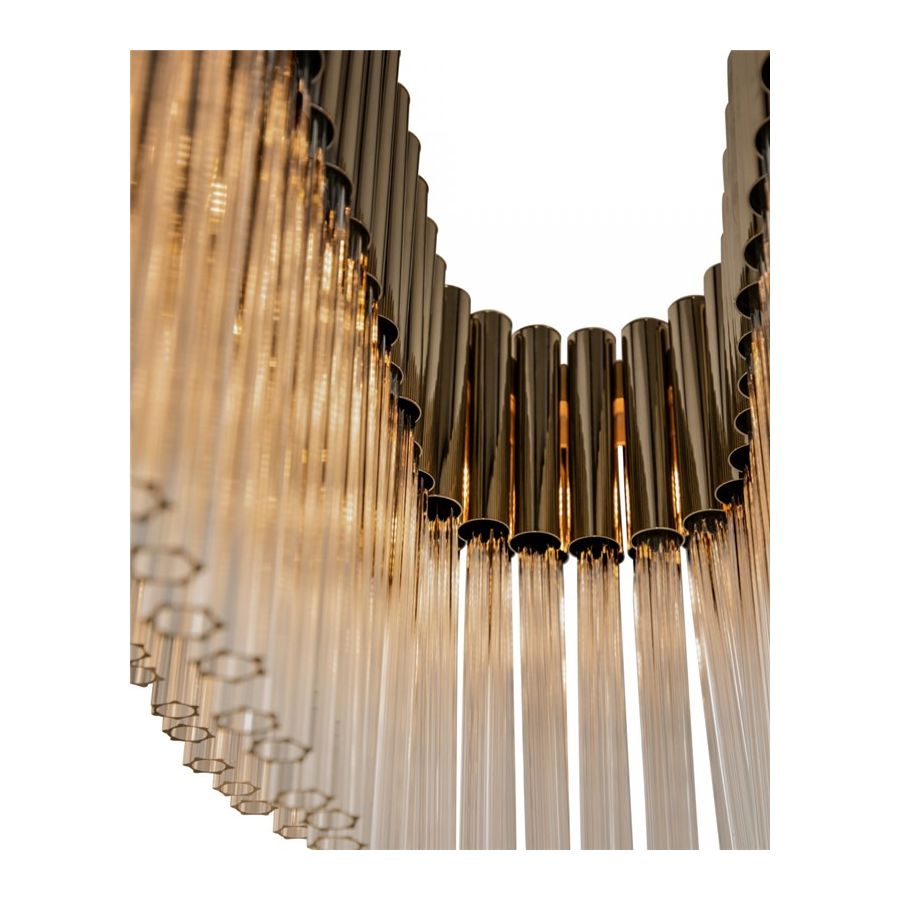 Guldbelagd mässing, mästerligt kombinerad med förtrollande glas, skapar en luftig atmosfär, full av ljusa och lekfulla skjutande bärnstensstrålar av ljus. Denna ståtliga armatur för med sig sensualitet och ett tillstånd av öm, kontemplativ attityd och öppenhet. Ett mjukt ljus som förmedlar klass och renhet till varje utrymme. Den är en perfekt match för olika typer av interiörer: antingen klassiska eller moderna.