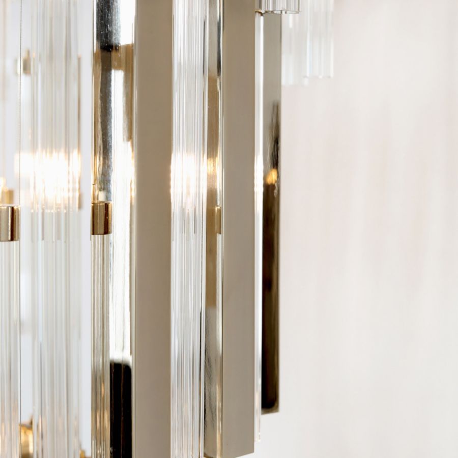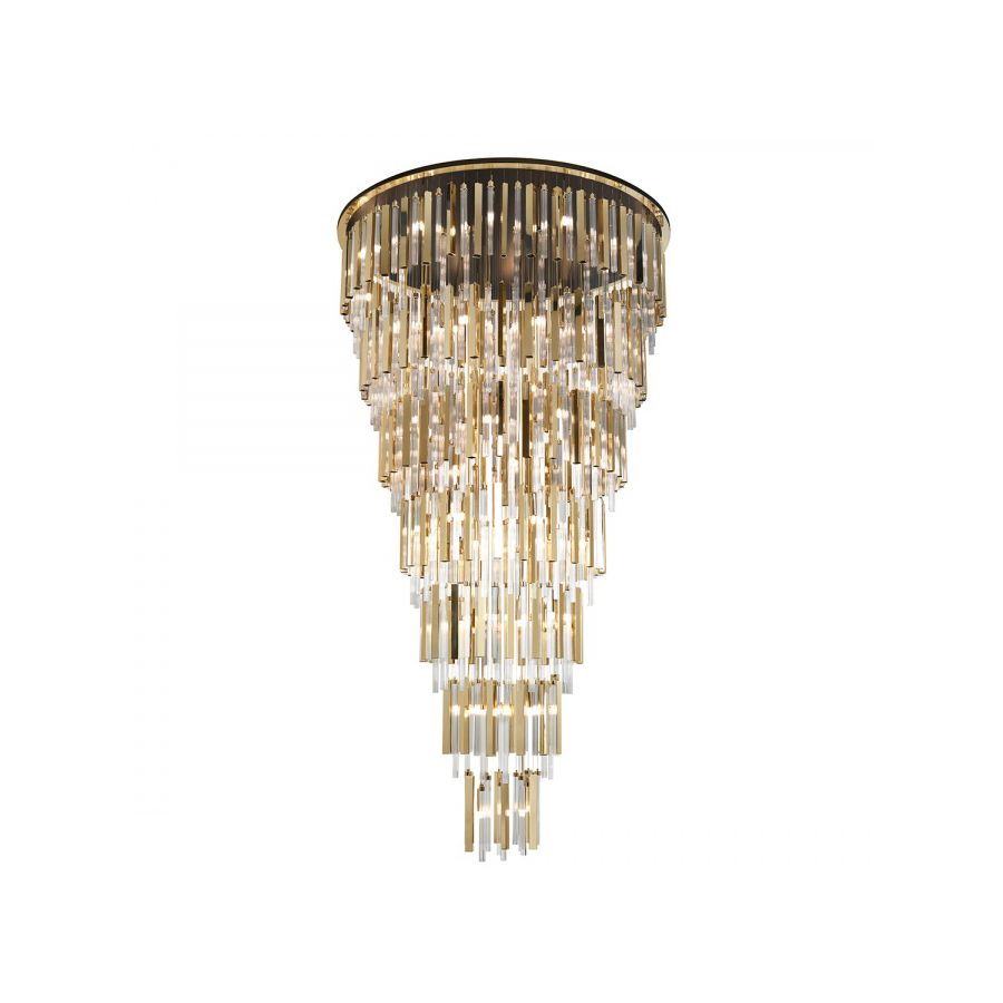 Denna lyxiga ljuskrona har alternerande pendlar av guldpläterad mässing, förstklassigt glas och glödlampor som skapar en brinnande effekt när ljuset bryter igenom de små mellanrummen däremellan. En kraftfull och extravagant upphängning som kommer att få dig att tappa andan och förundras.