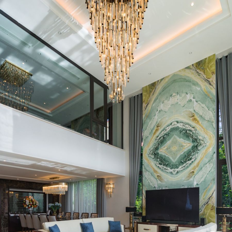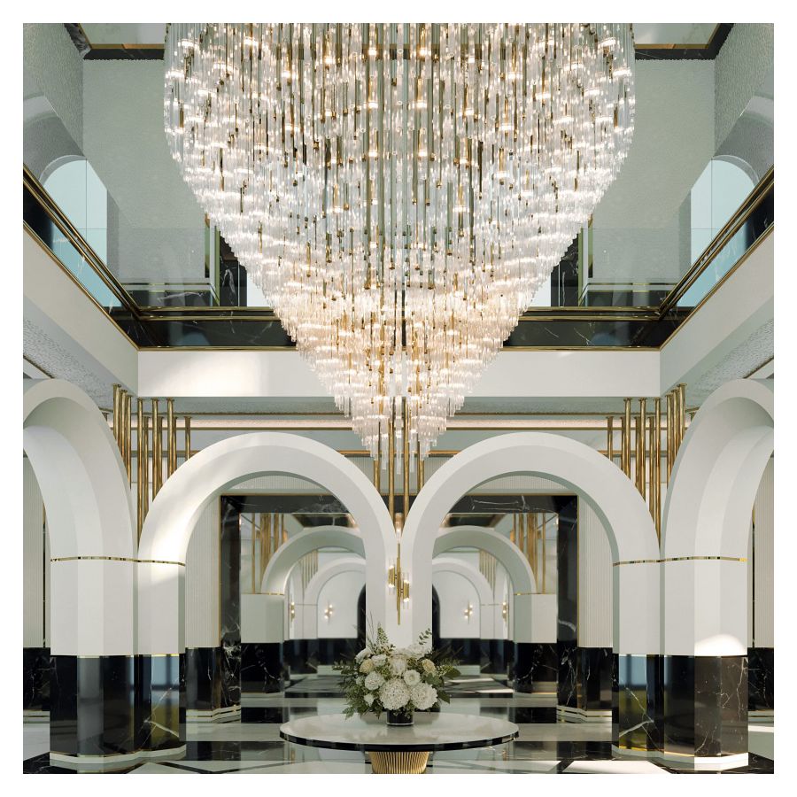 Den rekommenderas för höga tak och storslagna utrymmen, såsom hotellobbyn eller trappor i två plan, och passar bäst i kombination med moderna eller art déco-inredningsstilar.