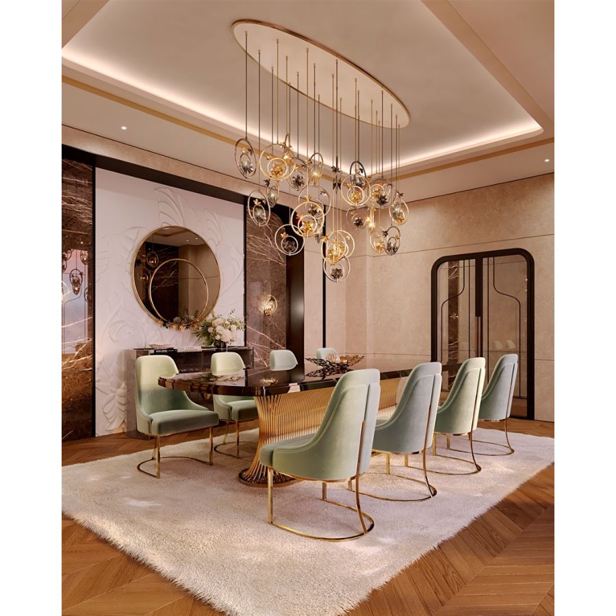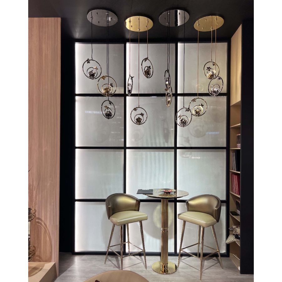 Handgjord av förgylld mässing, varje kurva och detalj är utförd med det tålamod och den precision som finkonsten kräver. Den varma, luminösa ytan reflekterar inte bara ljus — den tycks frambringa det, och kastar ett mjukt, himmelskt sken som erinrar om de himmelska scener som gjorde Botticelli odödlig. Hängande ovanför ett storslaget matbord, placerad i en svepande foajé eller utvald som den krönande gesten i en lyxig inredning, gör Botticelli-suspensionen det som endast de finaste föremålen kan: den får ett rum att kännas som om det alltid var menat att vara vackert.
