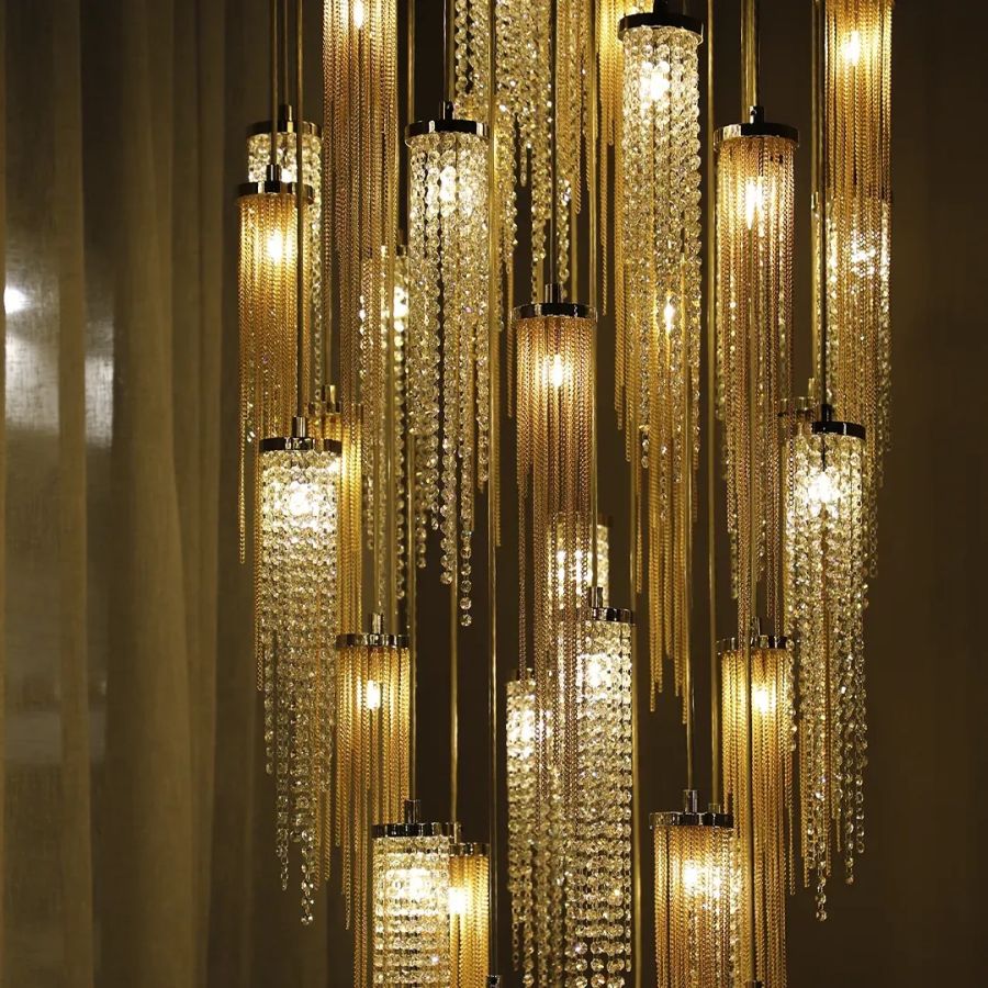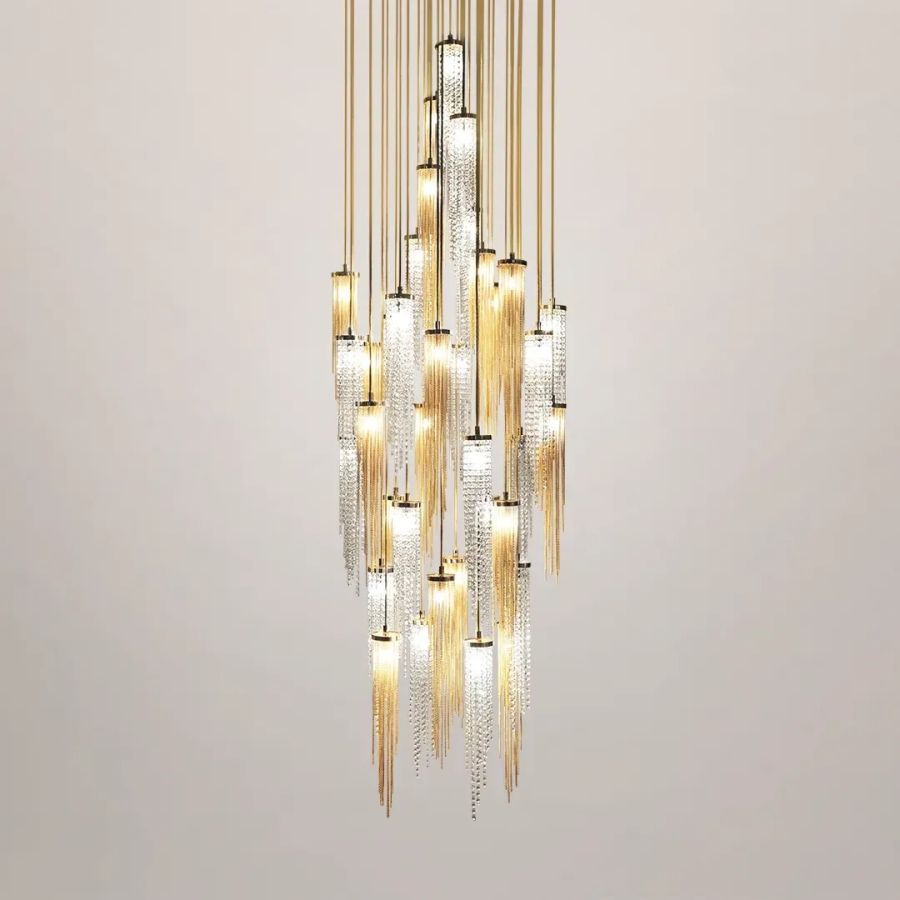 Varje kristall är noggrant utformad för att fånga och sprida ljus i ständigt skiftande mönster, vilket framkallar den ljusa pulsen hos en stad i den gyllene timmen. Burj Suspensions avlånga silhuett tar plats i det vertikala rummet med auktoritet, och förvandlar en armatur till ett uttryck för höjd, rörelse och förfinad dramatik.