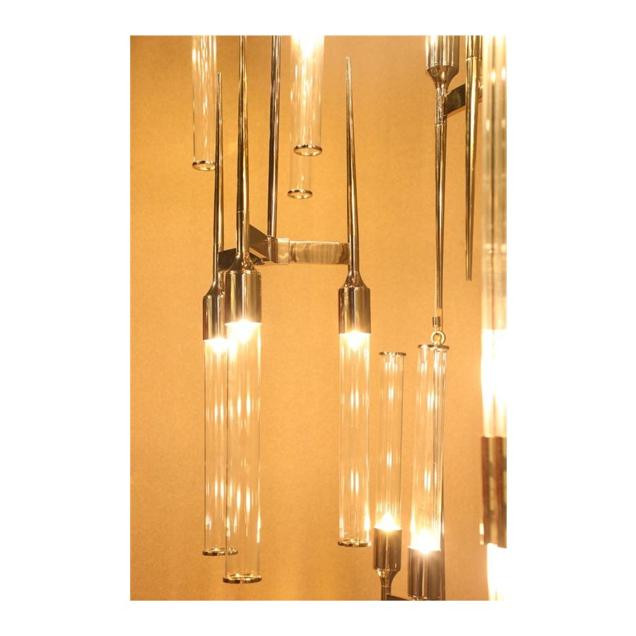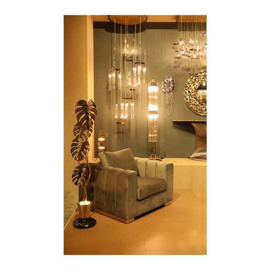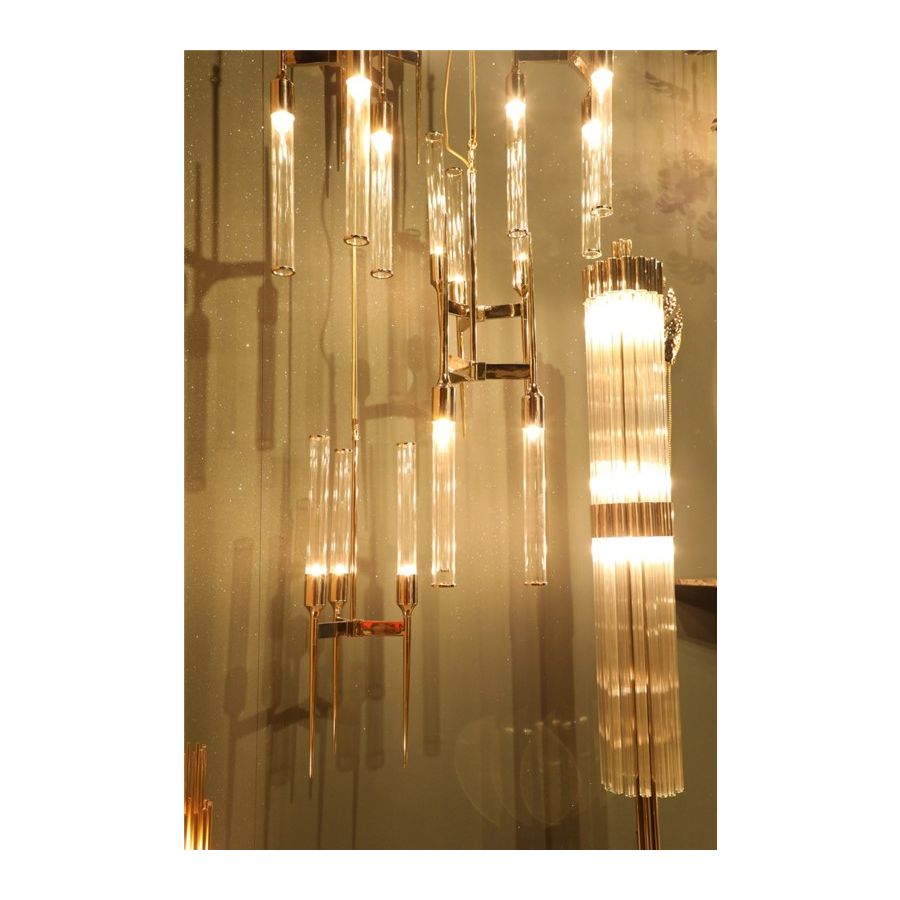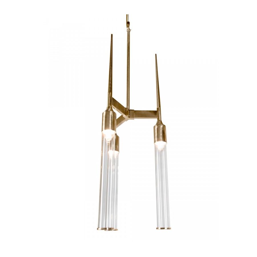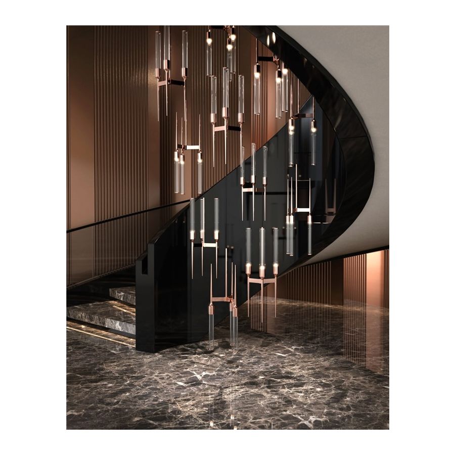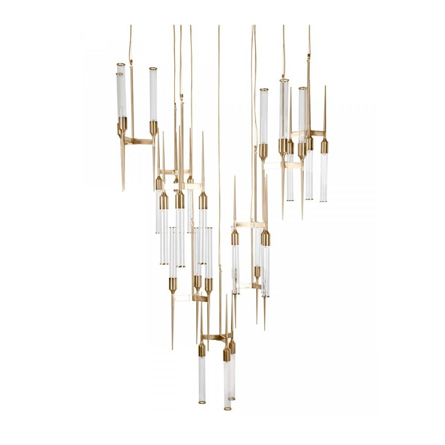 Denna handgjorda armatur är tillverkad av guldbelagd mässing, de starka linjerna skapar en organisk rörelse av subtila mässingsrör som kompletterar den lyxiga kronan med klart glas. Om du tittar tillräckligt noggrant påminner de förlängda rören om hängande stalaktit- och stalagmitformer. Smidda av erfarna hantverkares händer kan den förvandla bostadsutrymmet till en storslagen äventyrlig scenografi. Denna finaste belysningsdesign är ett vackert tillskott som kompletterar hotellobbyn, stora korridorer, långa trappor eller det rymliga vardagsrummet.