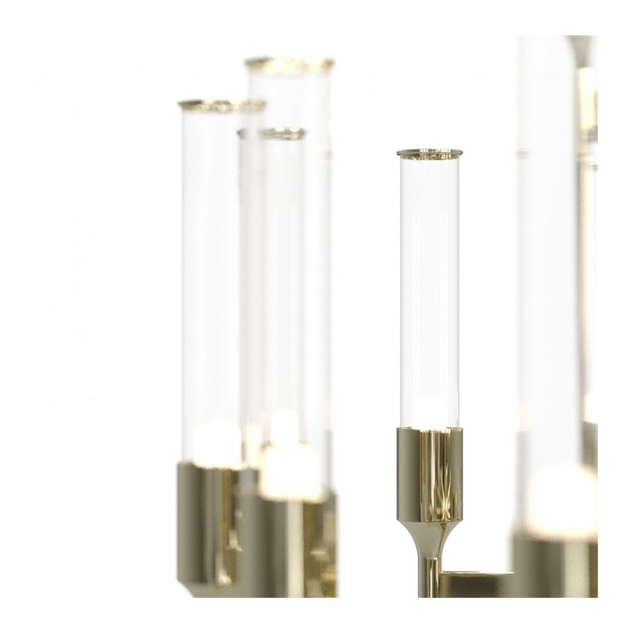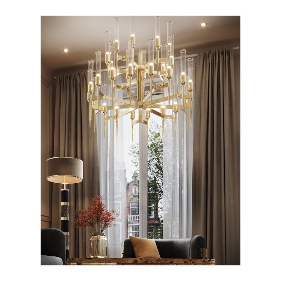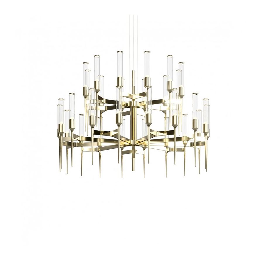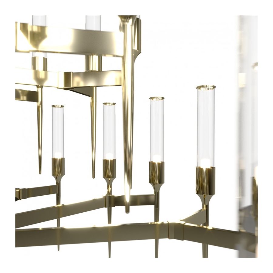 Denna nya handgjorda belysningsversion är gjord av guldpläterad mässing, med två nivåer av kraftfulla linjer, och kompletterar den lyxiga ljuskronan med klart glas.