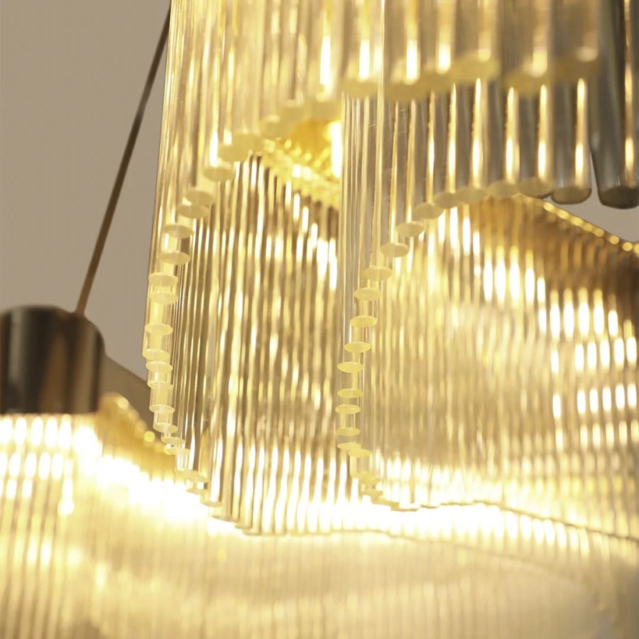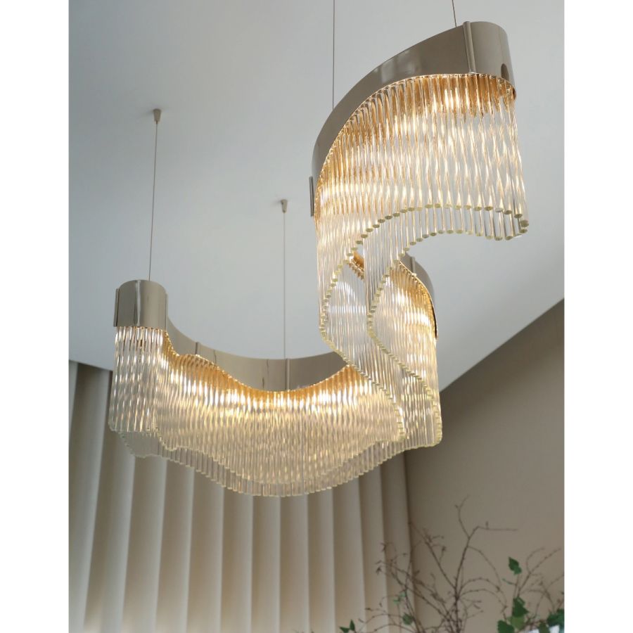 Detta är ett nytt belysningsmästerverk som omdefinierar elegans genom sin fängslande design och sina anpassningsbara funktioner. Inspirerad av visionen hos en krävande kund fångar denna abstrakta ljuskrona flytets väsen med sina intrikata kurvor och vågor som tycks dansa i luften.