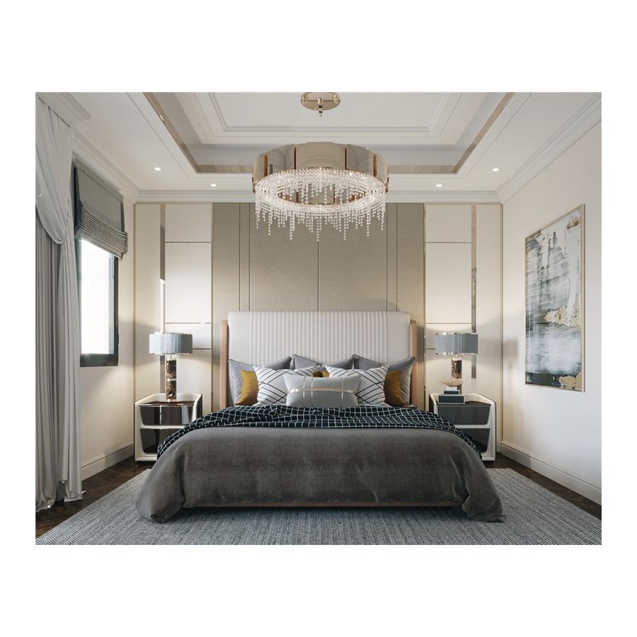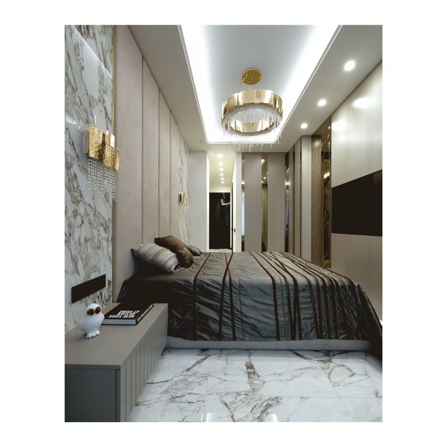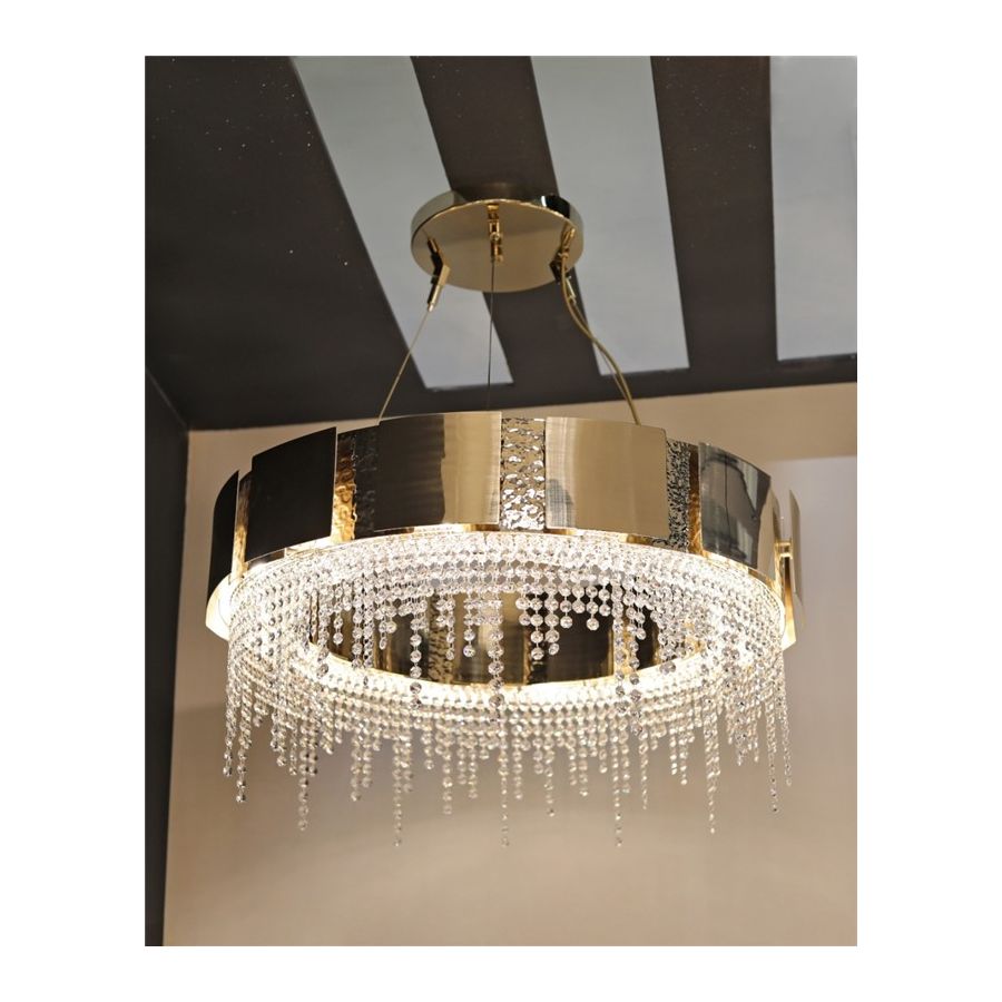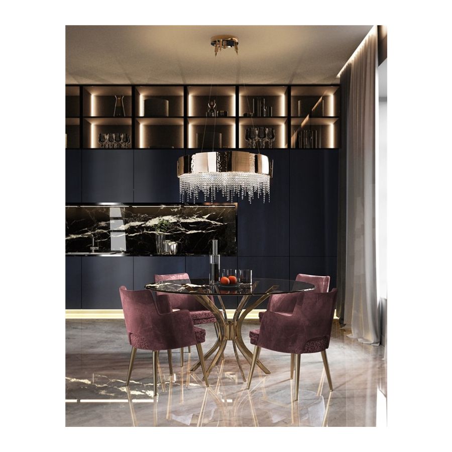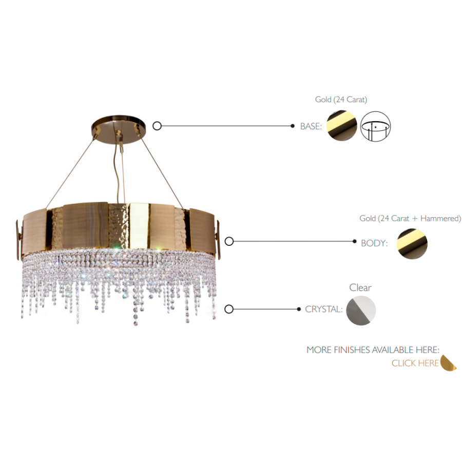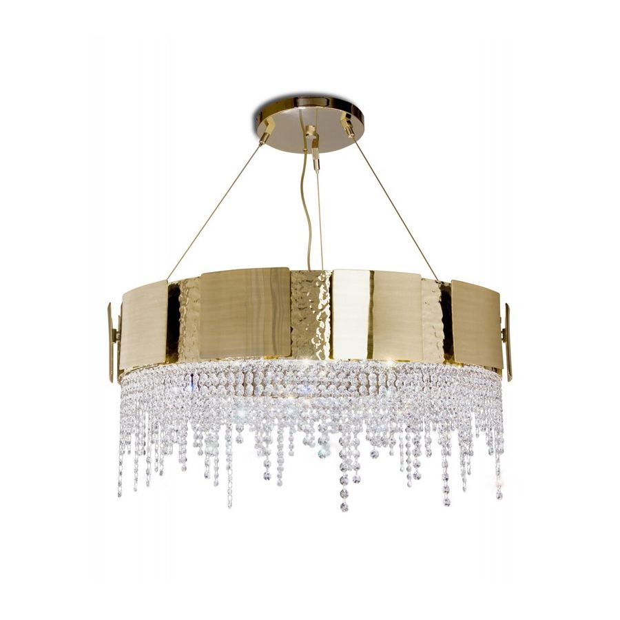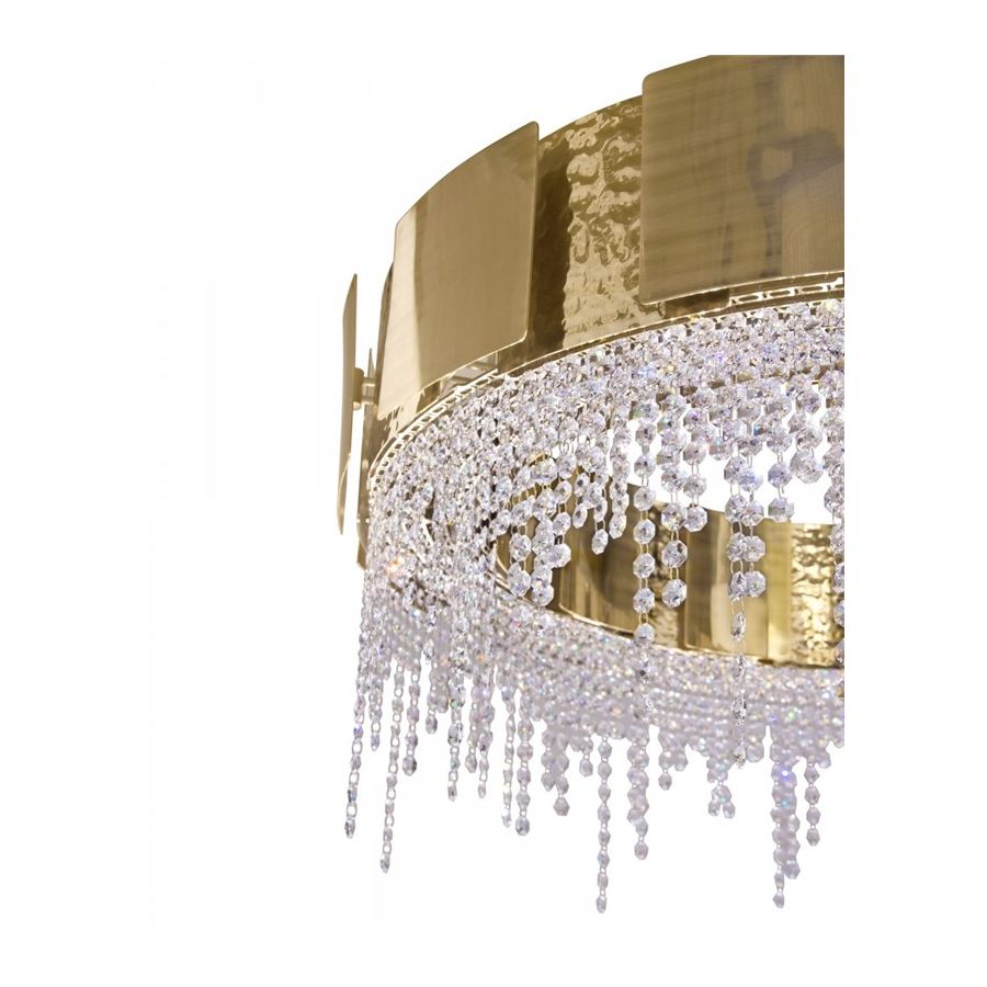 Denna unika skräddarsydda belysningsprodukt kombinerar två olika ytbehandlingar – borstad och hammrad – applicerade för hand på den förgyllda mässingen prydd med delikata kristaller. Ljuset strävar efter att förmedla balans genom kvadratiska former som leder till en mjuk ljusspridning, vilket ger den omgivande platsen en alltid perfekt inbjudande atmosfär.