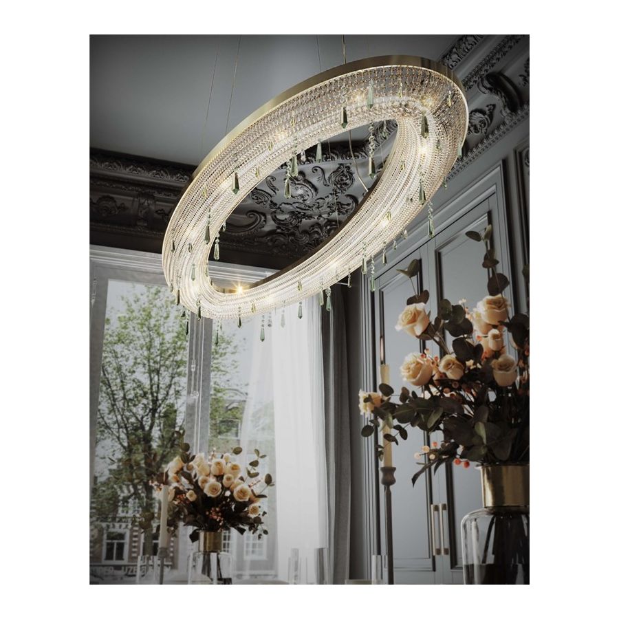 En förgylld mässingskonstruktion i kombination med kristallernas briljans och unikhet ger denna pendel ett uttryck av lyx som ger varje rum en överlägsen och prestigefylld känsla. En sista touch av sofistikerade, upphängda kristaller, som representerar Niobes tårar, gör detta föremål oförglömligt.