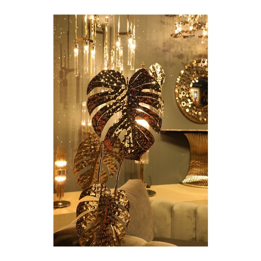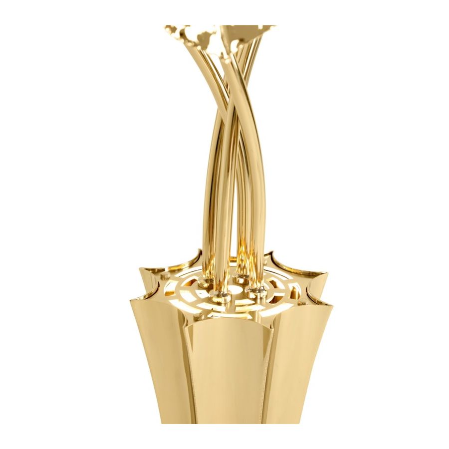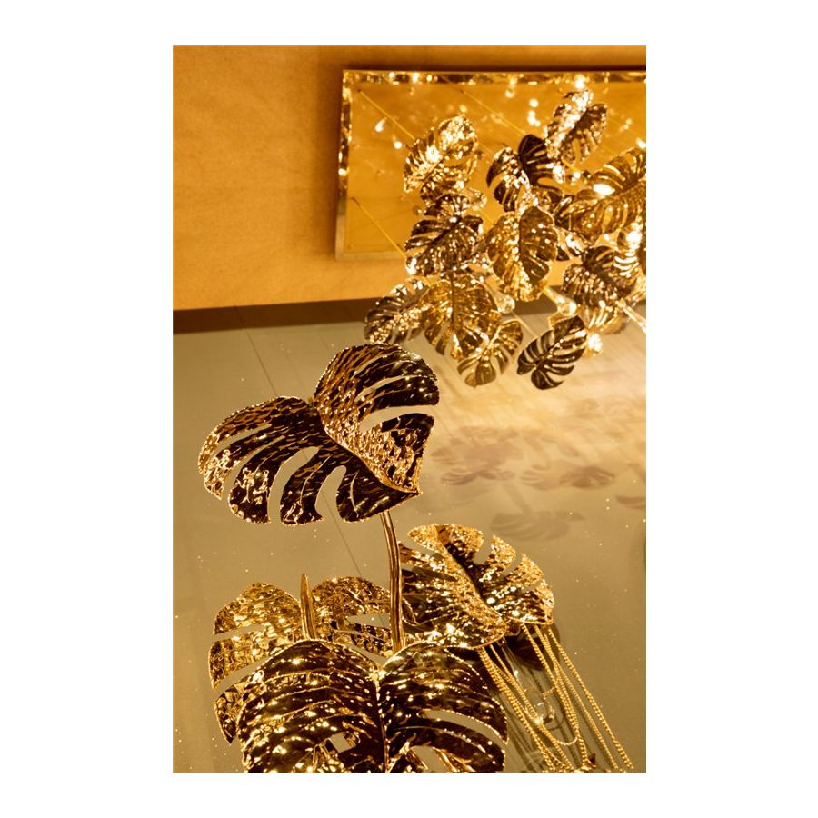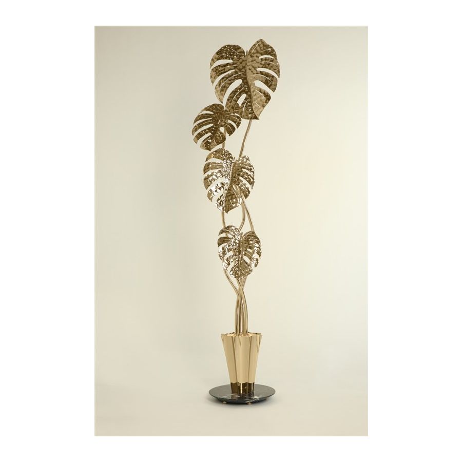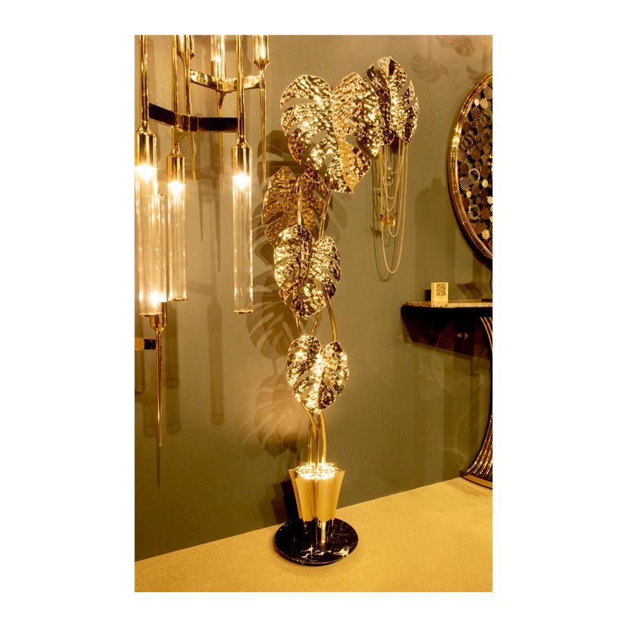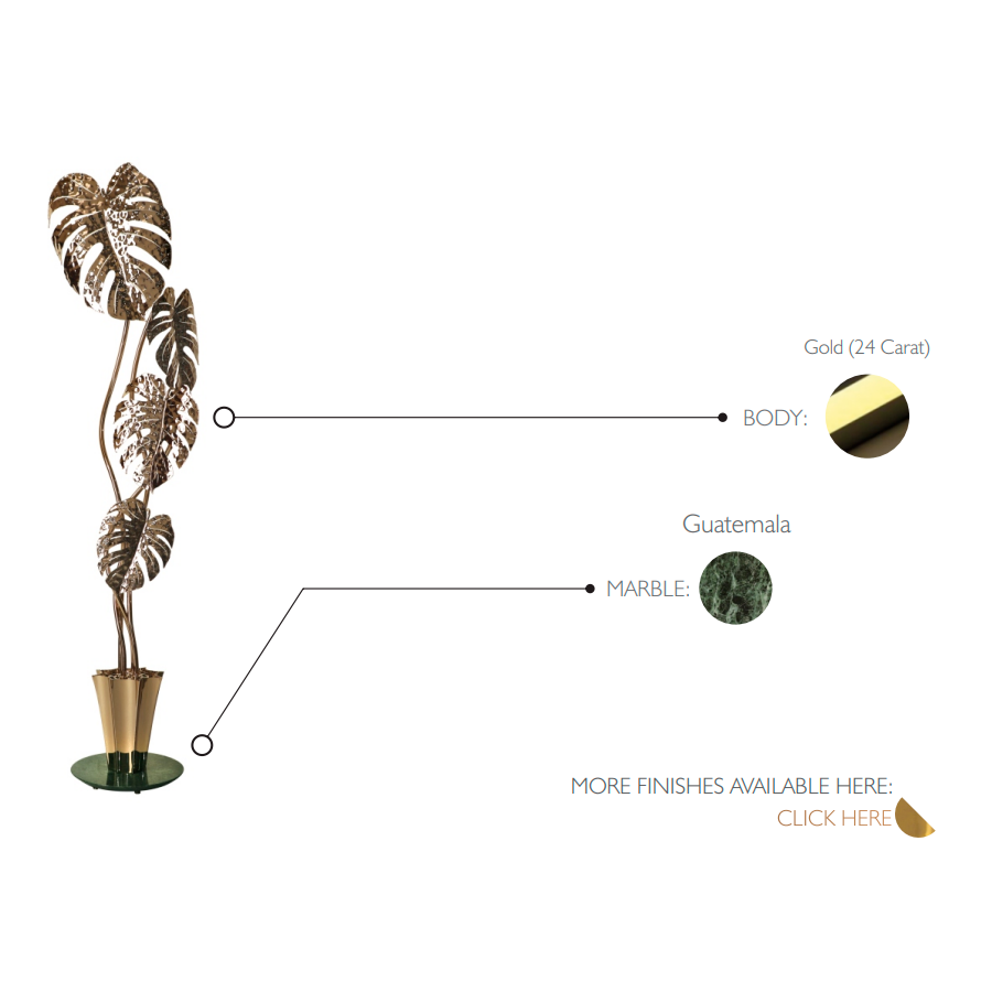 Regnskogskollektionen uppstod ur den tidlösa belysningshyllningen av naturens silhuetter, dess element och rörelser. Fördjupa dig i den magnifika atmosfären i den gnistrande regnskogen där konsten av mässingshantverk blir lyxig belysningsdesign. Den ultimata fusionen mellan den konstnärliga designen, äktheten i traditionella portugisiska metallarbetsmetoder och kreativt hantverk. Regnskogsgolvlampan är oöverträffad i den förfining och nåd den representerar. Den förgyllda mässingen i kombination med klar Marquina-marmor - applicerad för hand - ger en delikat karisma som liknar natur i full blom. Ett bredbladigt mästerverk som sammanförs genom denna moderna belysningsdesign och tar dig till avlägsna platser och den öppna himlen. En samtida golvlampa som skapar en exceptionell atmosfär i eleganta interiörer. Som en golvväxt reser sig denna pjäs ur ett förgyllt kärl varifrån ljuset färdas upp mellan bladen och skapar en känsla av surrealistisk natur, och förstärker den perfekta estetiken av vild flora för alla scenarier.