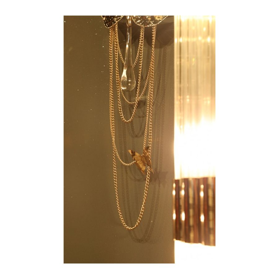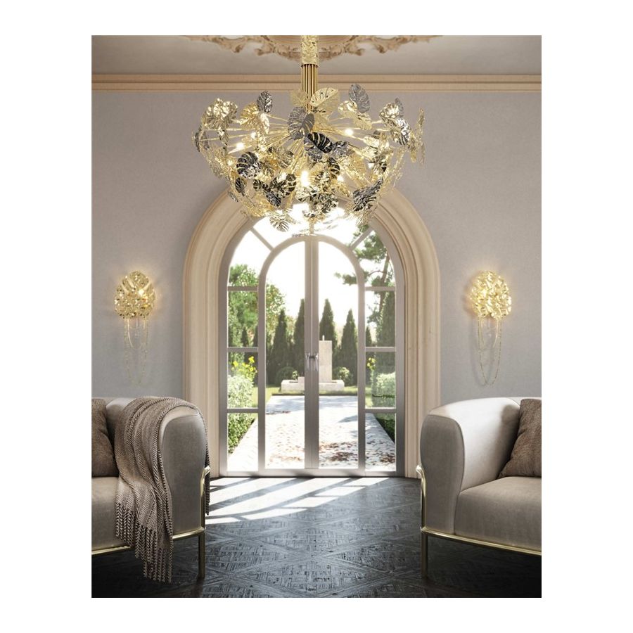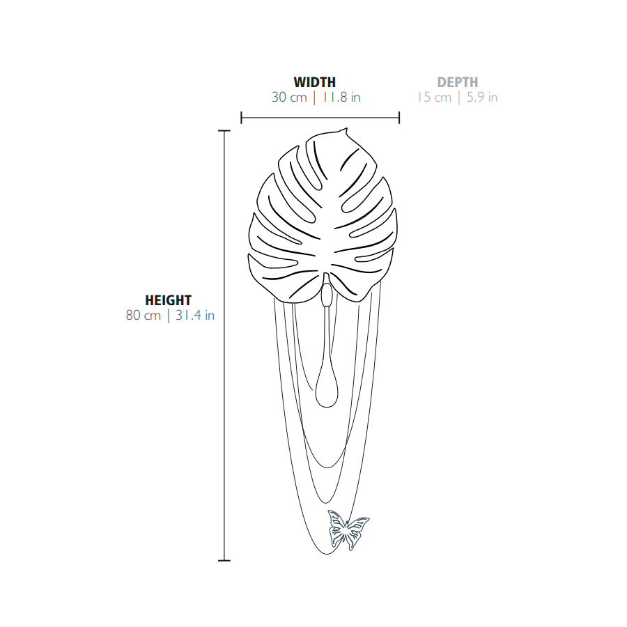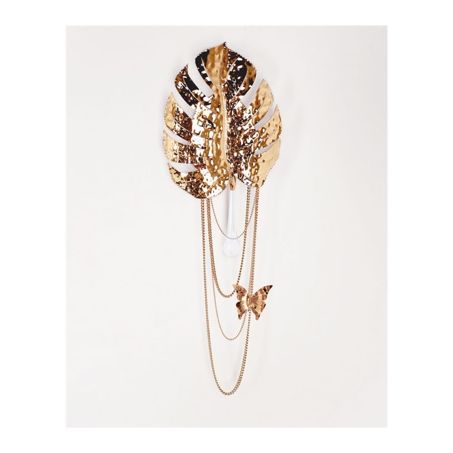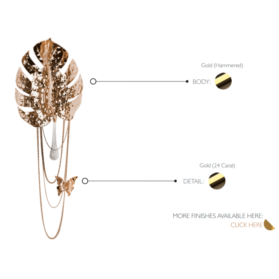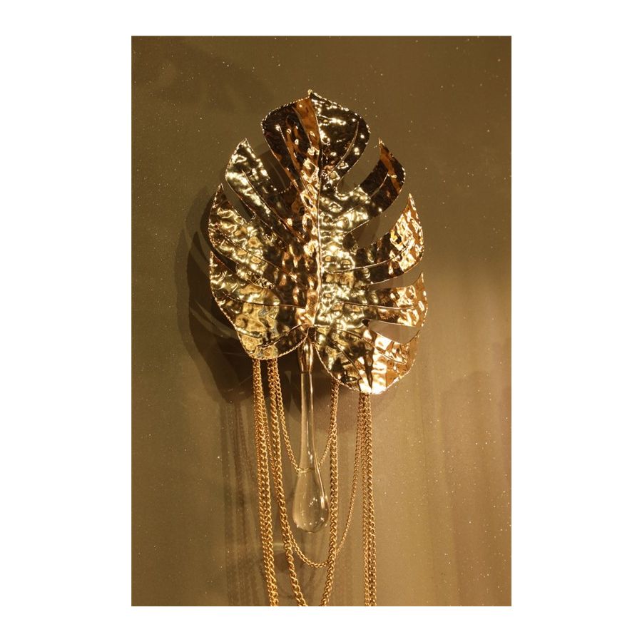 Regnskogsvägglampan är oöverträffad i den förfining och elegans den representerar. Den guldpläterade mässingen tillsammans med klart kristallglas - applicerat för hand - ger en delikat karisma som liknar naturen i full blom. Ett bredbladigt mästerverk av modern belysningsdesign tillsammans med den fallande regndroppen tar dig till avlägsna platser och den öppna himlen. En drömsk vägglampa som skapar en exceptionell atmosfär i eleganta interiörer.