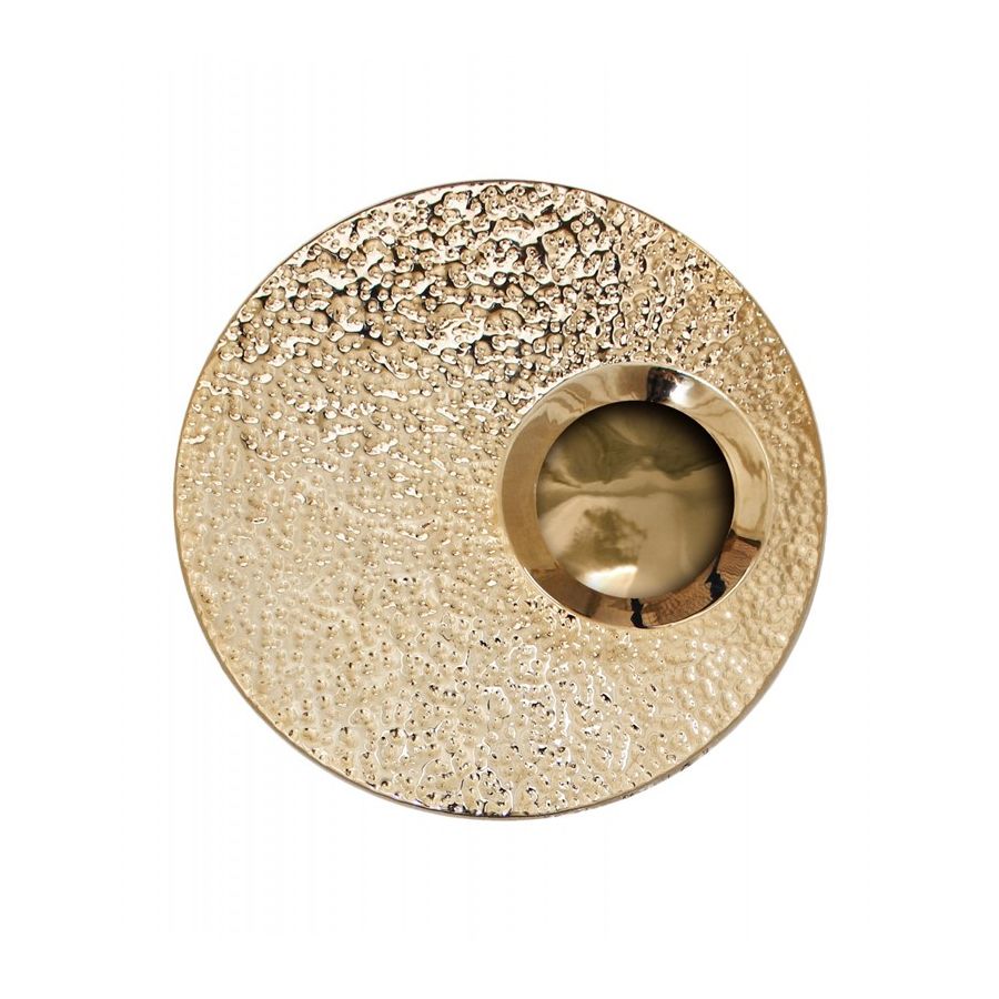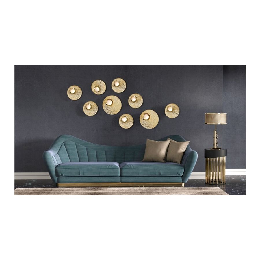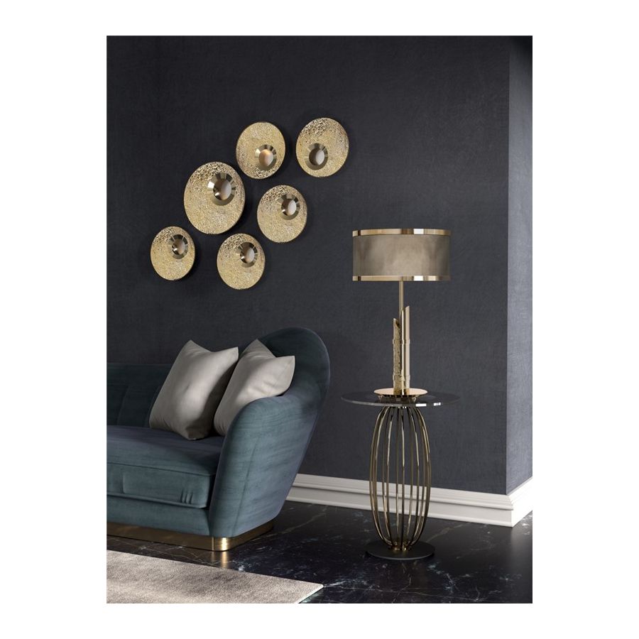 Denna vägglampa skapades för att vara perfekt, funktionell och praktisk. Den hamrade guldbelagda mässingen, tillåter ljuset att sprida sig till det omgivande utrymmet och skapar den perfekta atmosfären i området. Ravel vägglampa passar perfekt ovanför en modern konsol eller som entré i en hotellkorridor.