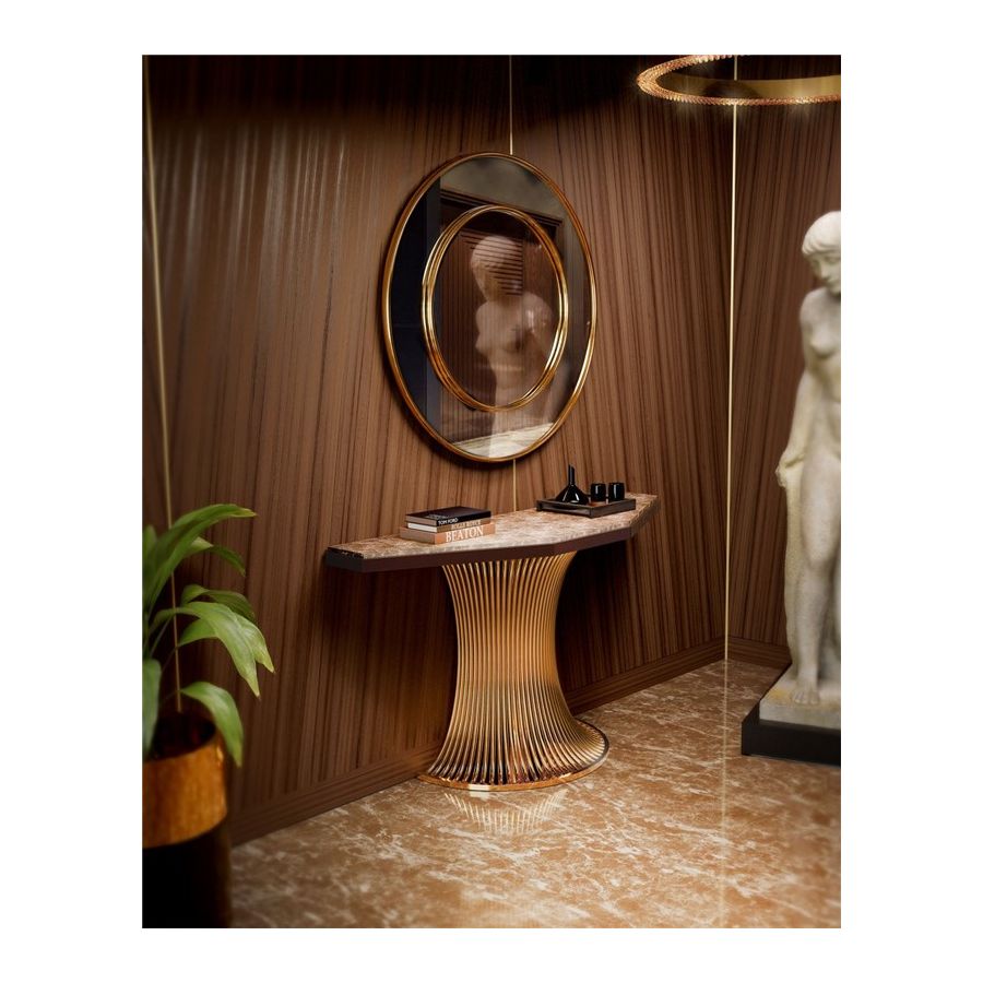 Roma Mirror är den eleganta symbolen för självförtroende och djärvhet. Med ett ambitiöst fokus på enkelhet, rena linjer och råa material hyllar den en slank modern design. Som gestaltad i formen av en konceptuellt, visuellt och konstnärligt fulländad cirkel antyder denna möbelfunktion en nyskapande tolkning av samtida elegans.
