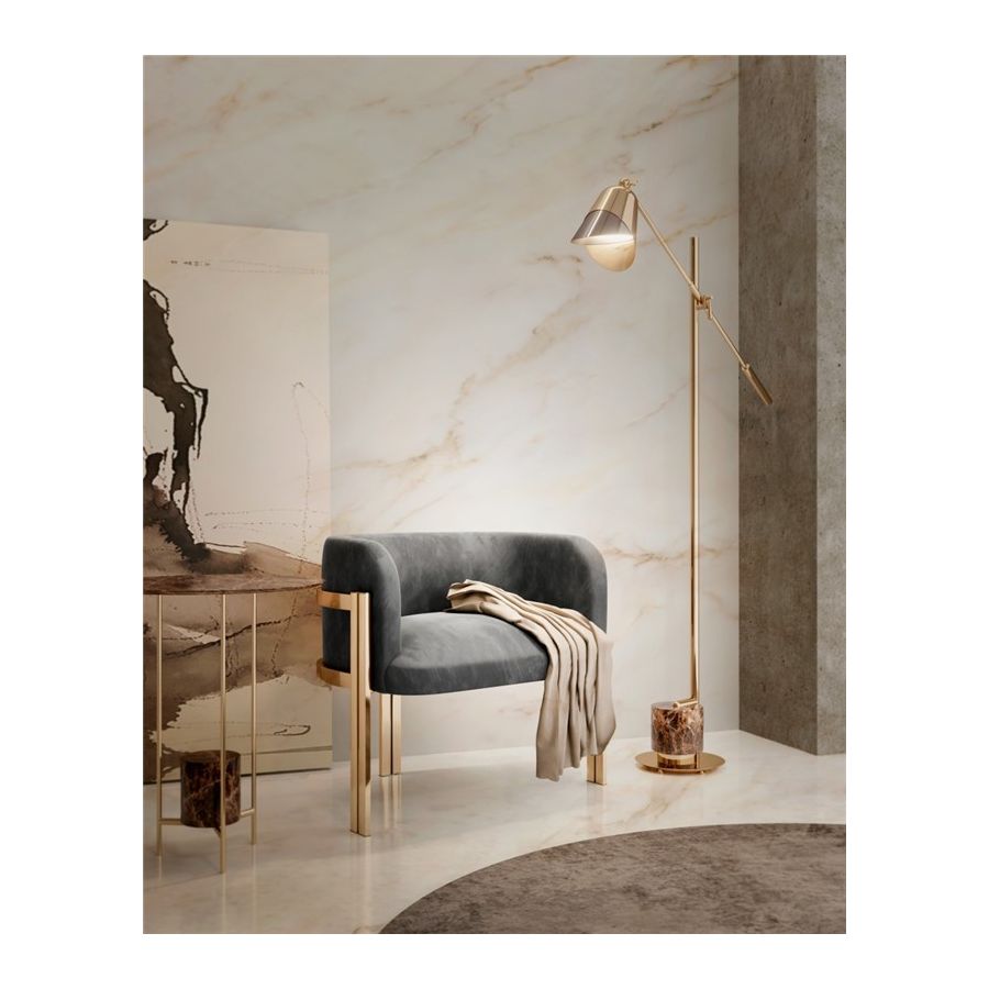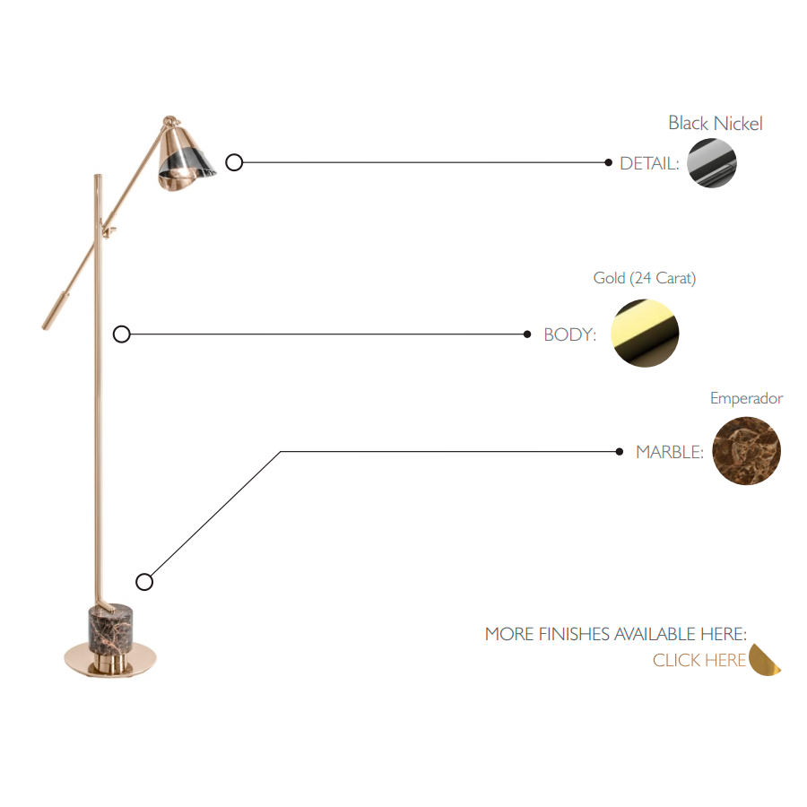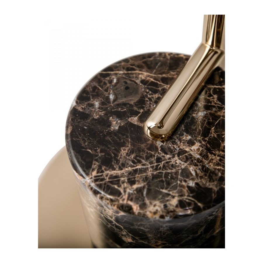 Basen på den handgjorda belysningsdesignen är detaljerad med en bas i emperadorbrun marmor, utformad i en cylindrisk form, avslutande med ett massivt guldpläterat fat. En kombination av råhet, delikata detaljeringar och förfinad design. Denna golvlampa i guld och marmor passar utmärkt till inredningar av olika koncept: antingen mid-century modern eller art deco.