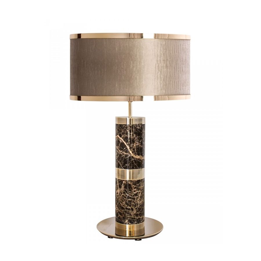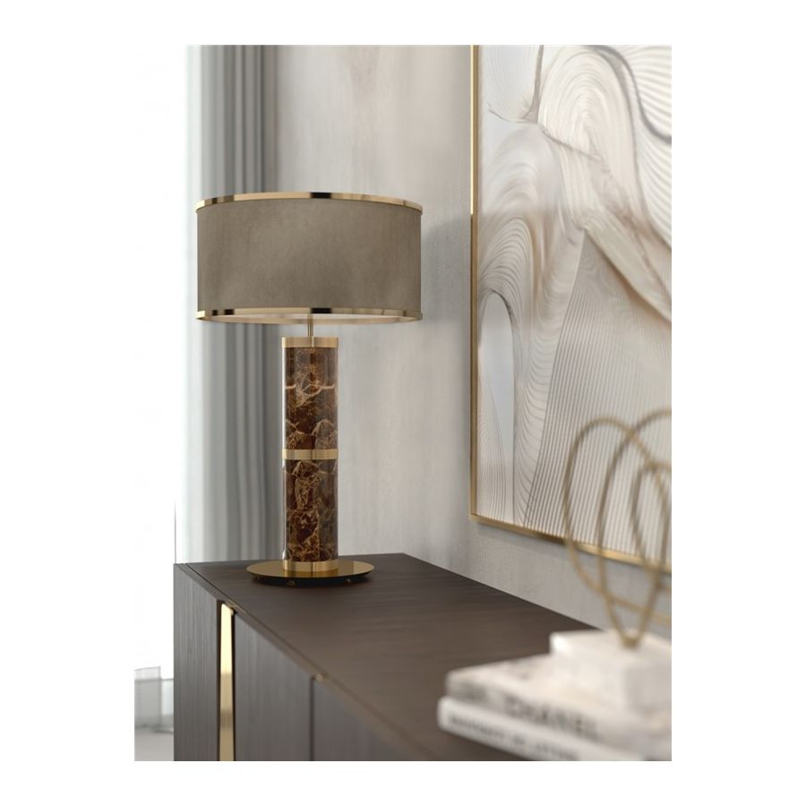 Hantverksmässigt tillverkad i mässing och marmor är själva kroppen av föremålet utförd i en guldbelagd finish för att betona dess lyxiga karaktär. Sparta-bordslampan passar perfekt i neutrala miljöer med slanka linjer och ger en glamorös känsla.