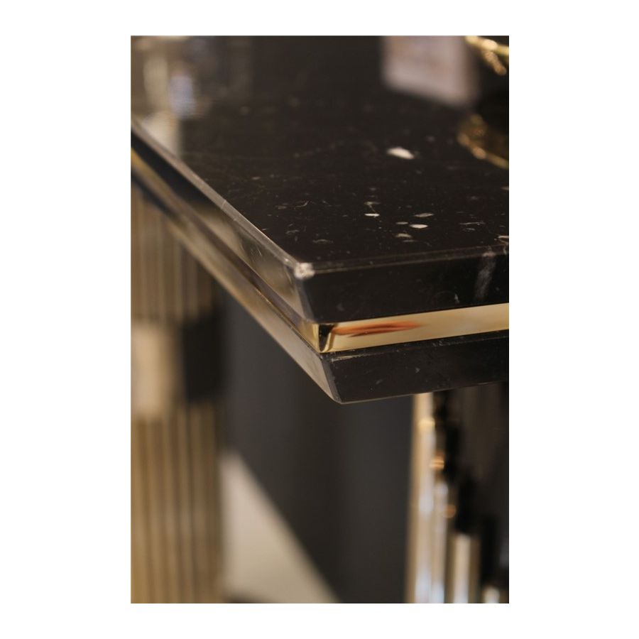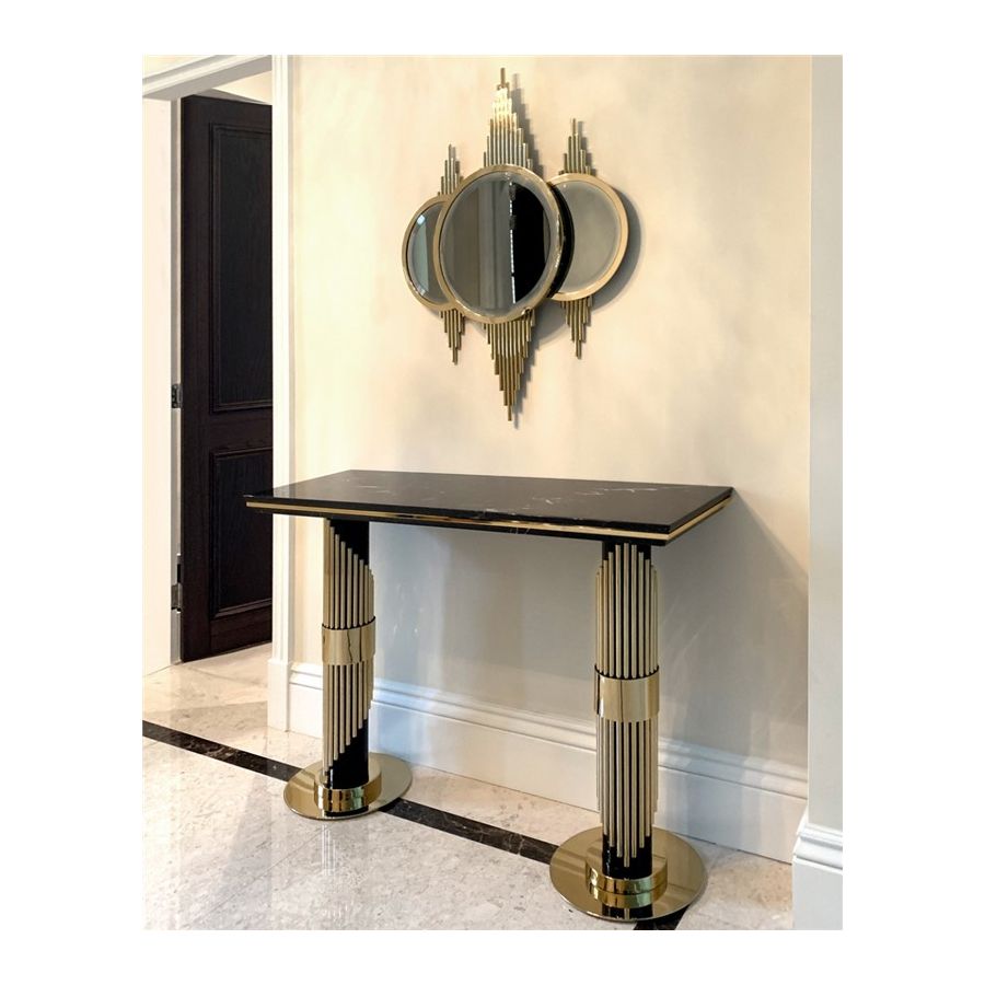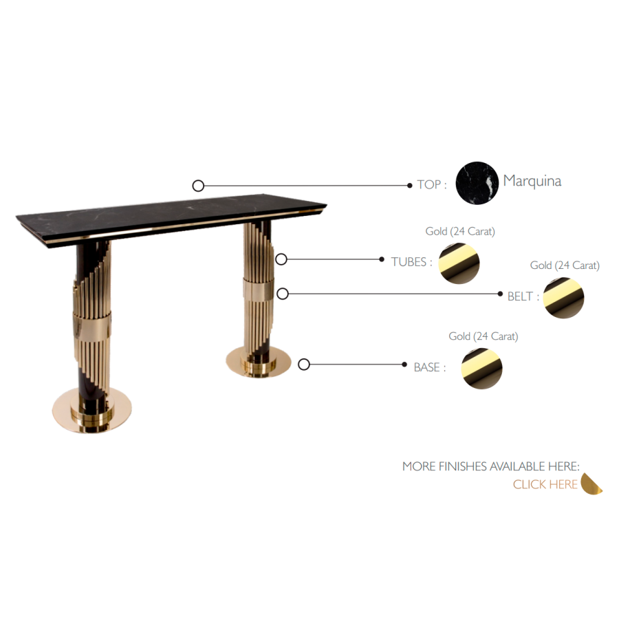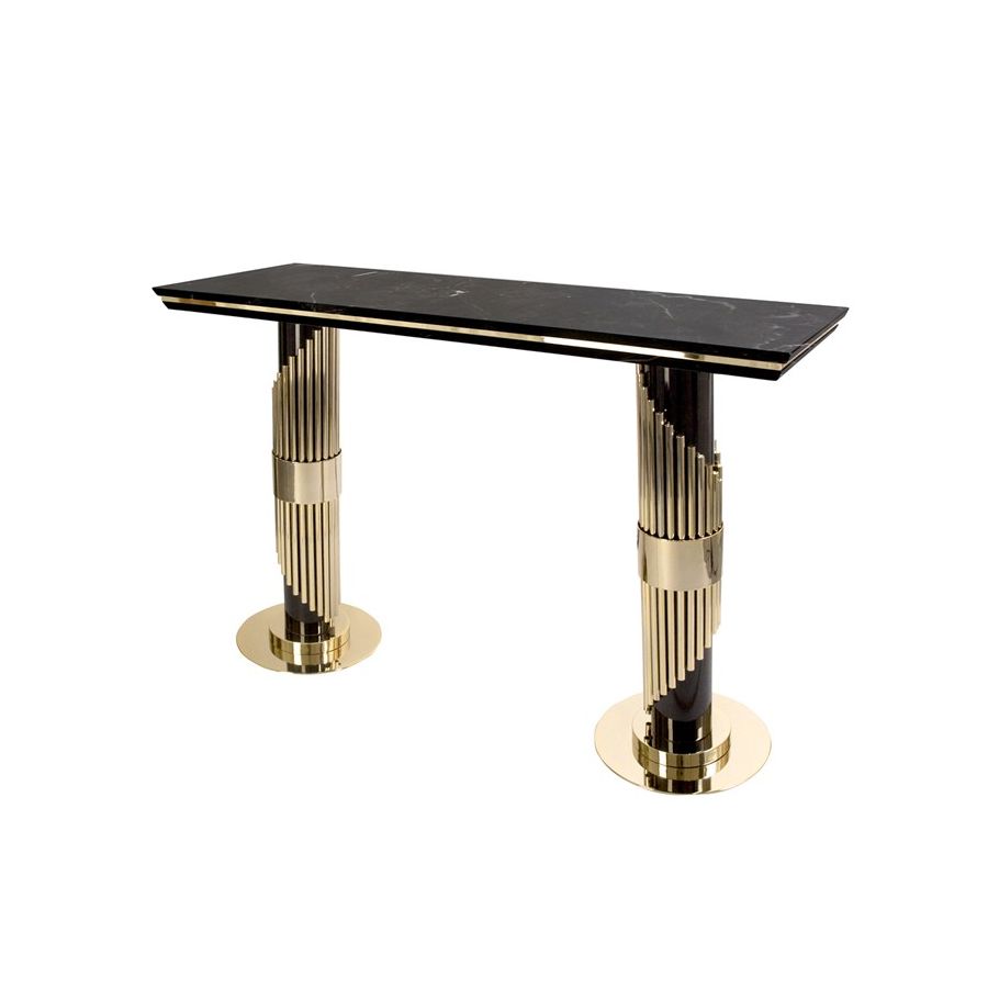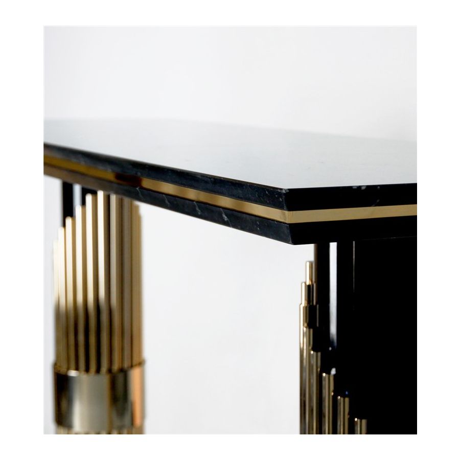 Denna eleganta konsol har långa guldpläterade mässingsrör som ger alla designer ett helt exklusivt och lyxigt utseende, och placerar dem på en annan nivå genom sin distinkta framtoning. Denna kombination av rika material, såsom mässing och svart Marquina-marmor, och slanka linjer inspirerade av art déco-arkitektur gör Streamline-konsolen eftertraktad.
