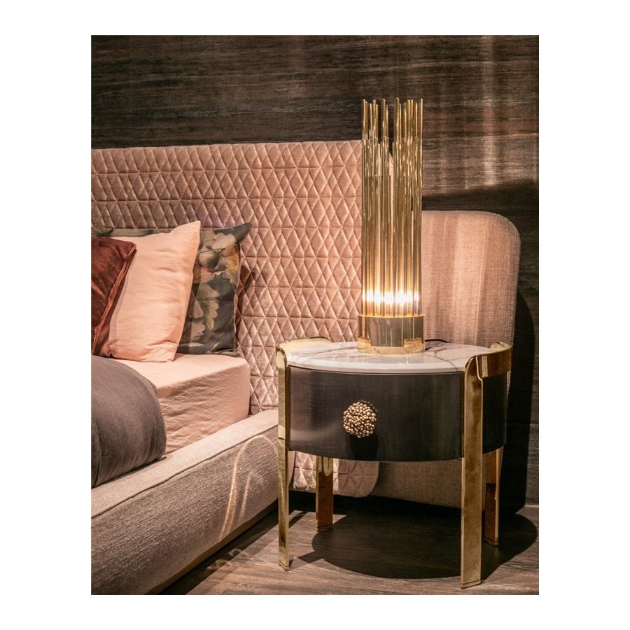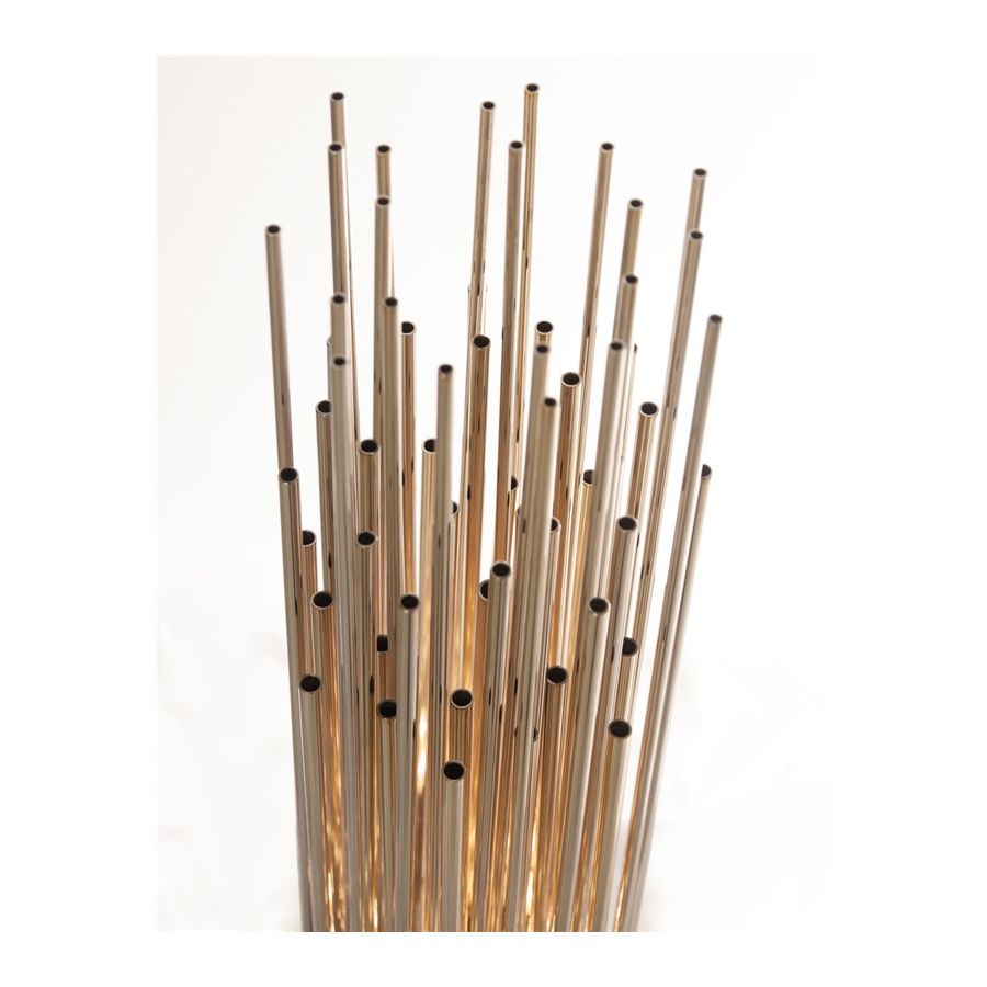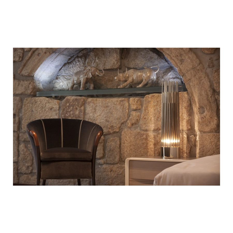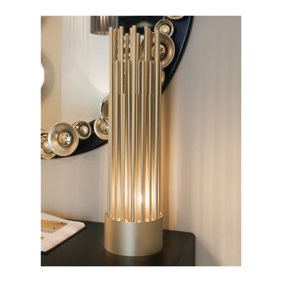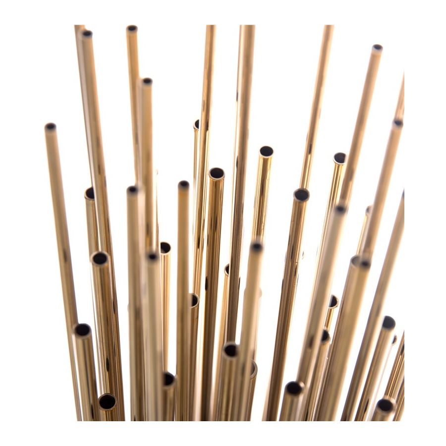 Denna pjäs utformades för att vara distinkt och sticka ut i sitt utförande, och blir den perfekta passformen för kurerade inredningar som kombinerar en mångfald av stilar. Denna eleganta bordslampa har långa förgyllda mässingsrör som ger designen ett helt exklusivt och lyxigt utseende, och tar uttrycket till en ny nivå med sitt karaktäristiska utseende. Denna kombination av rika material och slanka linjer inspirerade av art-deco-arkitektur gör Streamline-bordslampan eftertraktansvärd.