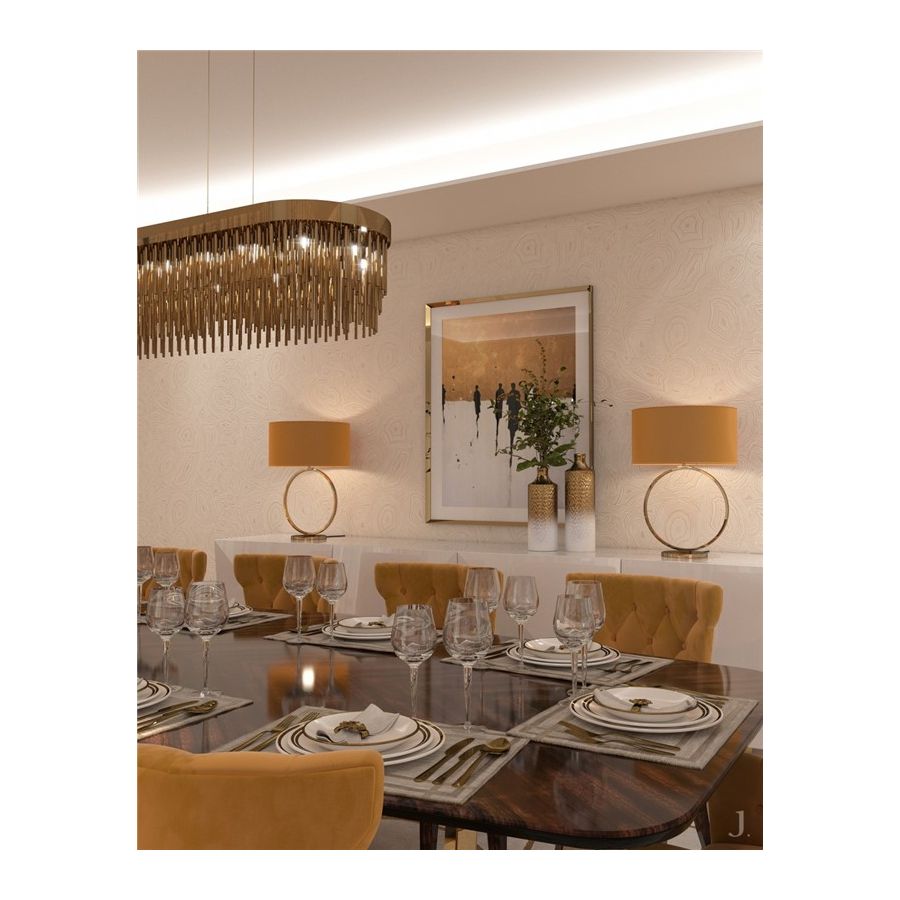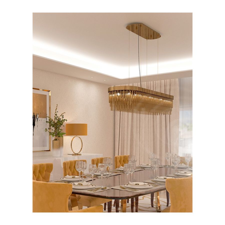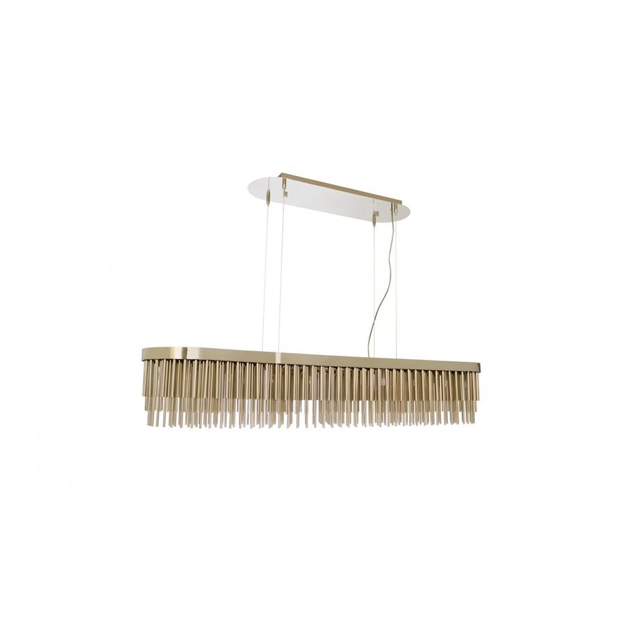 Denna pjäs skapades för att vara distinkt och utmärka sig genom sin design, och blir den perfekta passformen för kurerade interiörer som kombinerar en mångfald av stilar. Denna eleganta pendel har långa guldpläterade mässingsrör som ger designen ett helt exklusivt och lyxigt utseende, och tar den till en ny nivå genom sitt distinkta utseende. Denna kombination av rika material och slanka linjer inspirerade av art déco-arkitektur gör Streamline-pendeln eftertraktad.