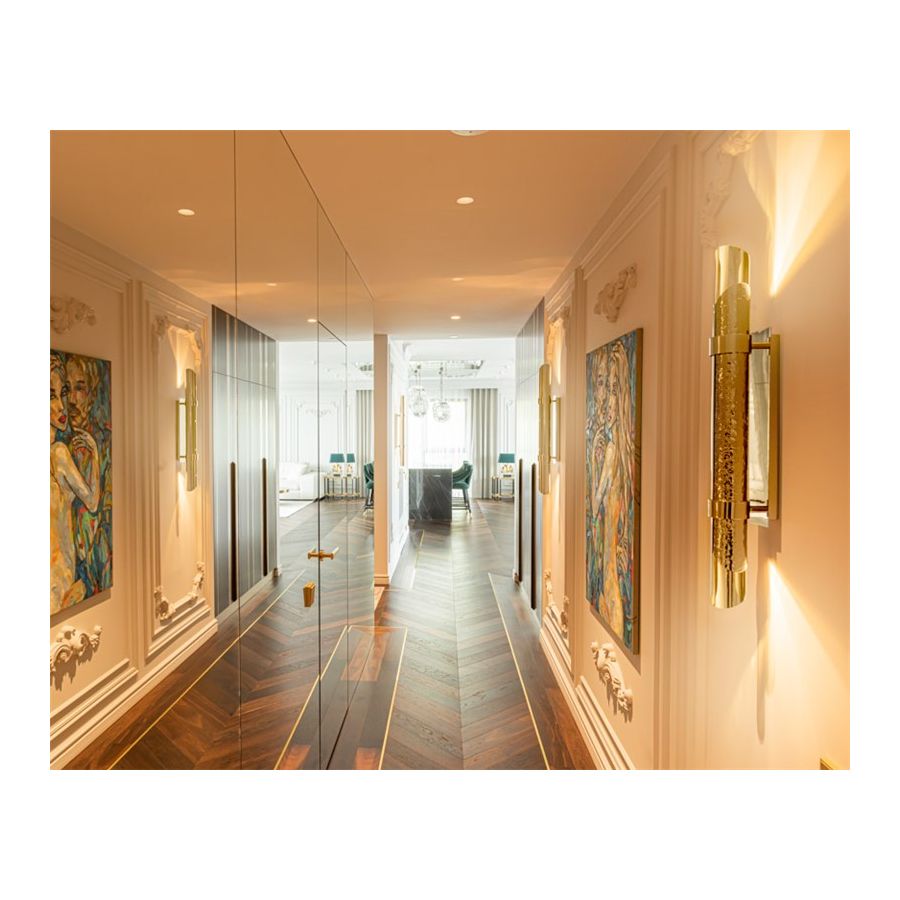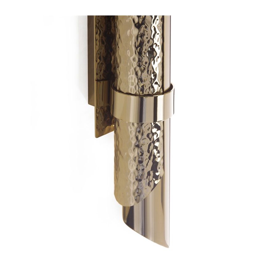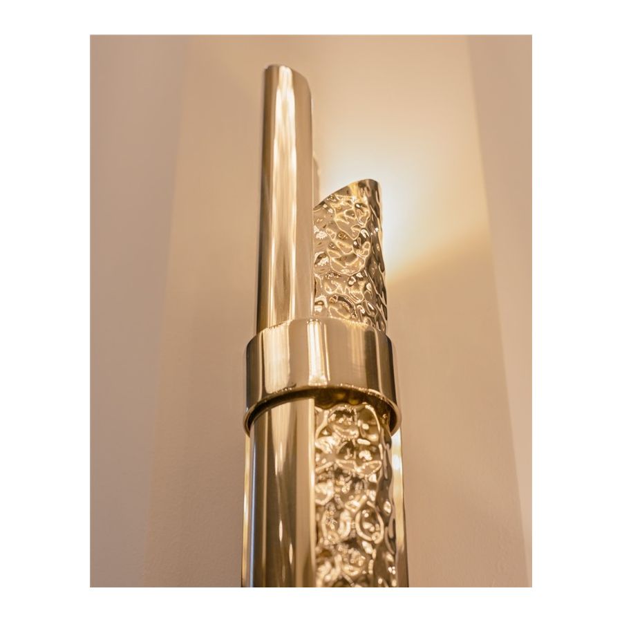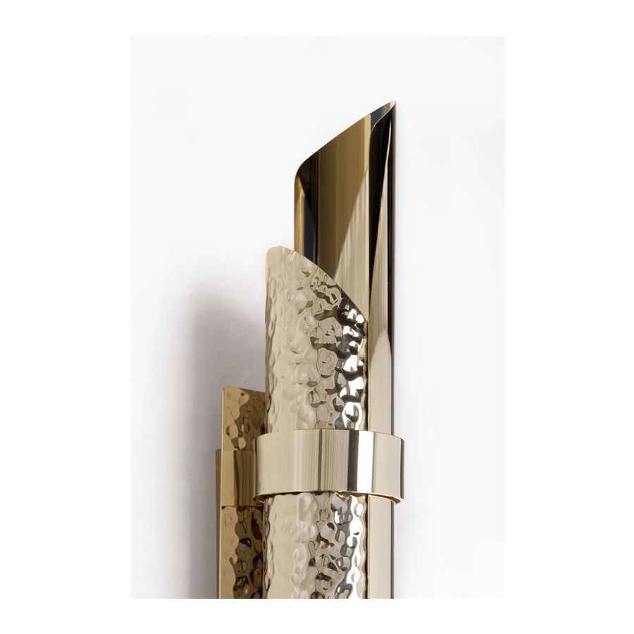 Triumph-vägglampan designades med stor stolthet för att passa i moderna lyxiga interiörer. Användningen av särskilda material såsom mässing gör den exklusiv. Dess design möjliggör skapandet av en vacker ljuseffekt. Denna handgjorda pjäs är ett utmärkt exempel på hur mindre är mer eftersom den endast består av två halva mässingsrör, det ena hamrat och det andra polerat.