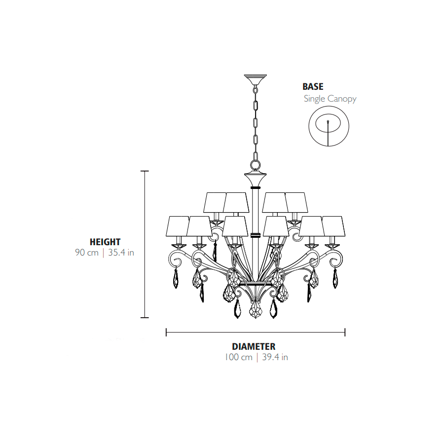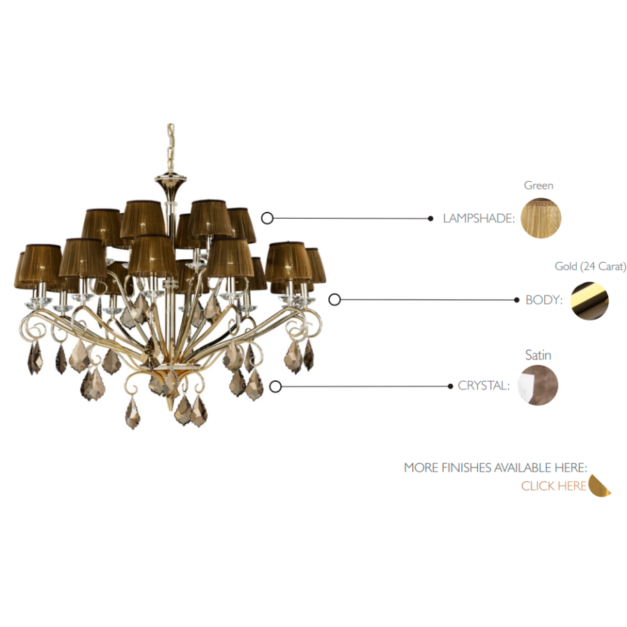 Wien-kristallkronan inrymmer en tidlös storslagenhet, full av lyxiga detaljer som tillförs genom användningen av ädla material såsom mässing, transparent glas och kristaller, och omsluter den omgivande ytan med elegans.