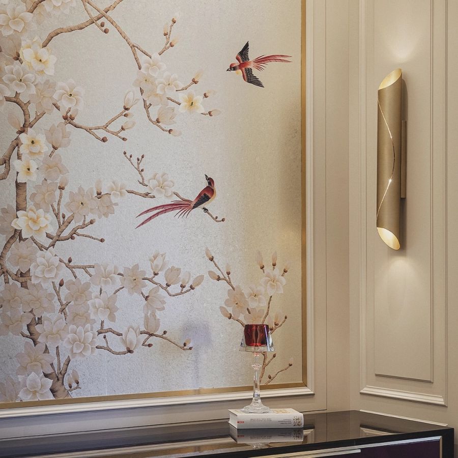 De rena och slanka linjerna hos denna moderna vägglampa avslöjar en ny syn på samtida förfining i belysningsdesignens värld. Den handgjorda vägglampetten liknar en utsökt balanserad kurva som vrider sig som ett snäckskal, eftersom dess guldbelagda mässingsrör böjs av händerna på erfarna hantverkare. Utformad för att ge en fin markering i varje interiör, förenar den modern enkelhet med en lyxig art-deco-tvist. En armatur perfekt för vardagsrum och hallar eller utrymmen som en restaurang eller bar om vi talar om kommersiella platser.