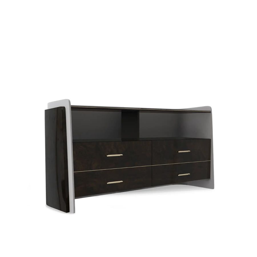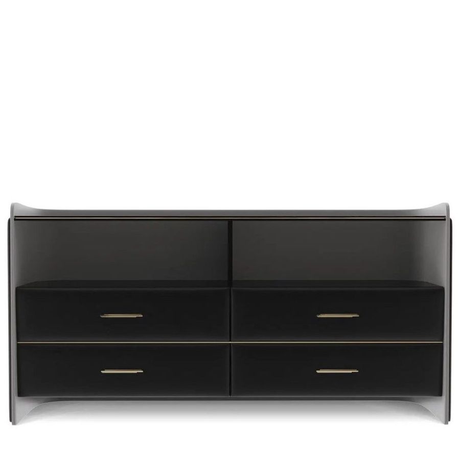 The Charla Dresser revolutionizes bedroom storage with its modern twist on a timeless and classic piece. This dresser has only the finest materials, such as polished brass, black lacquer, black and grey leather, walnut root, and smoked glass. Its design offers a premium yet versatile solution for organizing any bedroom or closet with a modern feel. With its boundless elegance and luxurious design, the Charla Dresser combines style and functionality, bringing sophistication to any interior decor.