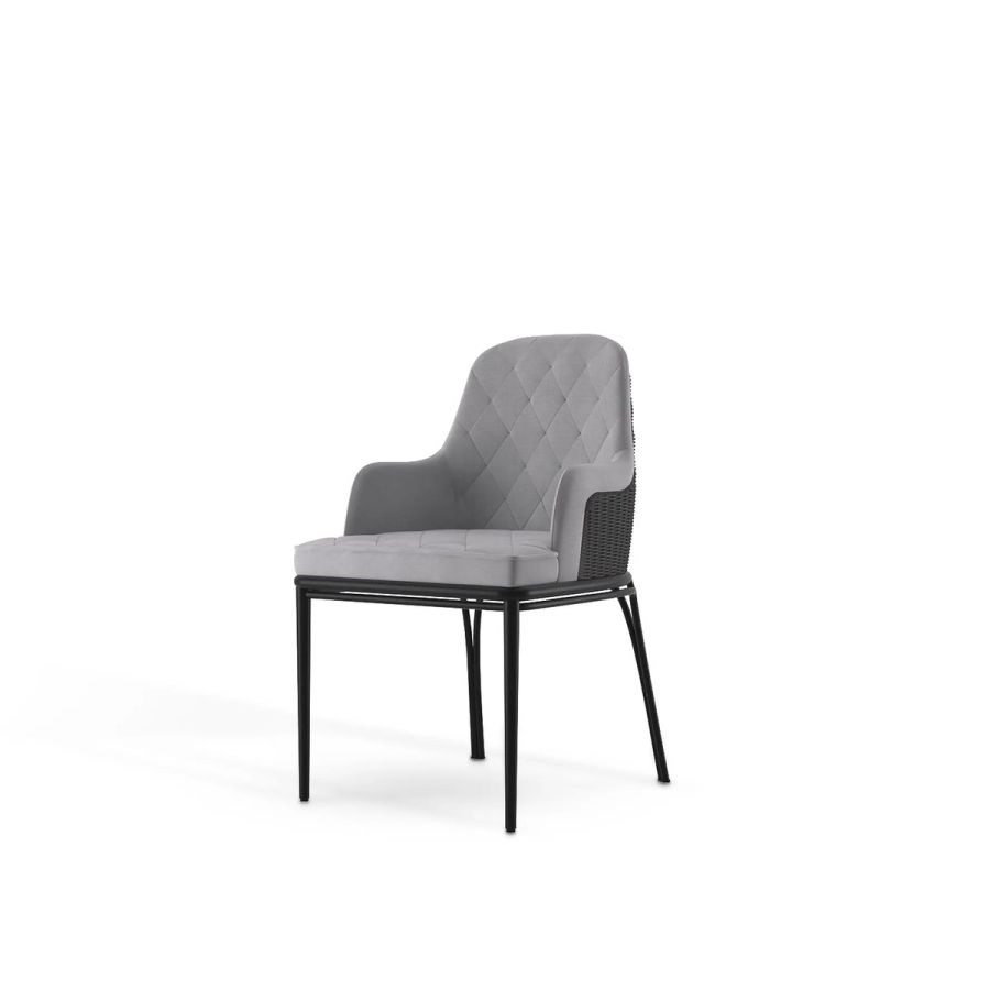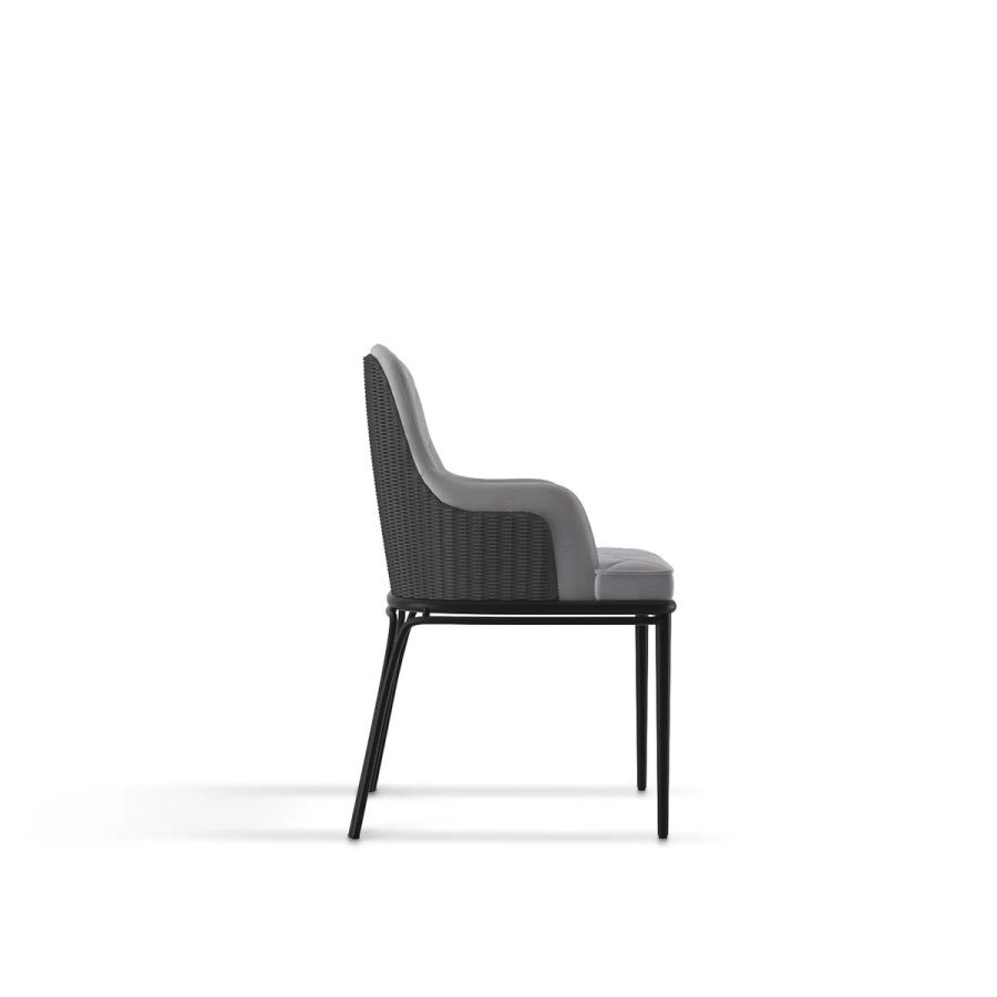 The outdoor Charla Grey Dining Chair is a splendid object of boundless elegance. This marvelous design is the perfect example of timeless lines with a modern twist, made with the complexity of luxurious and resistant materials such as carbon powder coating, polyrope anthracite, and silver fabric, perfect for a relaxed yet luxurious outdoor setting.