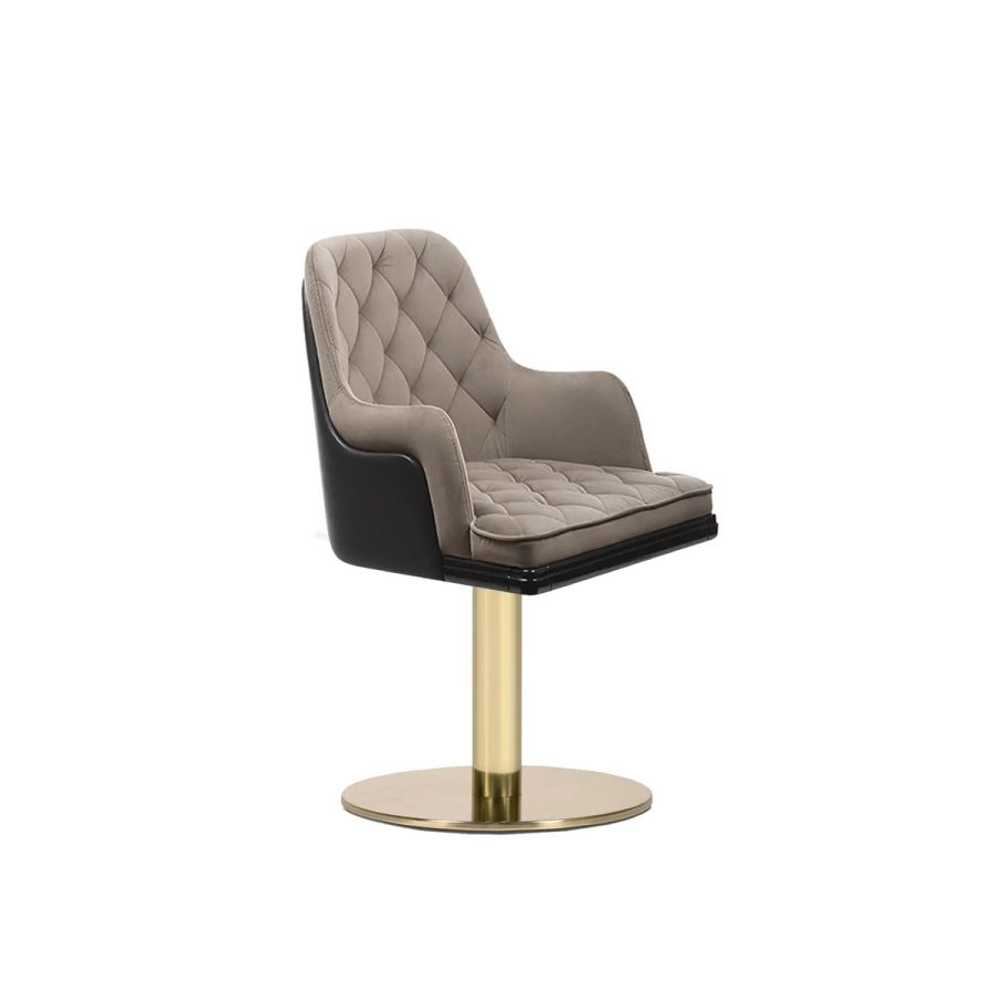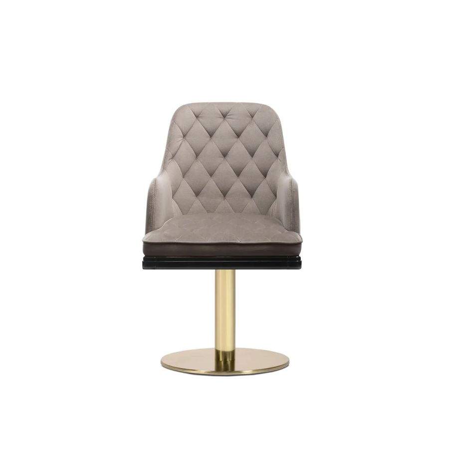 Made with brass, leather, wood, and a soft velvet seat, the Charla Swivel Dining Chair is a luxurious upholstery solution that offers an exclusive style and remarkable comfort in any dining room set. With its timeless charm, boundless elegance, and convenient swivel feature, this chair is the perfect choice for creating a lavish dining room ambiance.