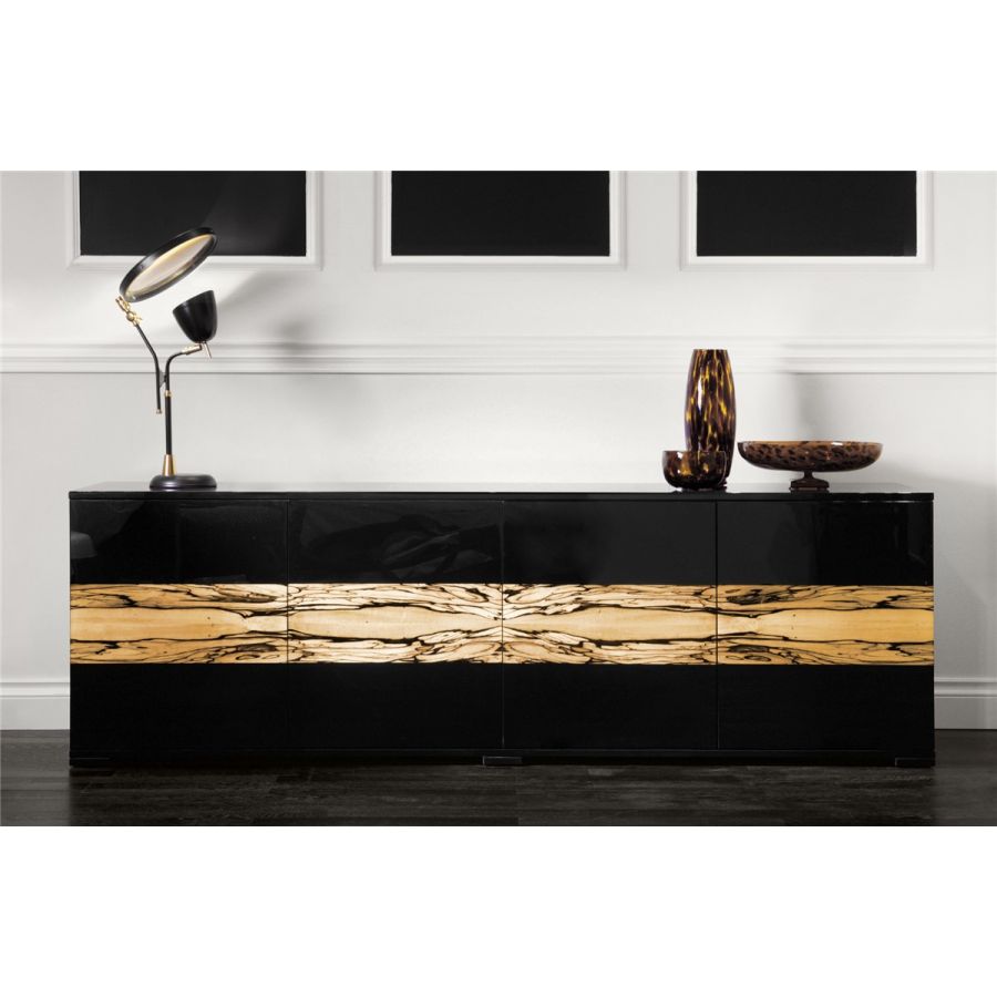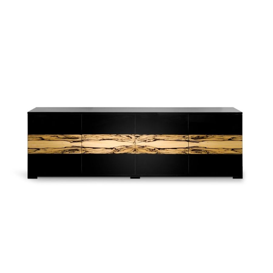 Funktionell och tidlös ger Philippe Medio en dyrbar, förfinad och modern prägel åt ett vardagsrum, ett matrum eller en stor entré. Utrustad med fyra dörrar som öppnar mot fyra inre fack, var och ett separerat av en hylla, utmärker sig skåpet genom frontdörrarna, där den svarta finishen livas upp av ett horisontellt centralt inslag i blankt albinträ. Interiörerna är högblank svartlackerade.