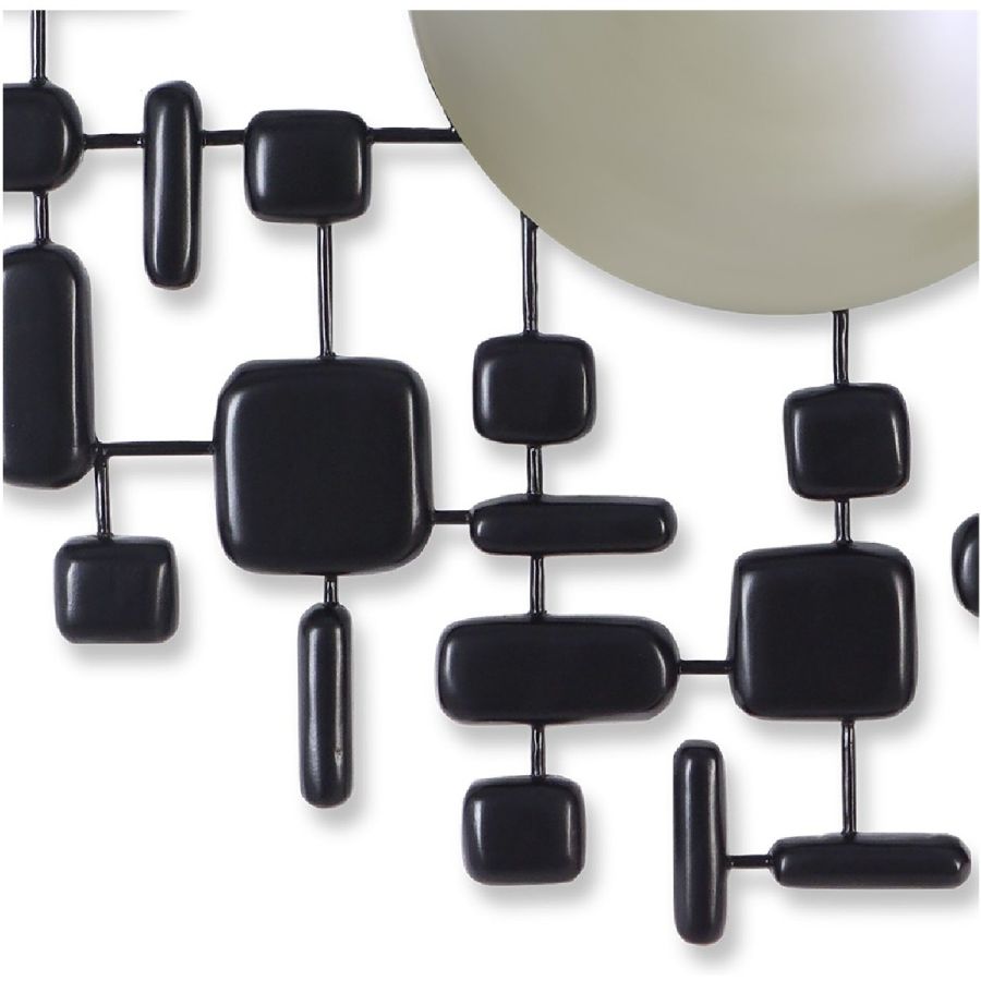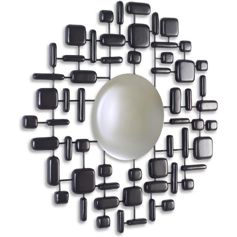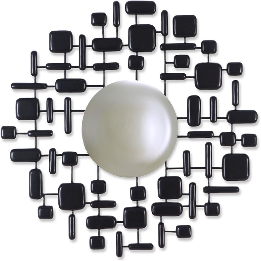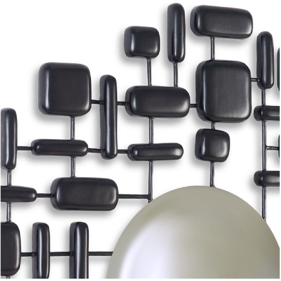 With a central convex mirror pane surrounded by myriad graphic shapes inspired by the early days of computer symbols connected with a metal grid, this contemporary styled piece is a unique and fascinating statement piece.