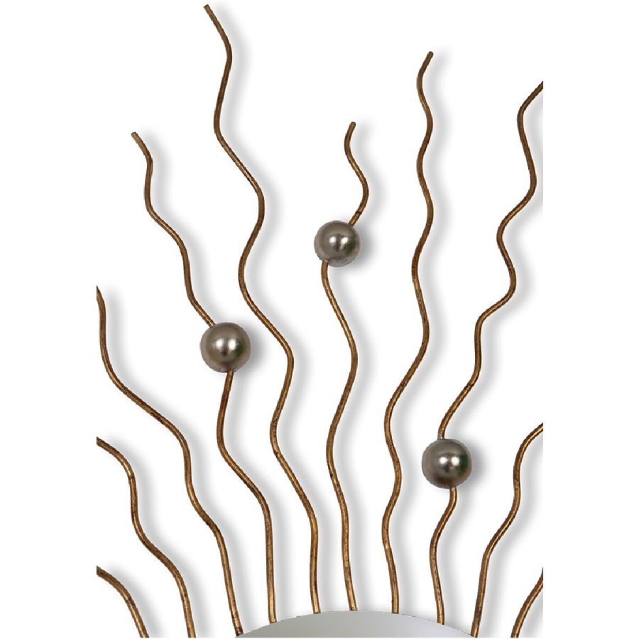Shimmering rays of metal, dotted with hand carved round wooden beads, radiate from a central mirror pane in this absolutely spectacular piece. As much a work of art as a functional mirror, Rayos will bring a sense of brightness and light into any interior setting.