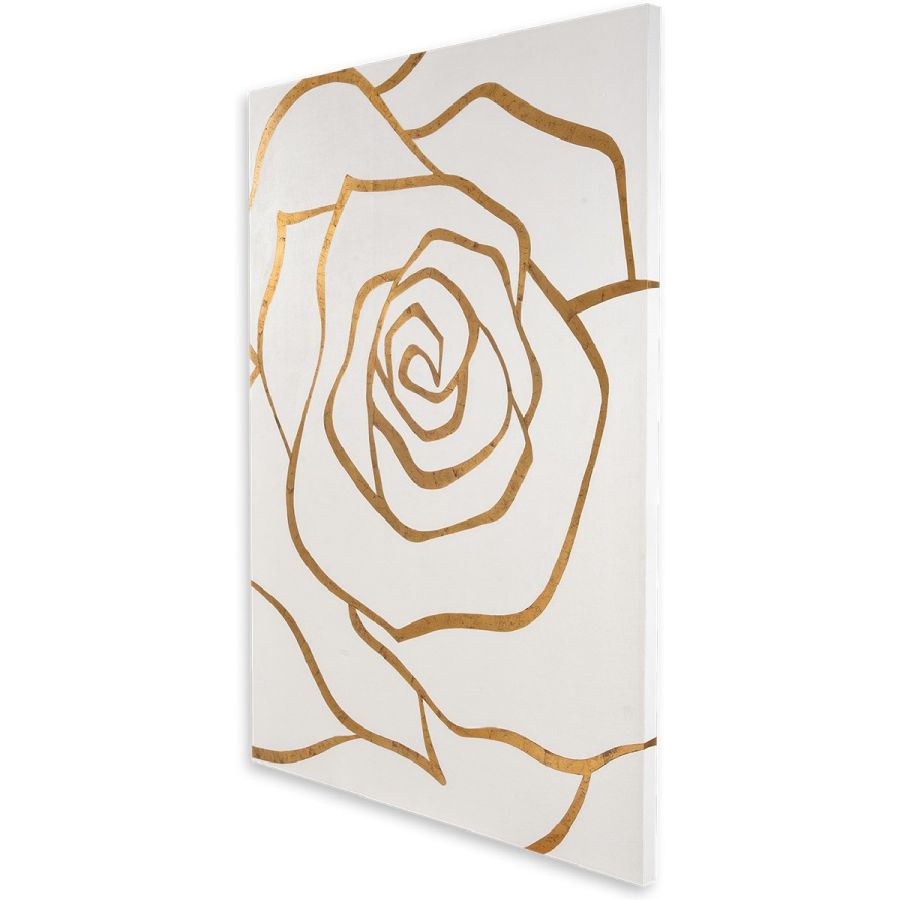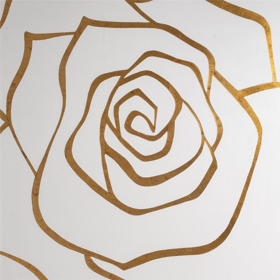 Stunning in its simplicity, and a beautiful addition to any interior, this stylized rose wall art piece is created with gold intarsia expertly handcarved into wood with a french white finish.