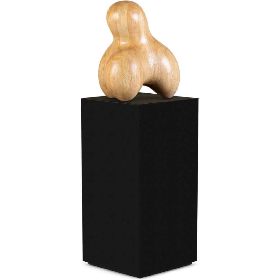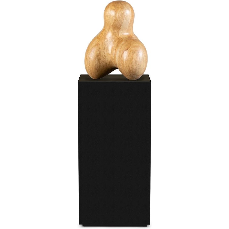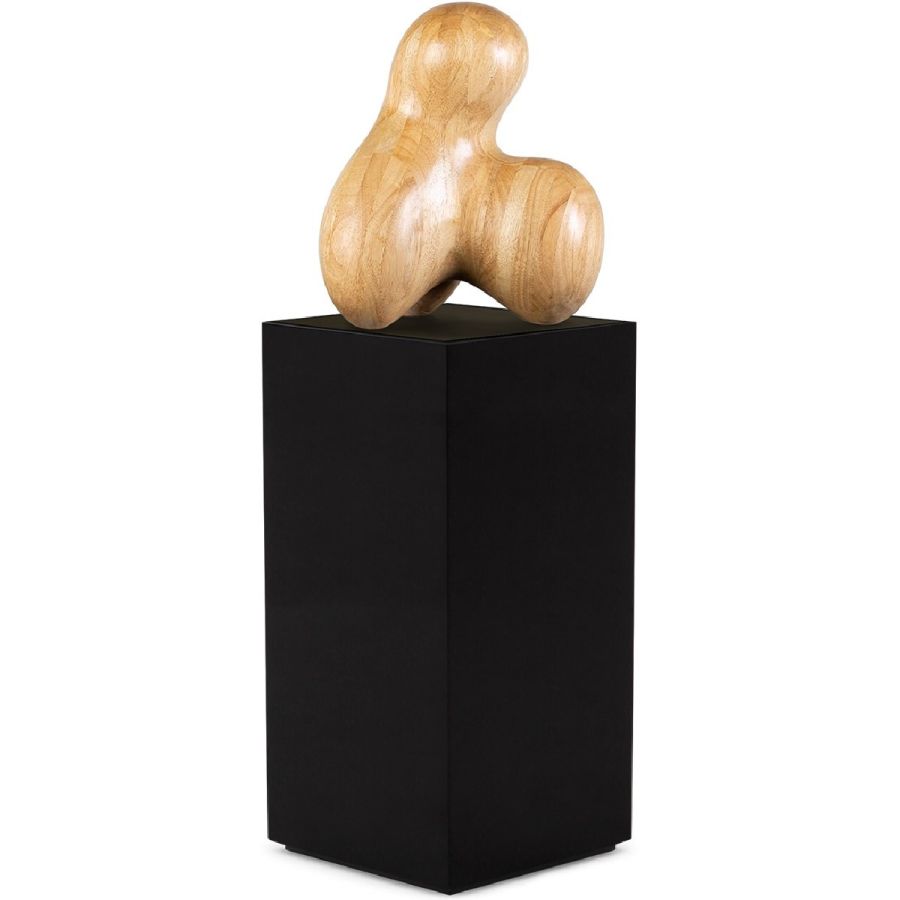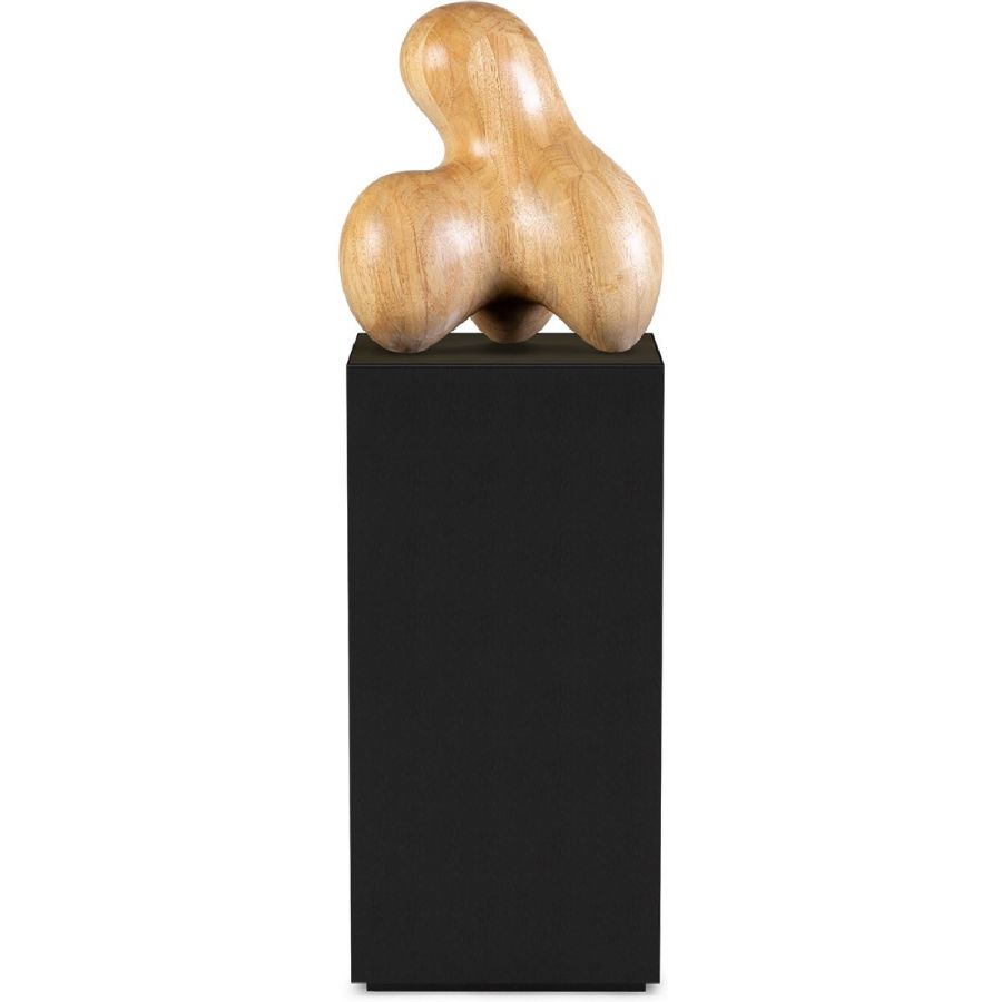A beautifully handcrafted abstract natural wood sculpture displayed on an elegant black wood pedestal.